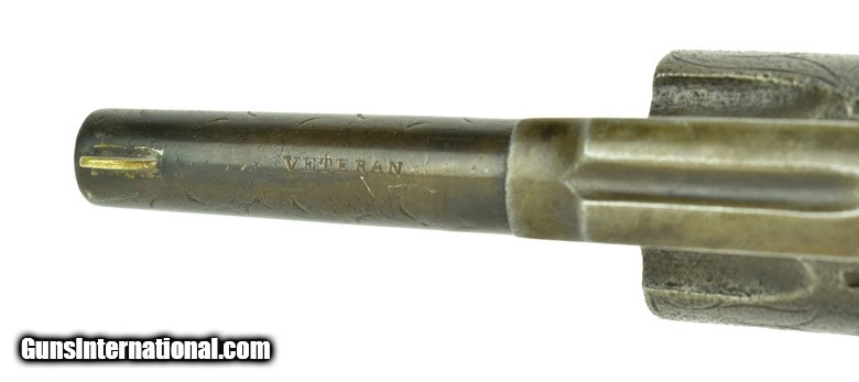 Description: Norwich Pistol Company “Veteran” Revolver. .32 Rimfire caliber with a 2 ½” barrel. Metal has a dark gray patina with some pitting. Pearl grips are very fine.