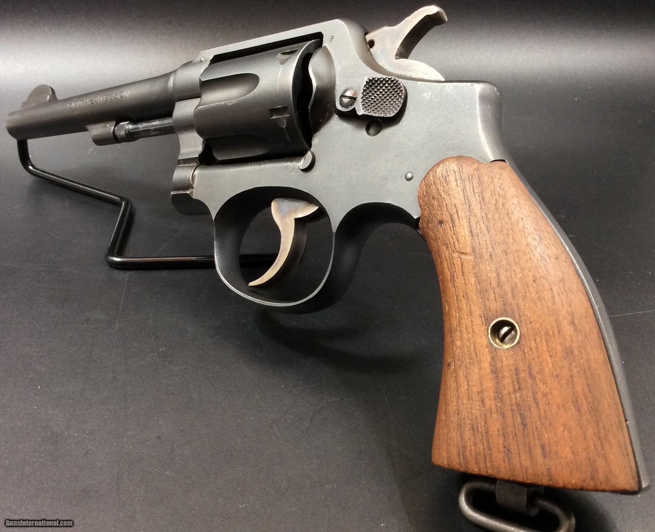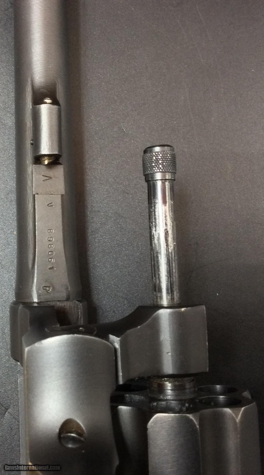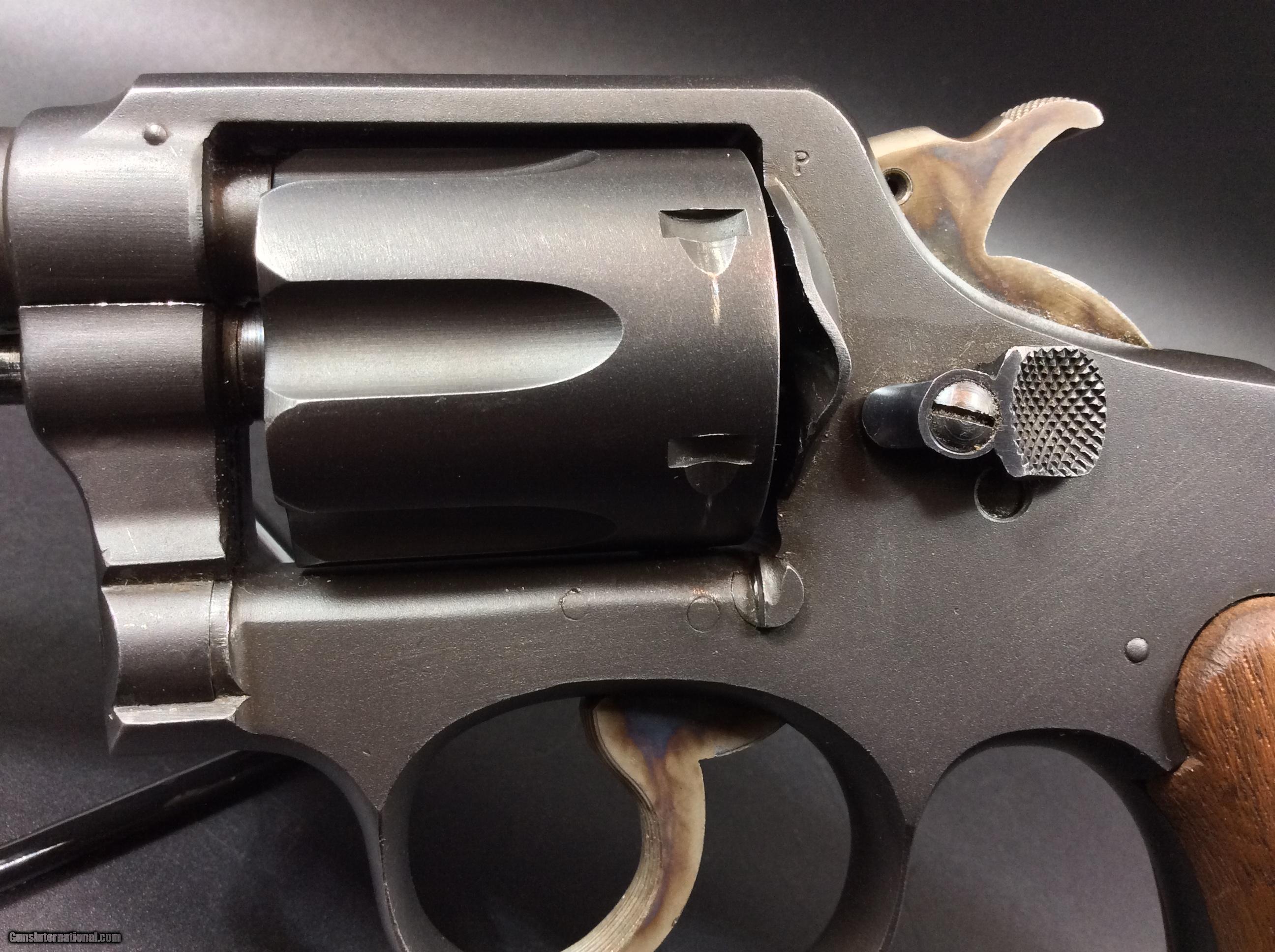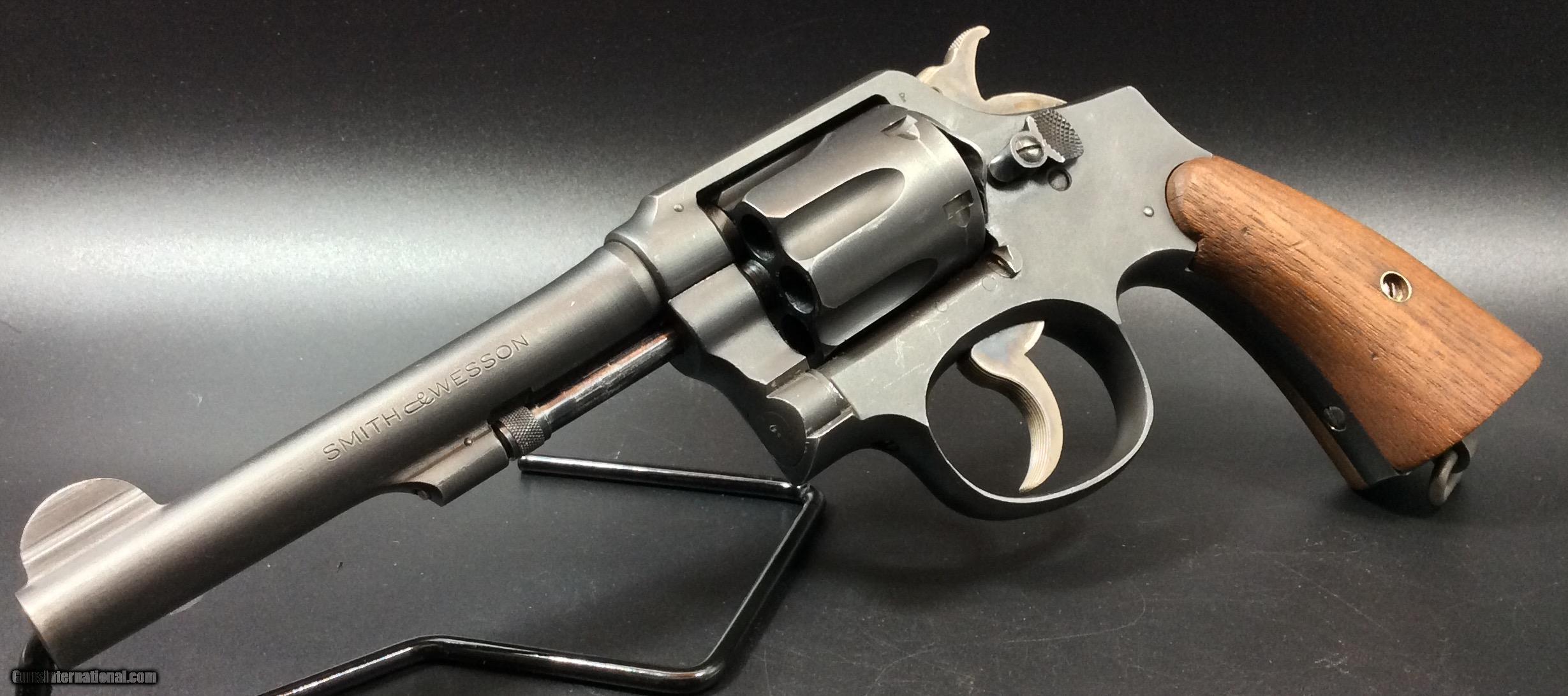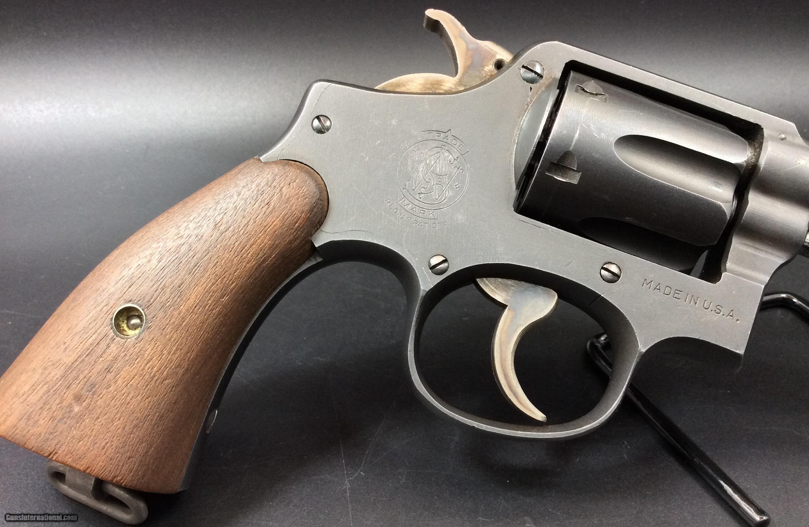 Description: Smith and Wesson .38 M&P “Victory” Model. Double action Revolver built on the square-butt K frame with five screws. V place in the serial prefix for “victory” against the axis powers in WWII. 5” barrel with good bore, six shot fluted cylinder. Pre-Safety fix, not marked with "S" but does have multiple “P” proof marks on the cylinder, behind the recoil guard and on the barrel. Serial number marked “V 898061”. Not marked with “U.S. Property”, possibly made by the Defense Supply Corporation and civilian user sold i.e. post office, defense plants, police, ect. Parkerized finish is in fantastic shape, overall great shape for its age. SOLD |
