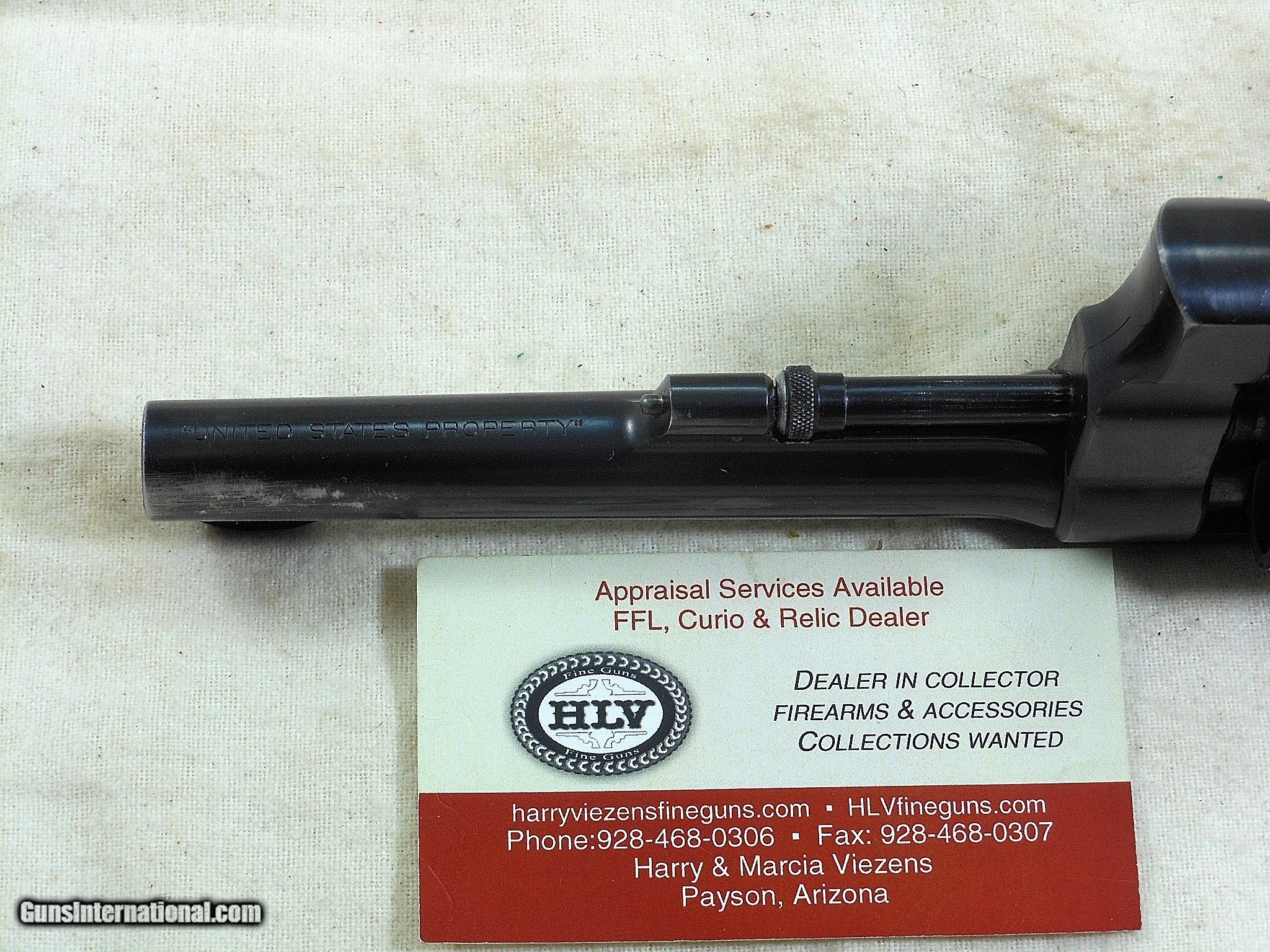 Description: SOLD This Smith & Wesson was produced around 1918. The pistol's serial number is 64081. The original holster is made by Grafton and Knight and is dated 1917. This pistol is all matched serial numbered. The original grips are also original to this pistol. The barrel is the correct military 5 1/2 inch barrel chambered for the 45 A.C.P. cartridge in half moon clips. The barrel is marked United States Property on the underside. The bore and chambers are in fine condition. The action works smoothly with no issues. The trigger and hammer have vivid color cased finish. The color cased finish would rate a 96% overall. The original grips are in fine condition with the original finish intact. The original bluing is very strong and bright. The bluing would rate a 96% overall condition. This is a very fine original condition as issued Smith & Wesson military revolver! The holster is in very fine original condition. There is no damage or loose stiching. The leather is supple and fully serviceable. This is a fine as issued pistol with the original holster. This would be a wonderful addition to any military or Smith & Wesson collection! Curio&Relic BBKE (11) F. No. 633 -22 SOLD Curio/Relic: Yes Handgun Caliber: .45 ACP (.45 Auto), .45 Auto Rim Manufacturer: Smith & Wesson Model: 1917 Serial Number: 64081 Barrel Length: 5 1/2 Inch Chambers: Very Good Condition: 96% Overall Metal Condition: Very Fine Wood Condition: Very Fine Bore Condition: Very Good Barrels: Pistol Barrel Type: Military Action: Double Action Finish: Blued Color Cased Sights: Standard Manufacture Date: 1918 Extras: Holster |