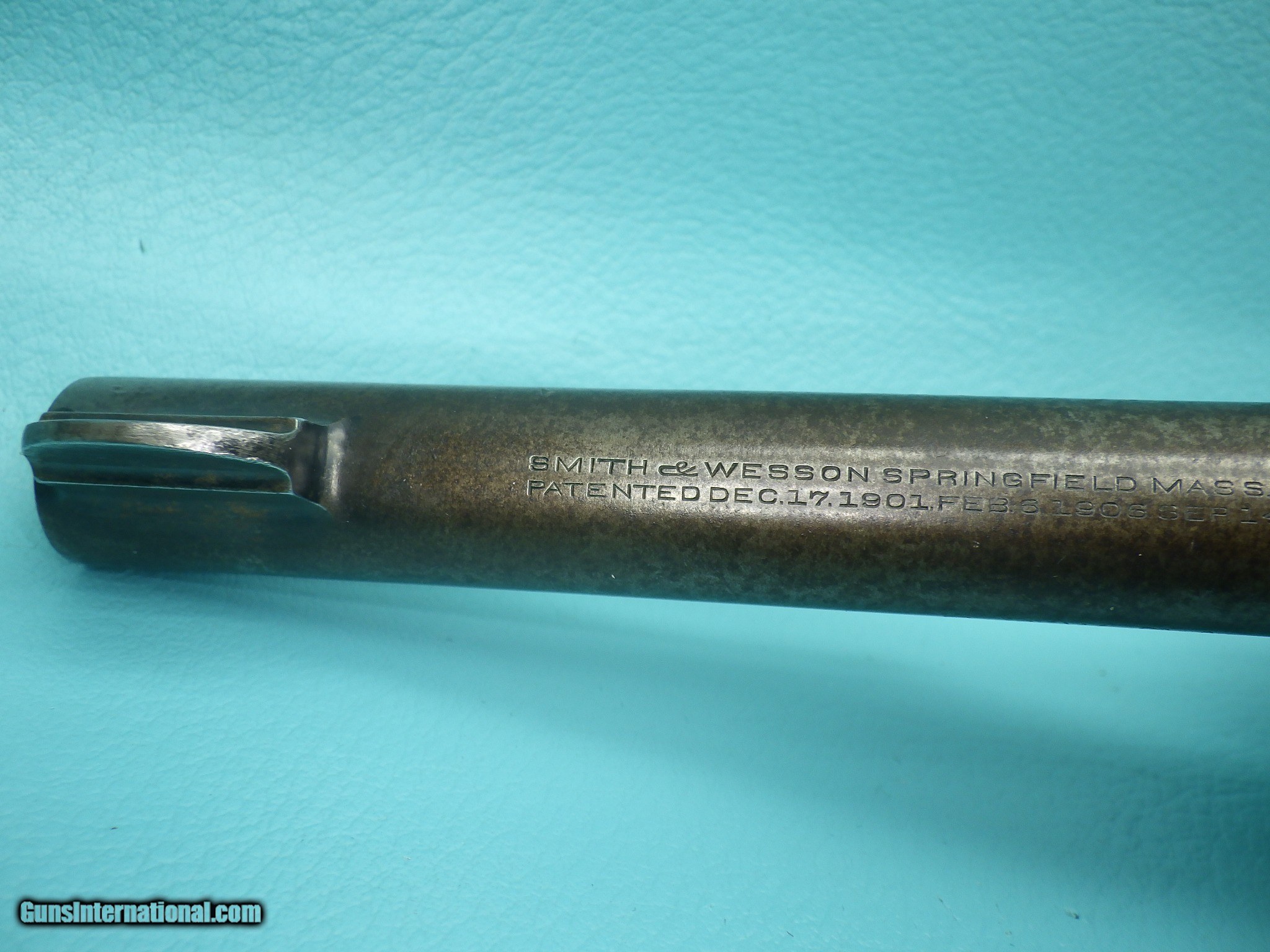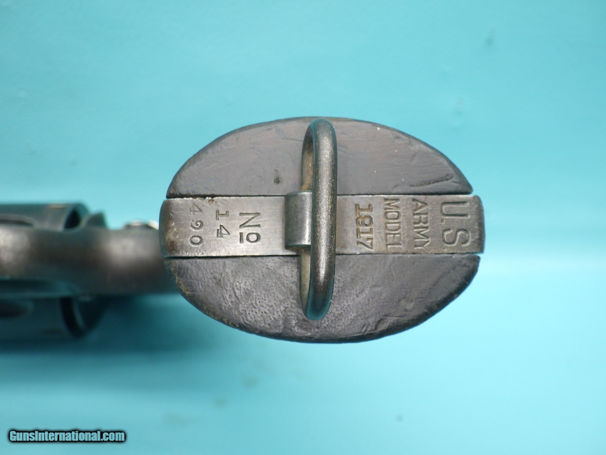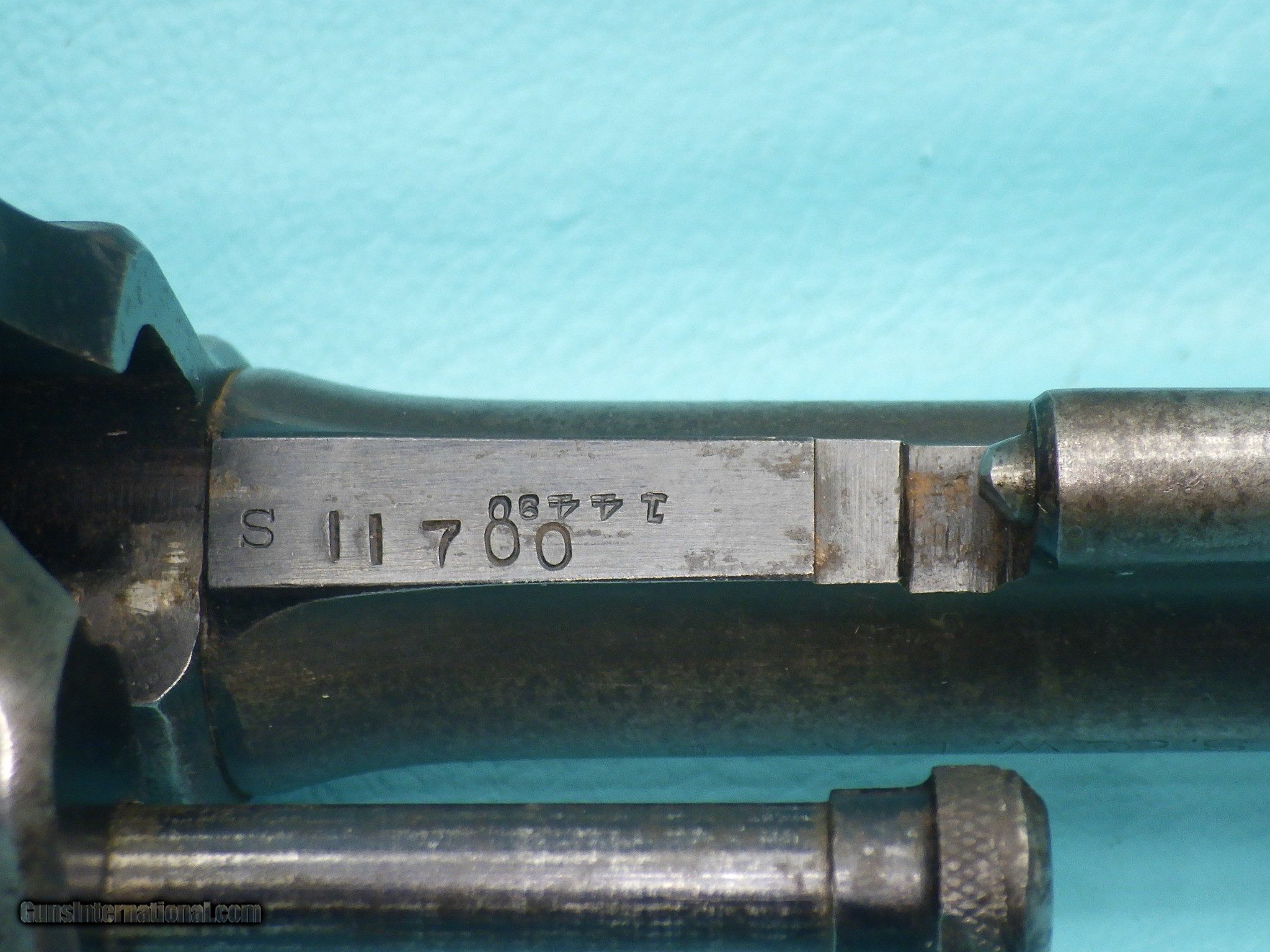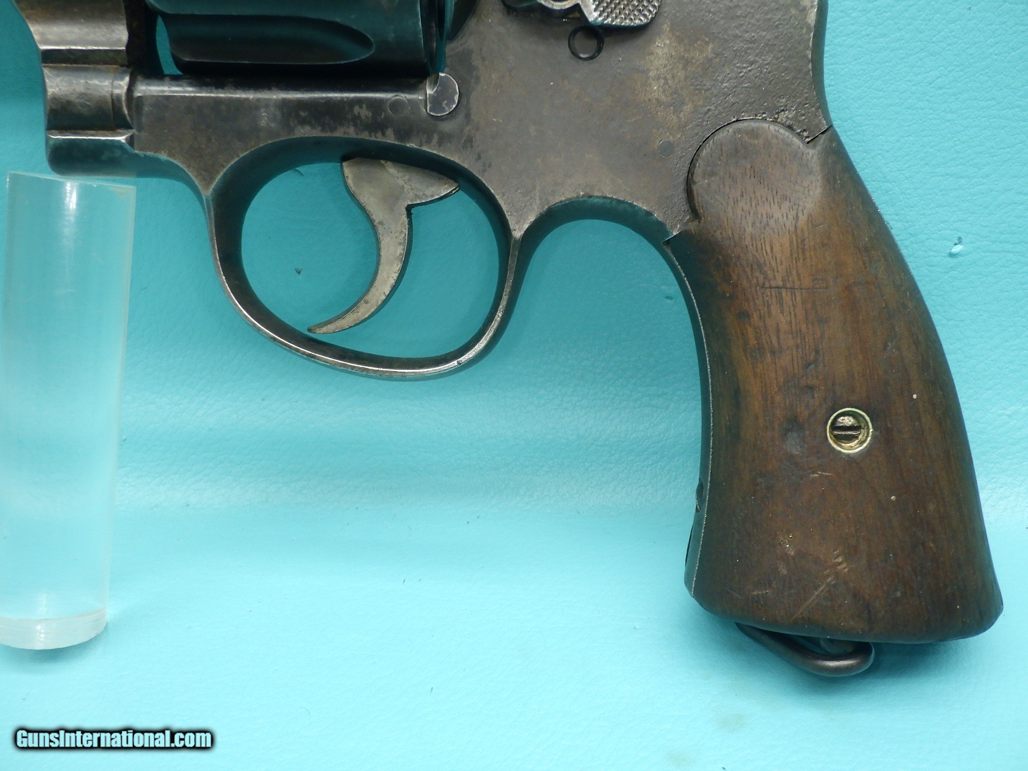 Description: **SOLD** Make: Smith and Wesson Model: US Army 1917 Finish: Blued Caliber: .45acp & 45 Autorim Action: Double Barrel length: 5 1/2 inch Bore: Shiny with very minor fouling and sharp rifling Stocks: Plain Walnut Sights: Round blade front with rear notch MFG Date: 1918 Features: Concentric grooved hammer (which only came on early models) ,US Property marking, heat treated & fluted 6 shot cylinder, lanyard ring, S stamp on the barrel flat & on the frame, square butt N frame, and a faint GHS ( Major Gilbert H. Stewart) marking. Extras: None (Does not include half moon clip) Condition: The finish shows signs of age related loss as well as oxidation which is heavier on the left side of the frame. Shipping Cost: $35.00 The revolver functions as it should with proper timing and lockup. The cylinder chambers are smooth with one having a small amount of fouling. Please refer to the photos for the overall condition. FFL is required. No handgun sales in MA. **SOLD** SOLD Handgun Caliber: .45 ACP (.45 Auto), .45 Auto Rim Manufacturer: Smith & Wesson Model: US 1917 Serial Number: 14490 |