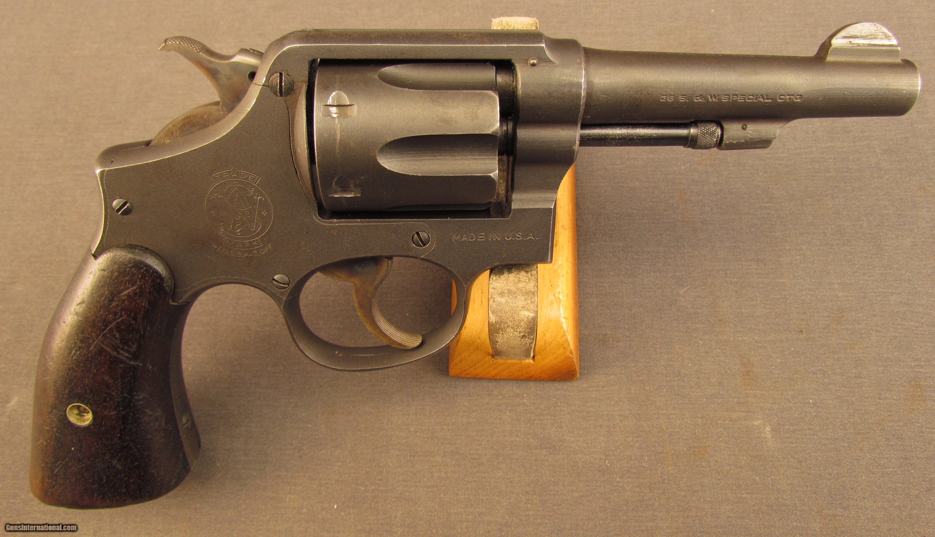 Description: Serial #V266700, .38 Special, 4” barrel with an excellent, bright bore. This revolver has matching numbers on the frame, cylinder, barrel, extractor, and yoke with the metal retaining 85-90% of the original phosphate finish that has mild fading on the sides of the barrel, along the exposed edges, and a light turn-ring on the cylinder. Scattered spots of light freckling and pinprick pitting are present on the barrel, frame, and cylinder. The topstrap was once marked with a U.S. Ordnance Dept. “flaming bomb”, and “US PROPERTY GHD” inspection stamp to the left of the sighting channel, but that was removed at some point leaving a pewter gray channel. Additionally, the front sight was lightly polished in order to increase visibility. The hammer and trigger have much of the original color case-hardening remaining, and the smooth walnut grips (numbered to a different gun on the interior) are in very good shape with some light finish loss and several minor handling marks and blemishes around the butt. This is a very nice World War II Victory Model in very good plus condition overall. FFL or C&R SOLD Curio/Relic: Yes Manufacturer: S&W Model: Victory Serial Number: V266700 Caliber Info: .38 Spl Gauge Info: .38 Spl |