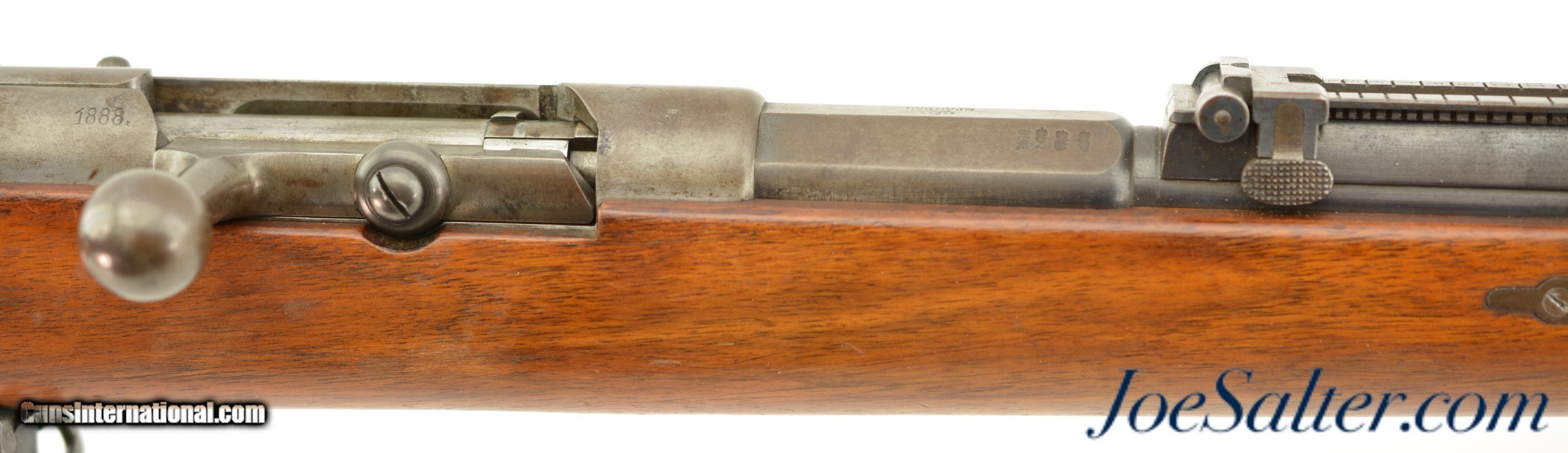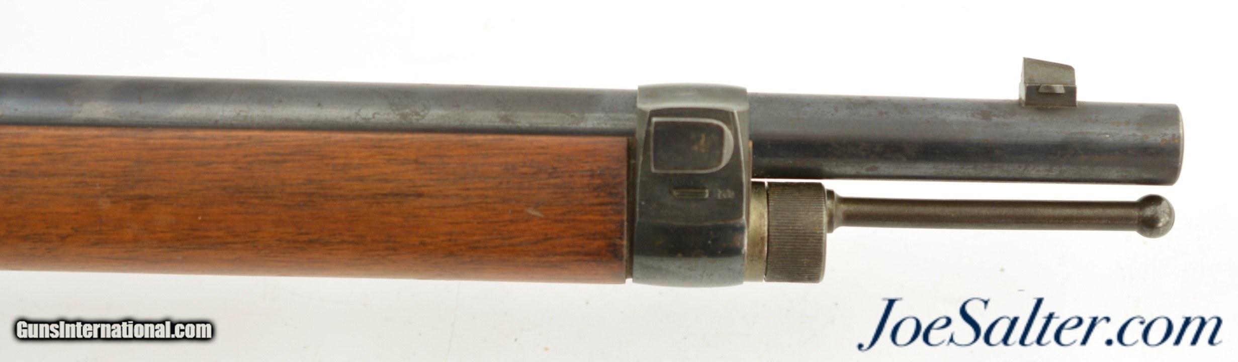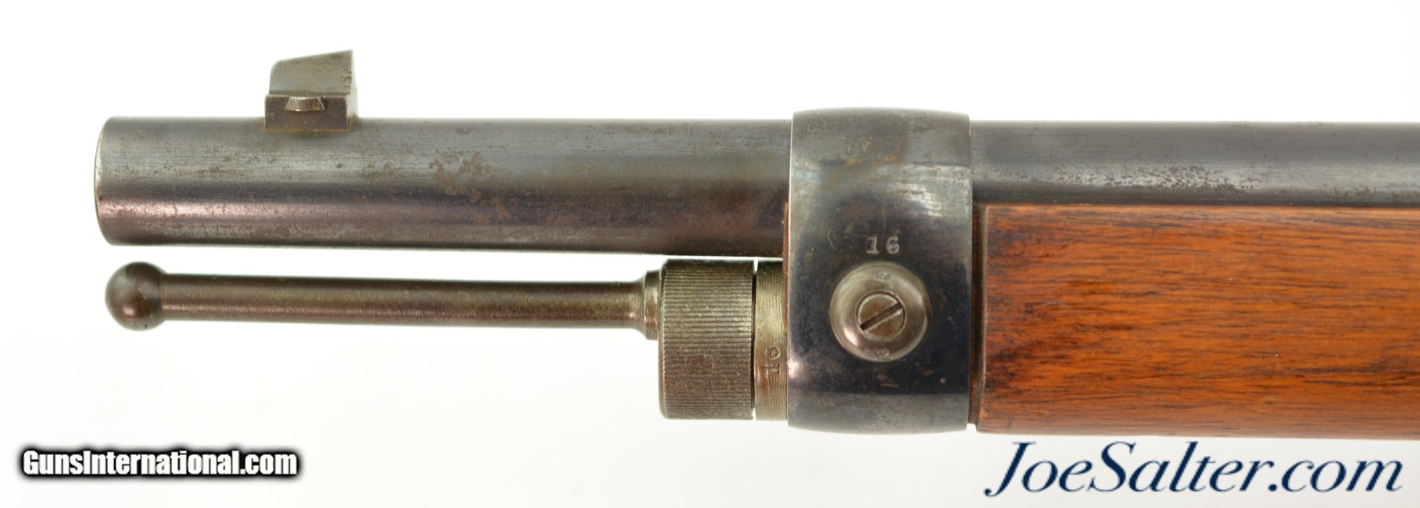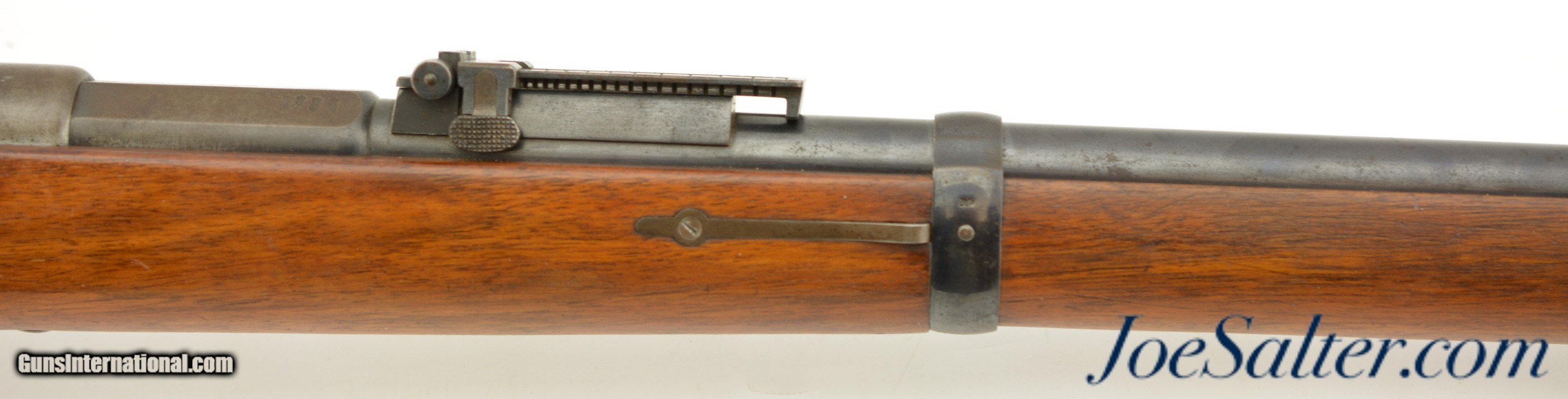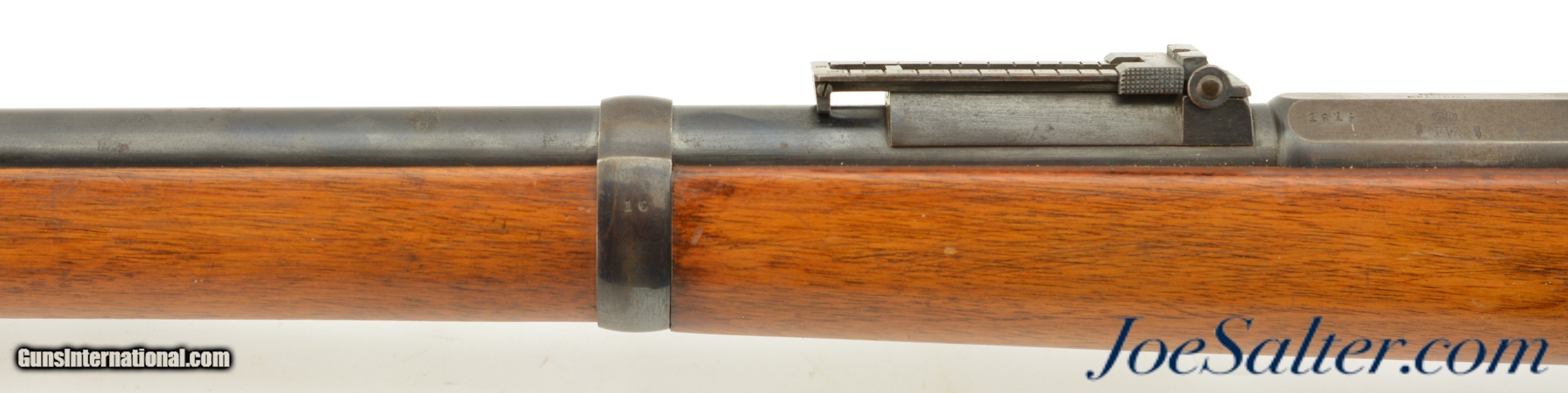 Description: Serial #1616, 11mm Mauser, 31" barrel with an excellent, bright bore. This is an 1888-dated, almost all matching numbered rifle (only the tubular magazine end cap is numbered to a different gun) that retains 92-95% of the original blue finish with some mild fading along a few of the high edges, and spots of very minor freckling along the barrel between the bands. The receiver and bolt have a mottled pewter gray patina with areas of plum-brown freckling scattered throughout. The walnut stock was arsenal refinished to fine condition with soft, but still visible stamps, and there are some scattered handling marks along the wood on either side. The barrel bands and trigger guard retain much of their original bright blue finish, while the buttplate has mottled to gray brown with freckling and pinprick pitting present throughout. This is a fine example of a Gew.71/84, and would make a splendid addition to any collection. Antique; Antique: Yes Price: $979.00 Contact Seller |