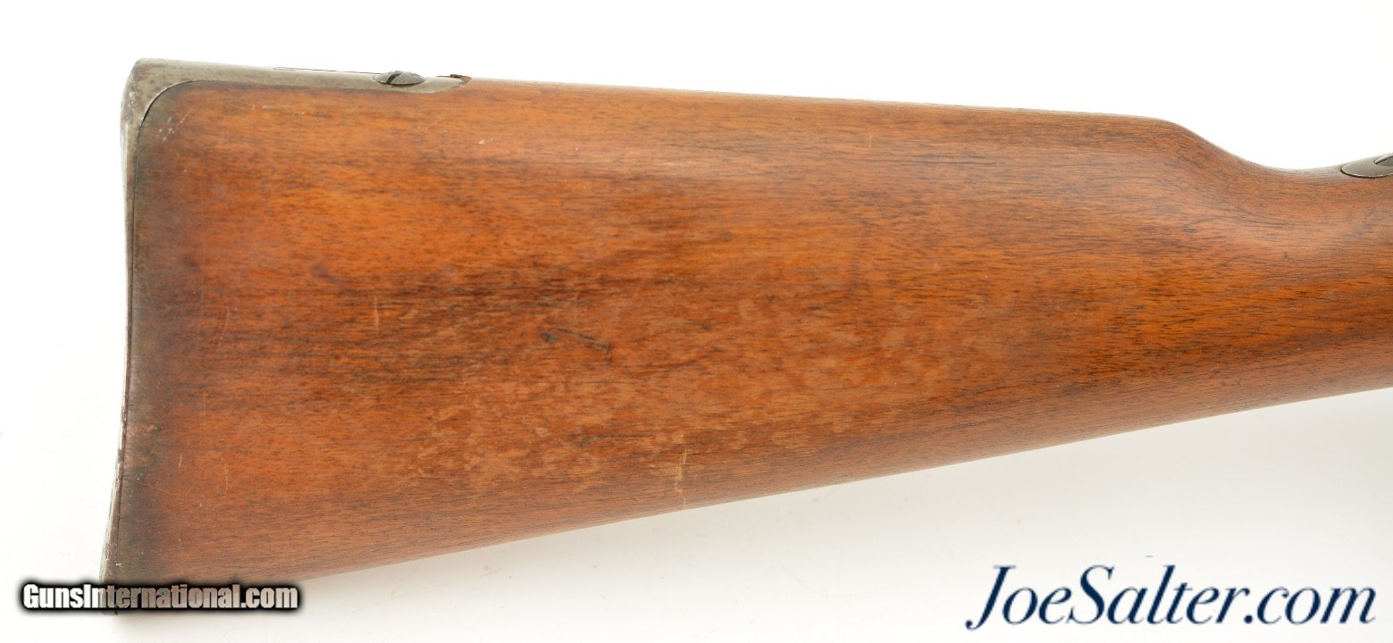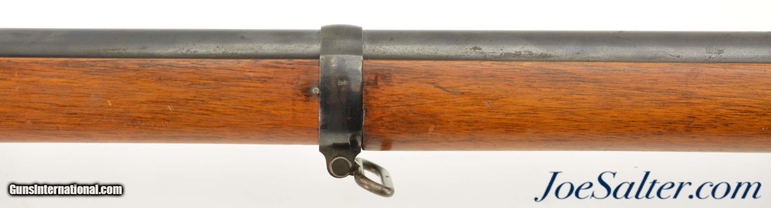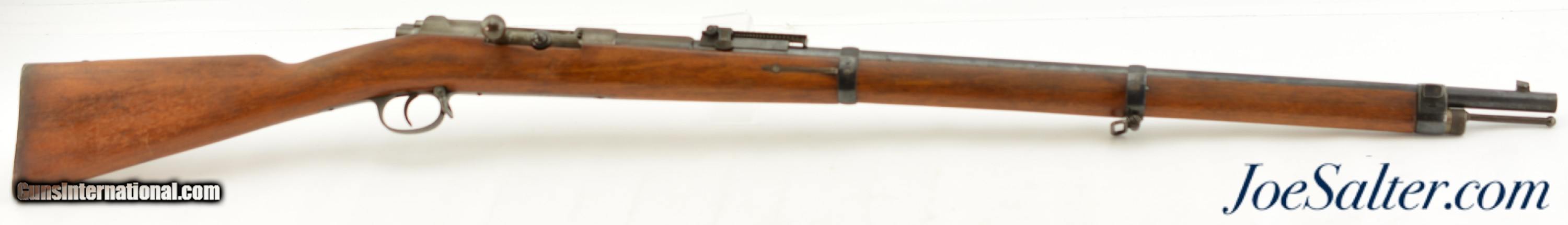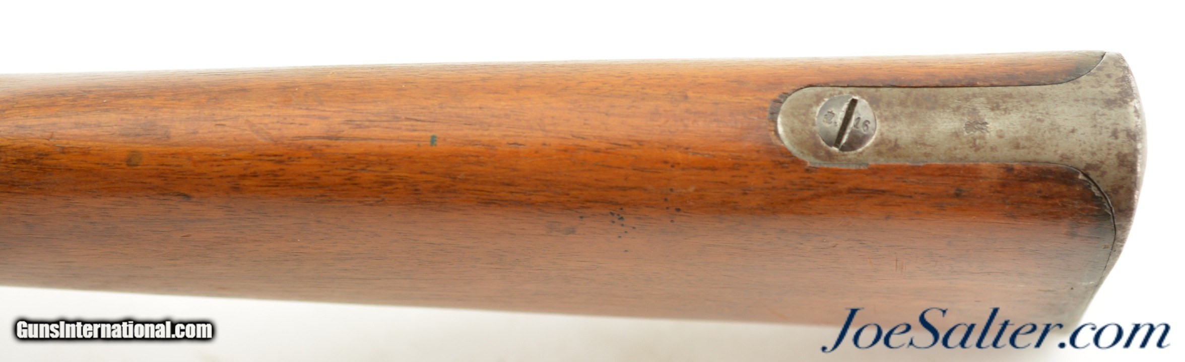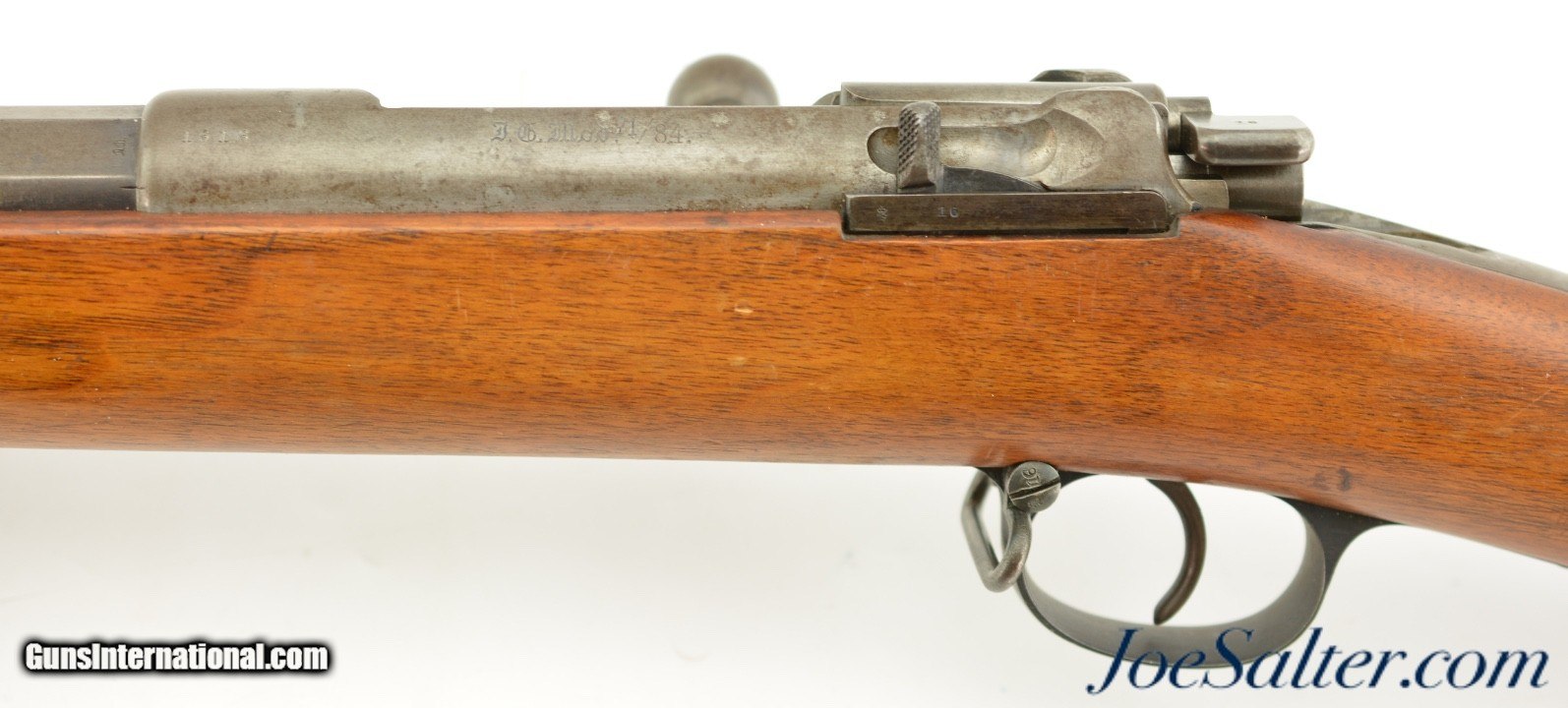 Description: Serial #1616, 11mm Mauser, 31" barrel with an excellent, bright bore. This is an 1888-dated, almost all matching numbered rifle (only the tubular magazine end cap is numbered to a different gun) that retains 92-95% of the original blue finish with some mild fading along a few of the high edges, and spots of very minor freckling along the barrel between the bands. The receiver and bolt have a mottled pewter gray patina with areas of plum-brown freckling scattered throughout. The walnut stock was arsenal refinished to fine condition with soft, but still visible stamps, and there are some scattered handling marks along the wood on either side. The barrel bands and trigger guard retain much of their original bright blue finish, while the buttplate has mottled to gray brown with freckling and pinprick pitting present throughout. This is a fine example of a Gew.71/84, and would make a splendid addition to any collection. Antique; Antique: Yes Price: $979.00 Contact Seller |