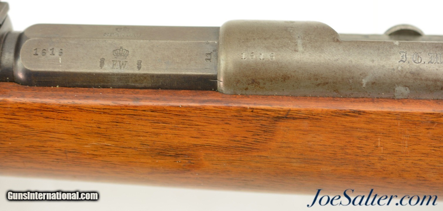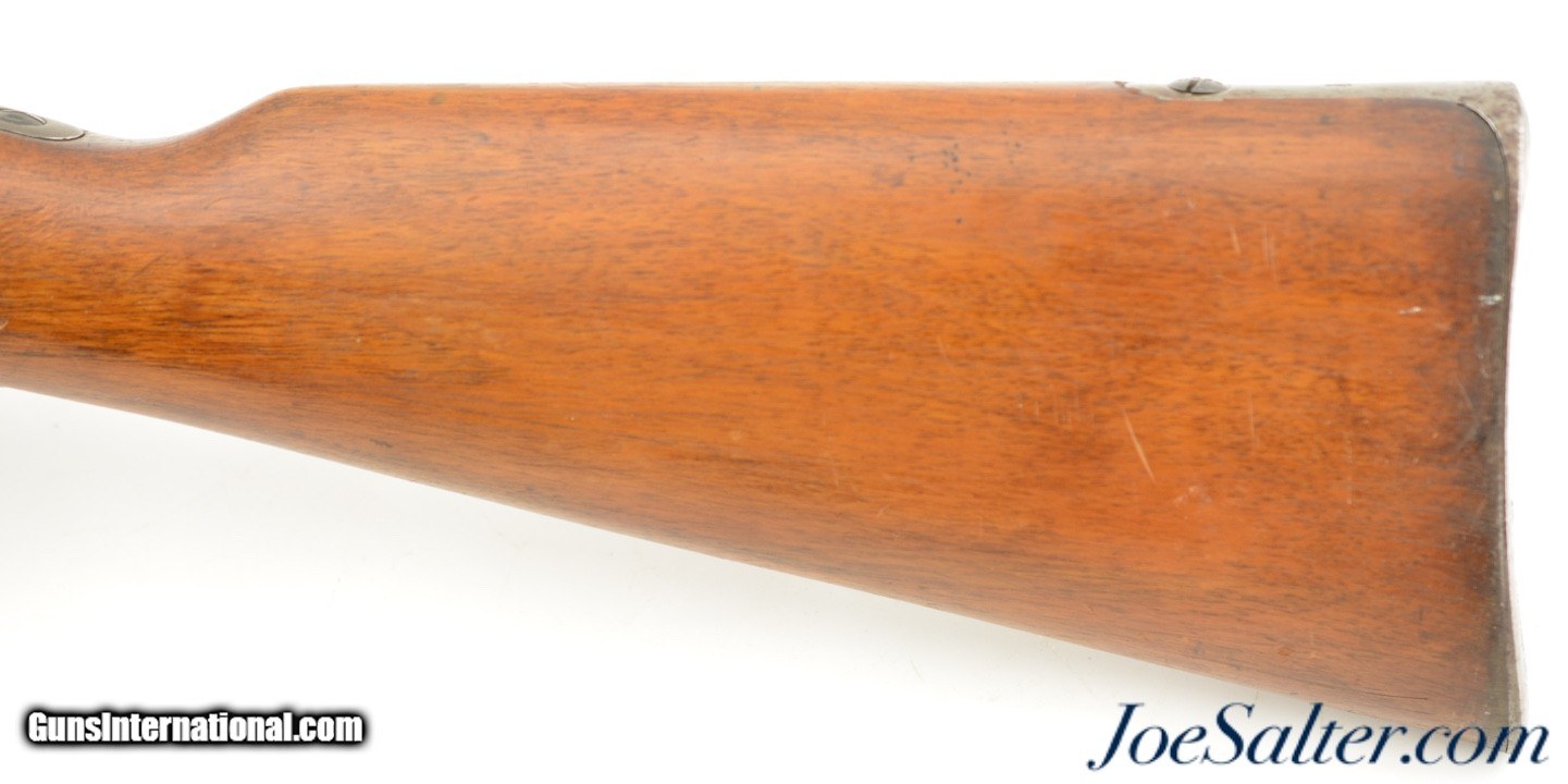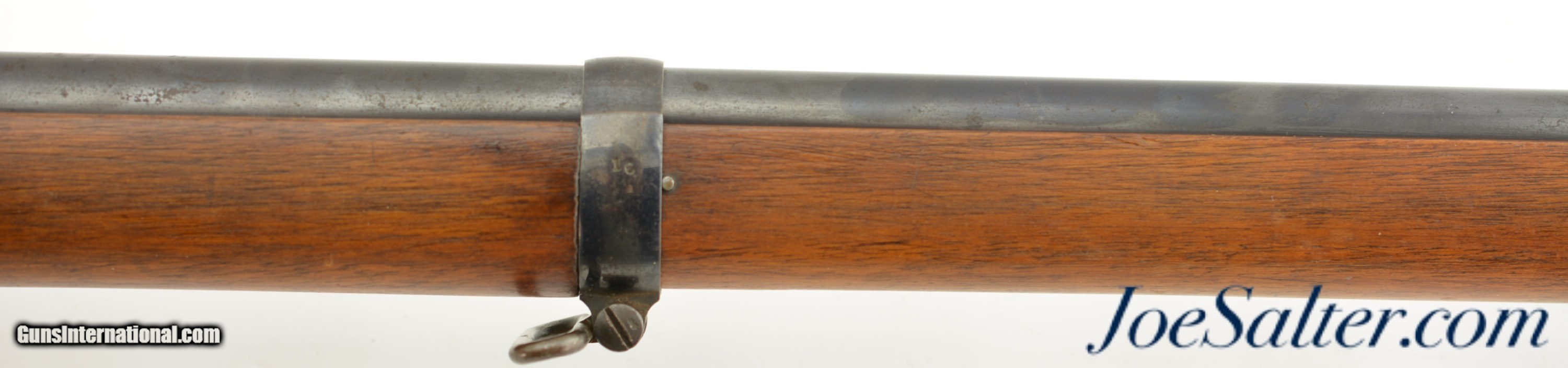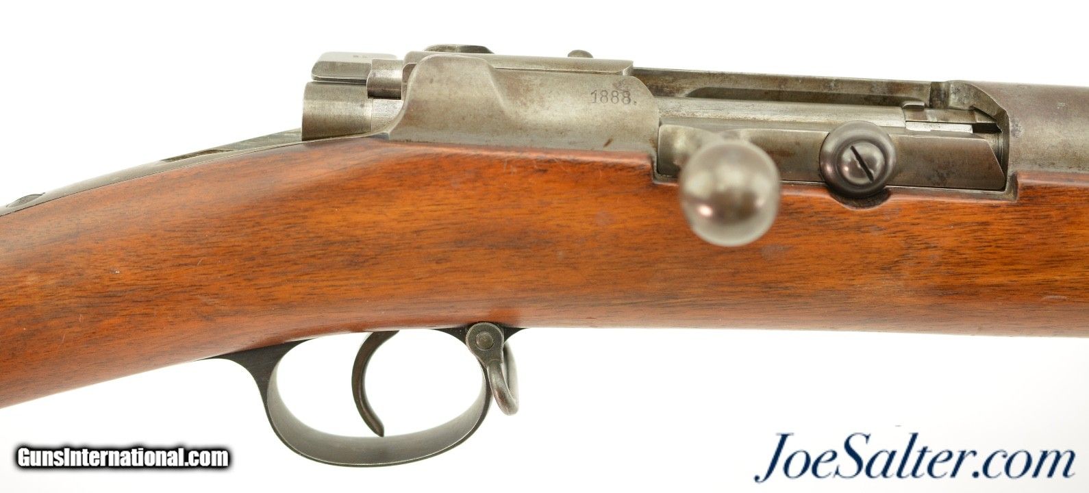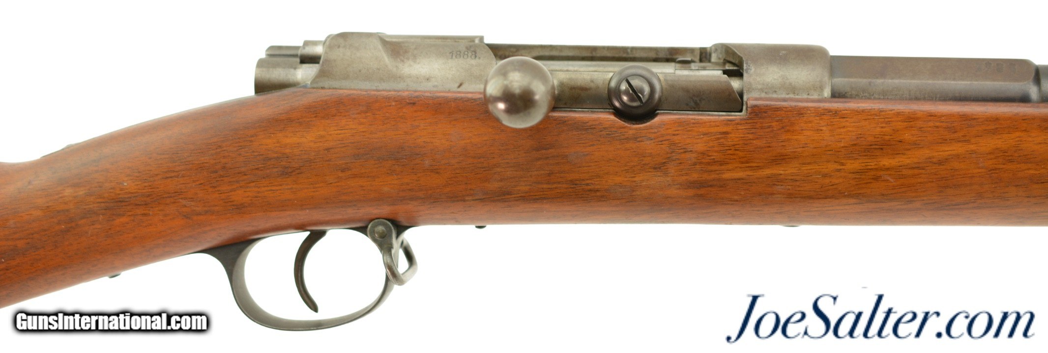 Description: Serial #1616, 11mm Mauser, 31" barrel with an excellent, bright bore. This is an 1888-dated, almost all matching numbered rifle (only the tubular magazine end cap is numbered to a different gun) that retains 92-95% of the original blue finish with some mild fading along a few of the high edges, and spots of very minor freckling along the barrel between the bands. The receiver and bolt have a mottled pewter gray patina with areas of plum-brown freckling scattered throughout. The walnut stock was arsenal refinished to fine condition with soft, but still visible stamps, and there are some scattered handling marks along the wood on either side. The barrel bands and trigger guard retain much of their original bright blue finish, while the buttplate has mottled to gray brown with freckling and pinprick pitting present throughout. This is a fine example of a Gew.71/84, and would make a splendid addition to any collection. Antique; Antique: Yes Price: $979.00 Contact Seller |