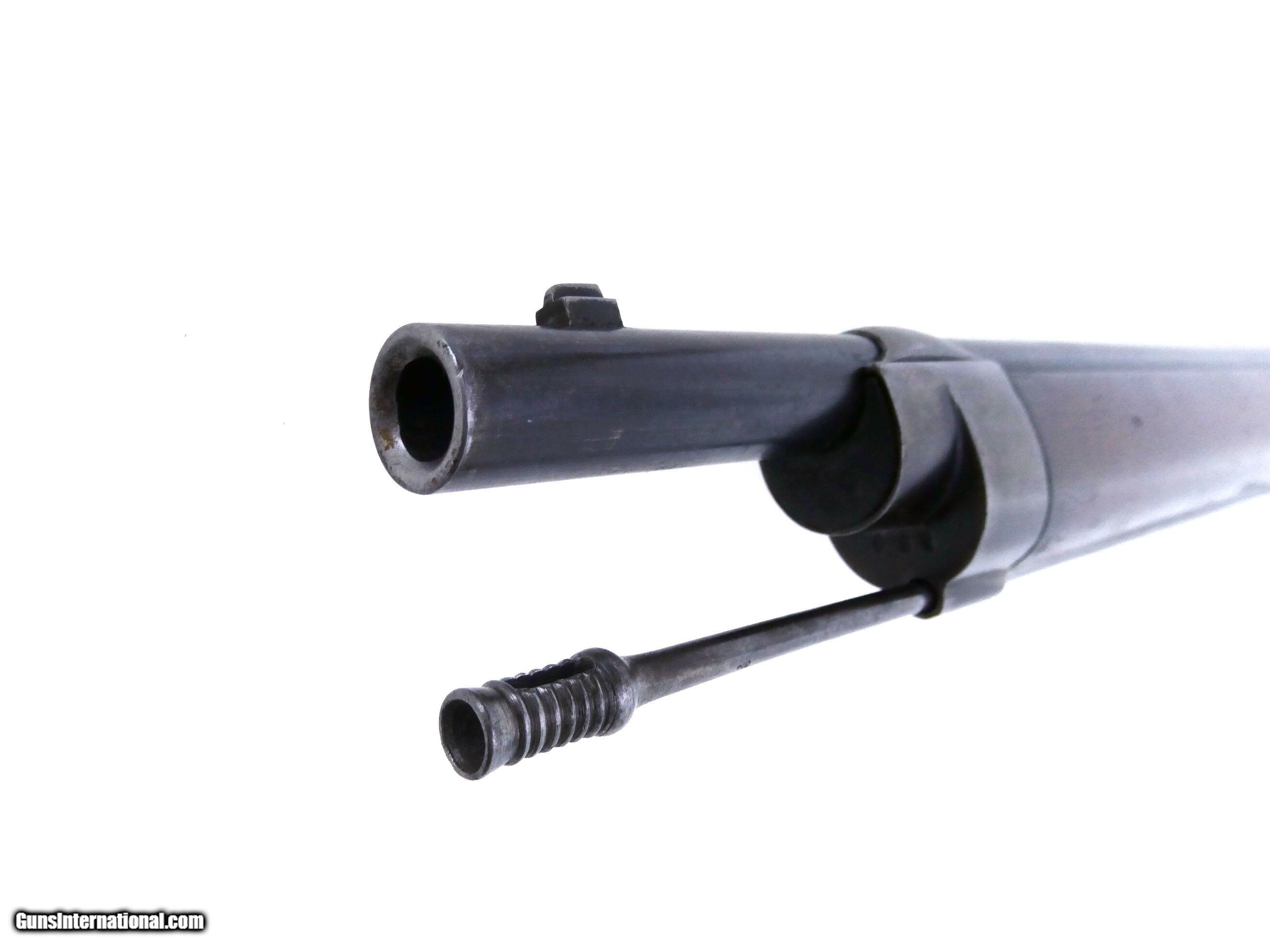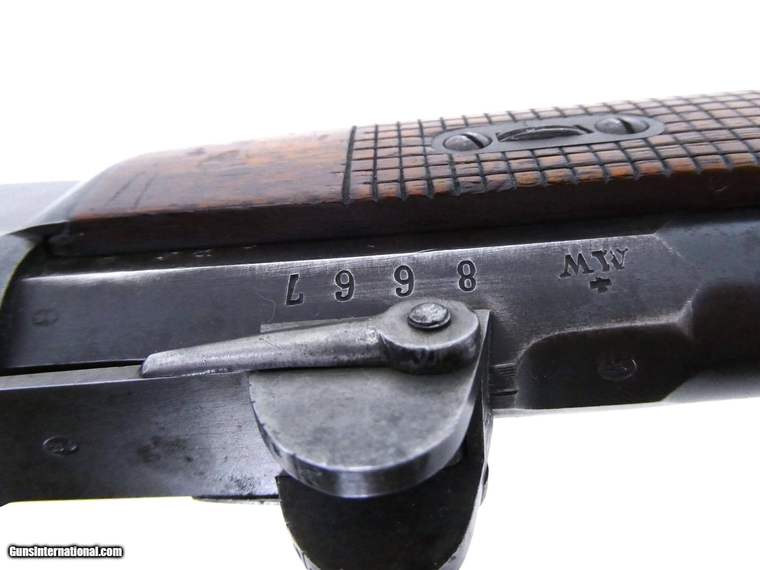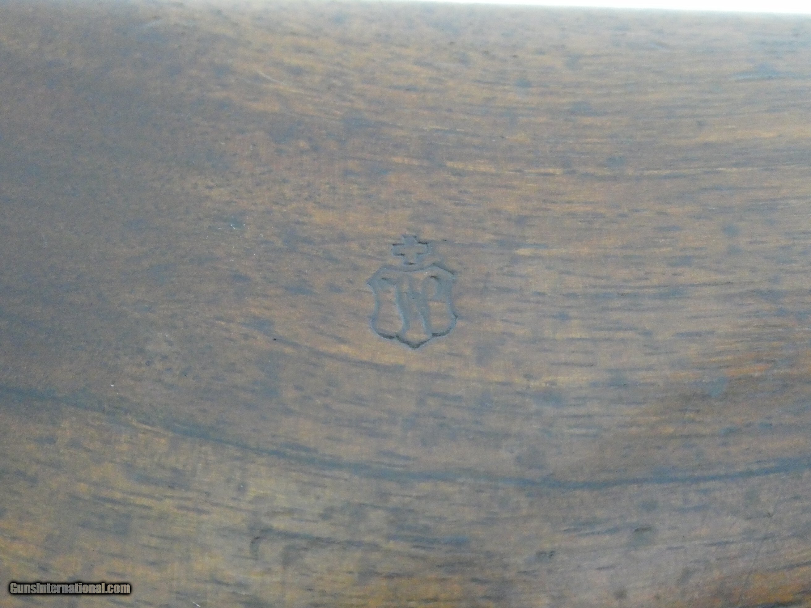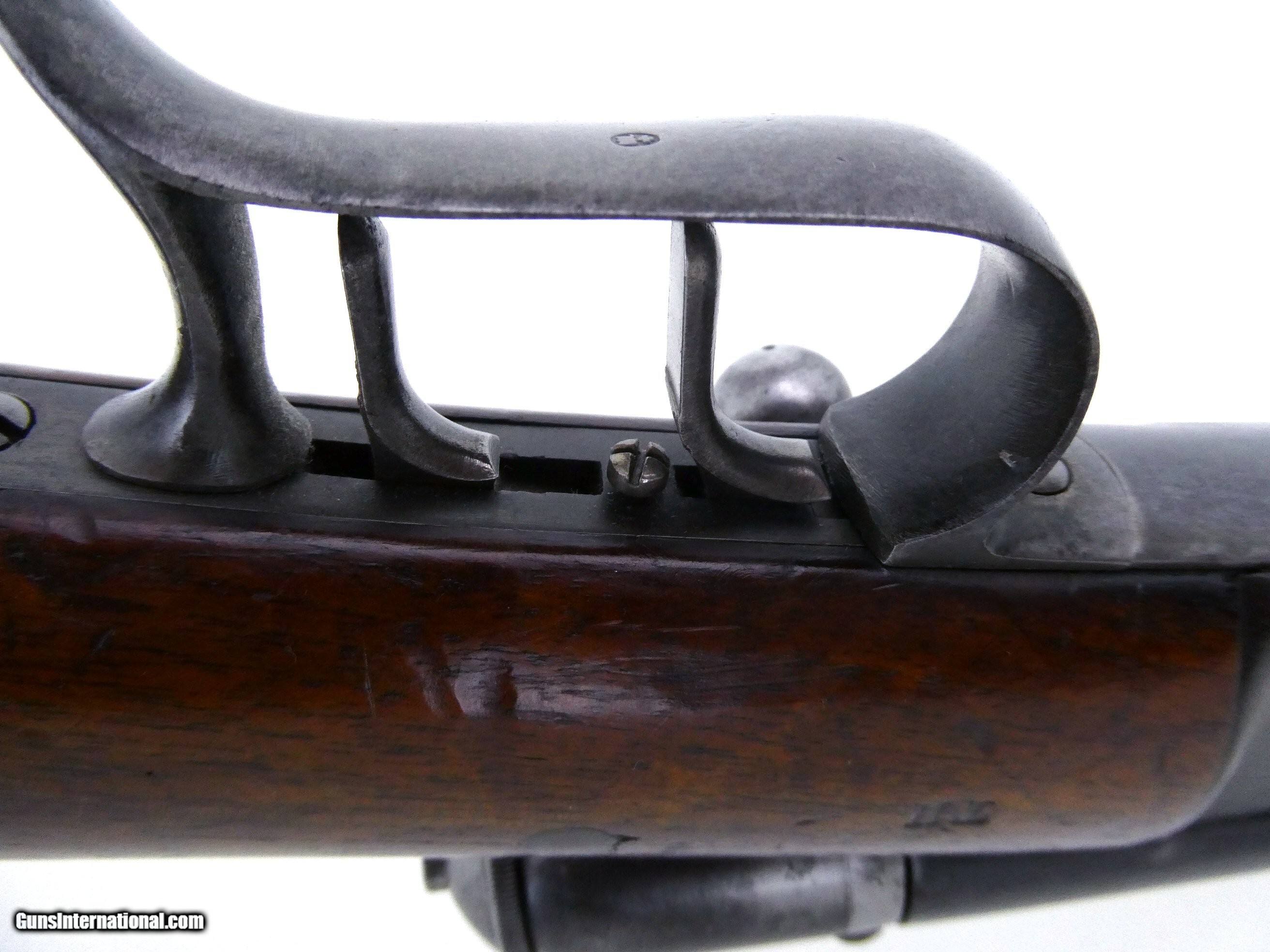 Description: Scarce Swiss Army Vetterli repeating rifle with 10 round tube magazine. Slightly shorter sharp shooter (Stutzer) version of the 1871 infantry rifle. Early production - pre 1873 as the receiver & barrel are stamped MW for Eidgenoessische Montierwekstatt Bern (Confederate assembly plant of Bern). Clear inspection marks on metal and wood, all matching serial numbers, double set trigger, Swiss butt, correct cleaning rod. OAL=50.4", LOP=12.4", barrel=30.1". Good action & trigger, excellent bore, originally chambered for the M63 10.4x38R rim fire cartridge, now converted to center fire by the Swiss master gunsmith Roger Rerat of Laufen. CF brass can be made from 8mm Lebel (8x50R). Good stock with some minor handling marks, good metal condition with some loss of blue finish and few spots of patina / light frosting. Add this early sniper rifle to your collection. Antique: Yes Rifle Caliber: 10.4x38mmR Swiss Price: $1,354.00 Shipping: $80.00 Contact Seller |