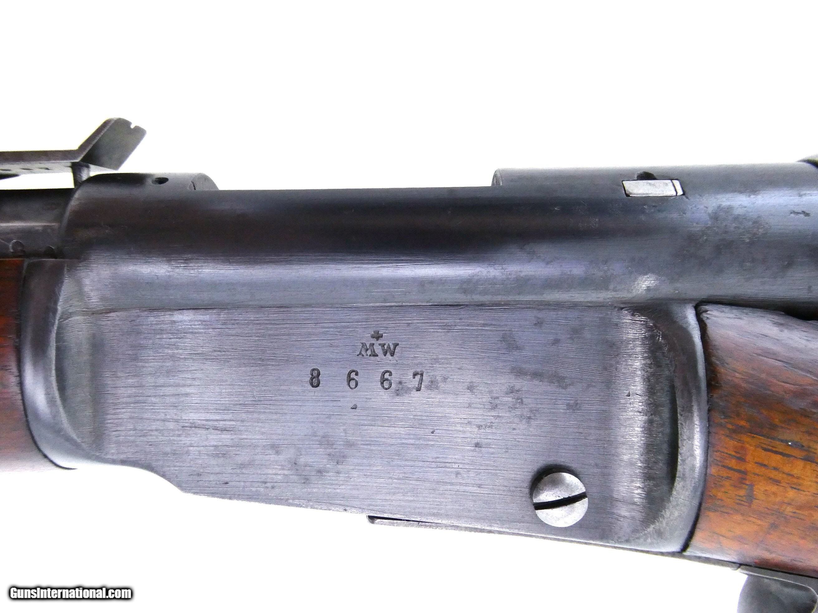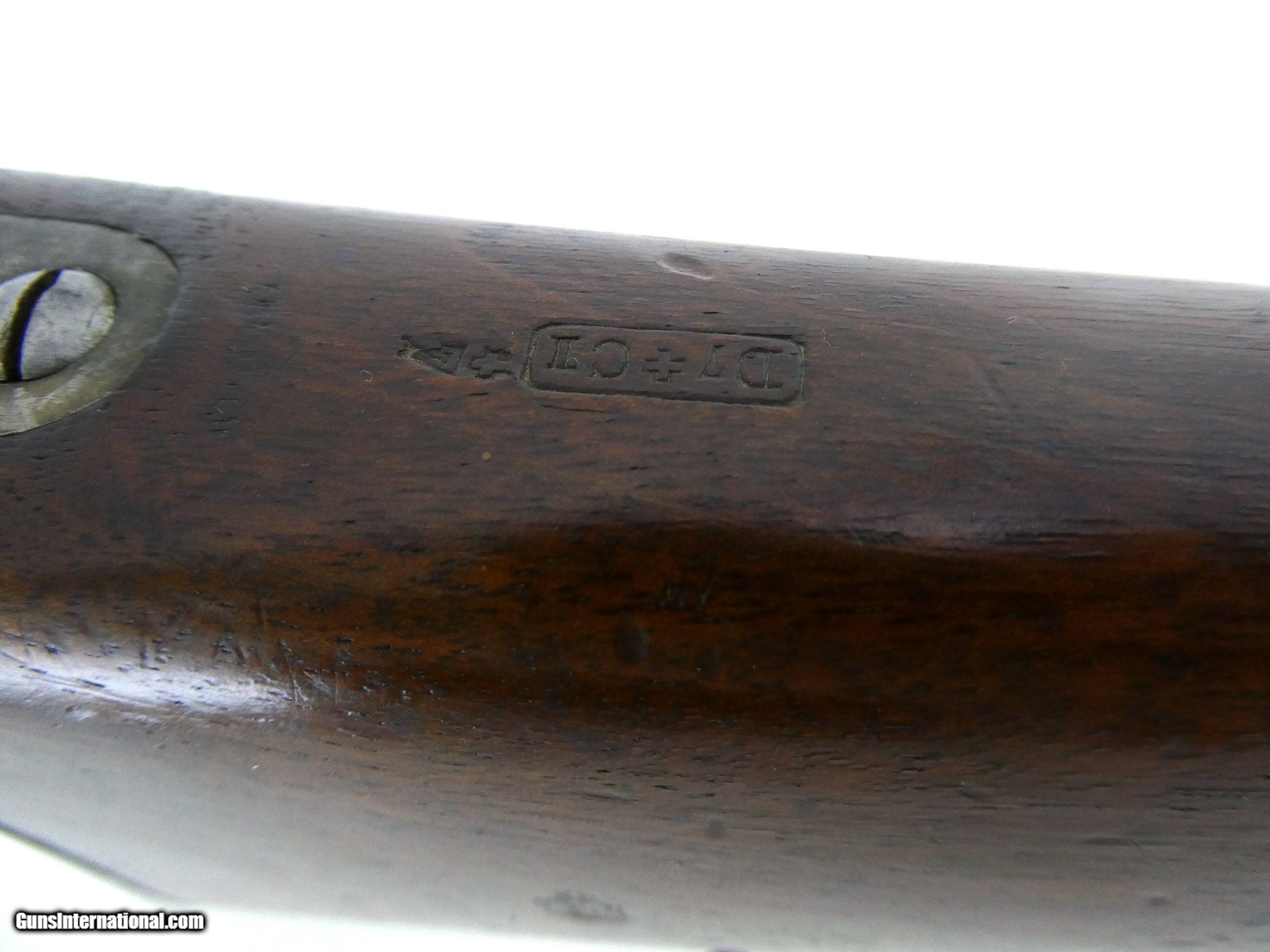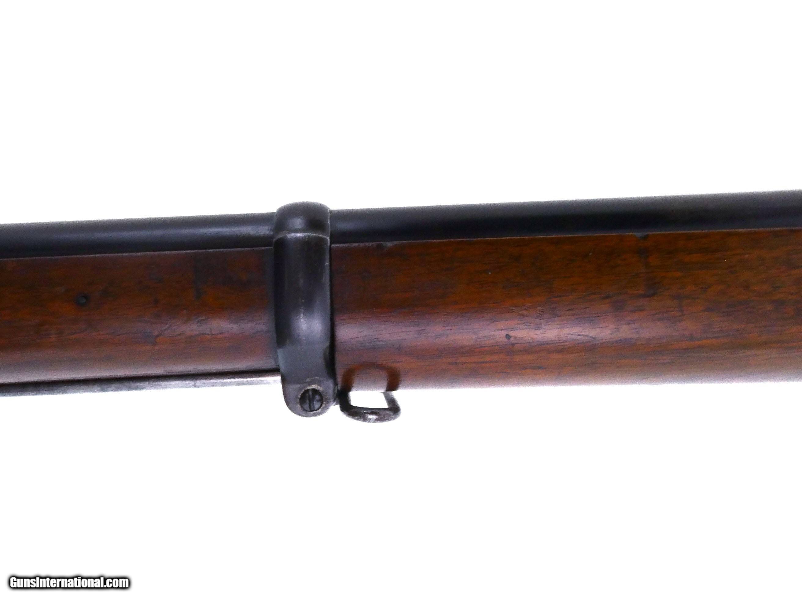 Description: Scarce Swiss Army Vetterli repeating rifle with 10 round tube magazine. Slightly shorter sharp shooter (Stutzer) version of the 1871 infantry rifle. Early production - pre 1873 as the receiver & barrel are stamped MW for Eidgenoessische Montierwekstatt Bern (Confederate assembly plant of Bern). Clear inspection marks on metal and wood, all matching serial numbers, double set trigger, Swiss butt, correct cleaning rod. OAL=50.4", LOP=12.4", barrel=30.1". Good action & trigger, excellent bore, originally chambered for the M63 10.4x38R rim fire cartridge, now converted to center fire by the Swiss master gunsmith Roger Rerat of Laufen. CF brass can be made from 8mm Lebel (8x50R). Good stock with some minor handling marks, good metal condition with some loss of blue finish and few spots of patina / light frosting. Add this early sniper rifle to your collection. Antique: Yes Rifle Caliber: 10.4x38mmR Swiss Price: $1,354.00 Shipping: $80.00 Contact Seller |