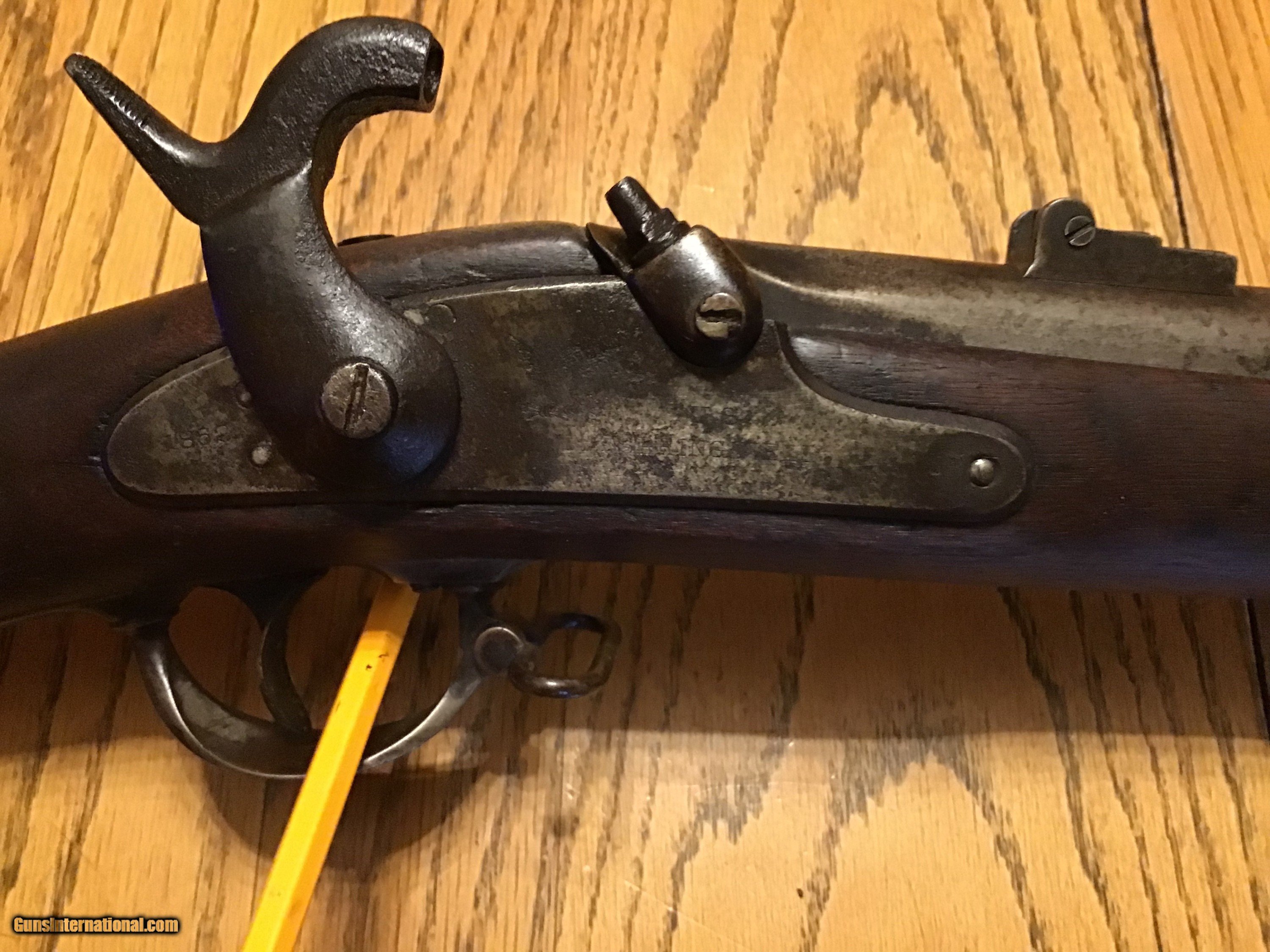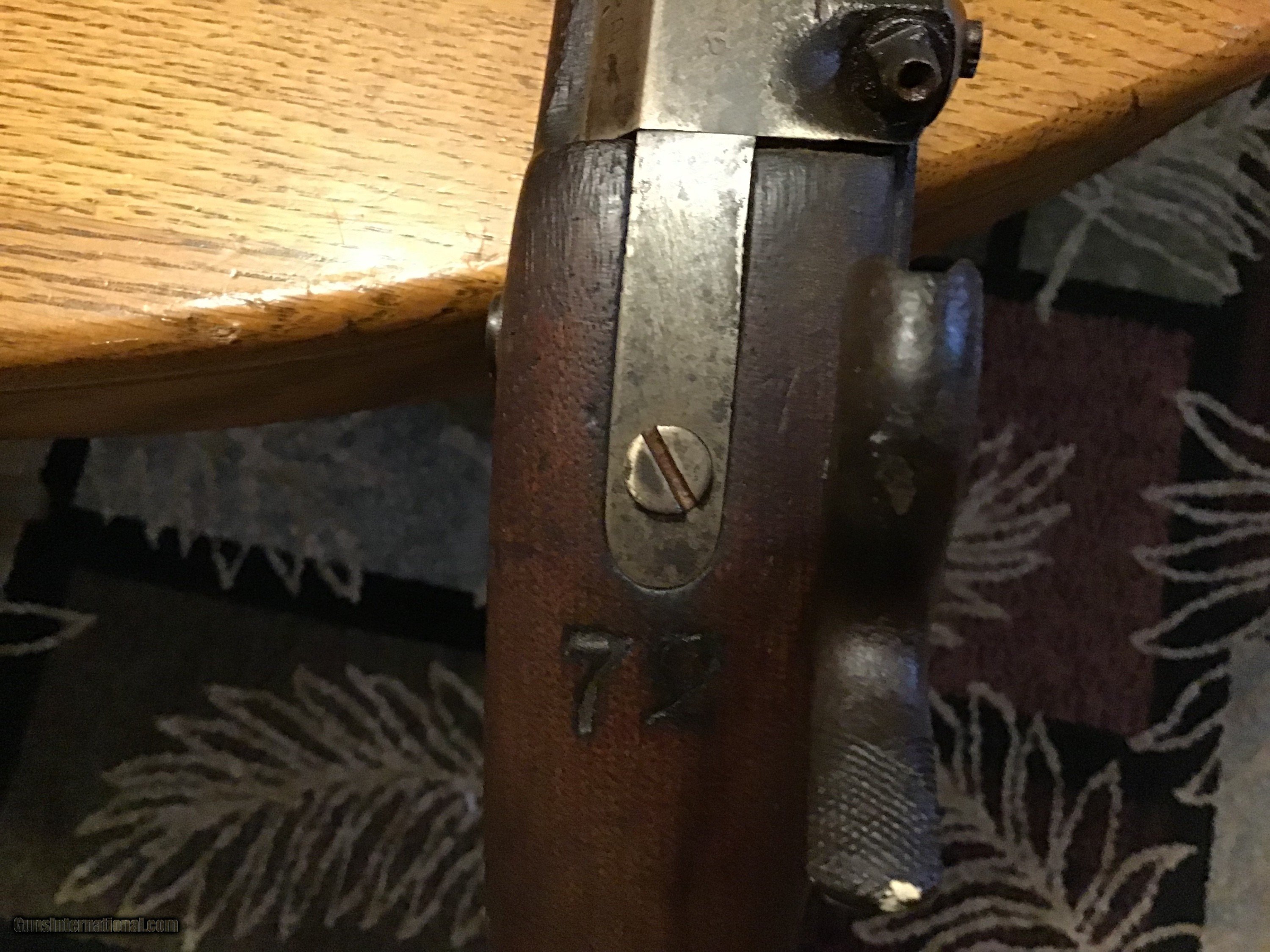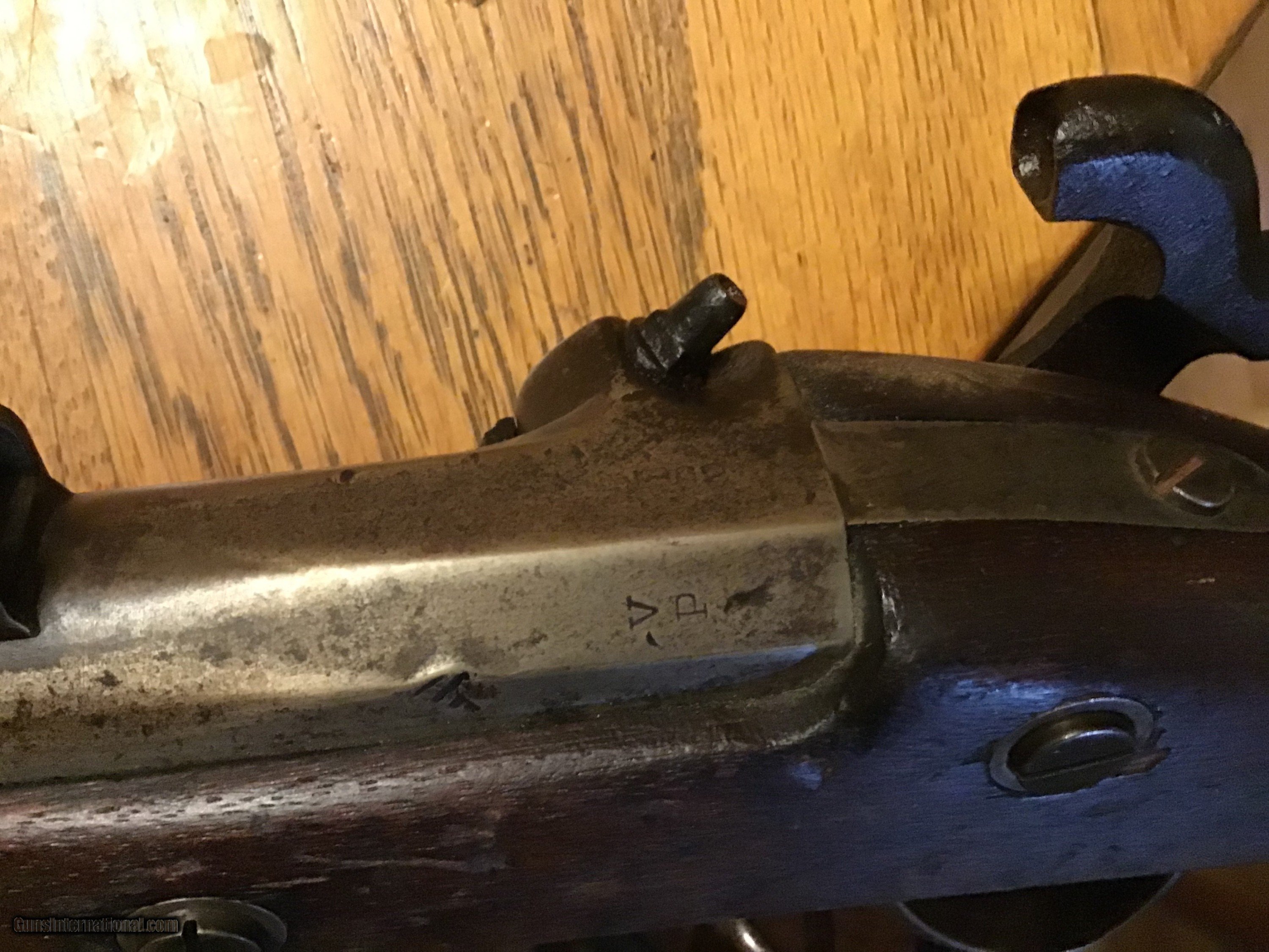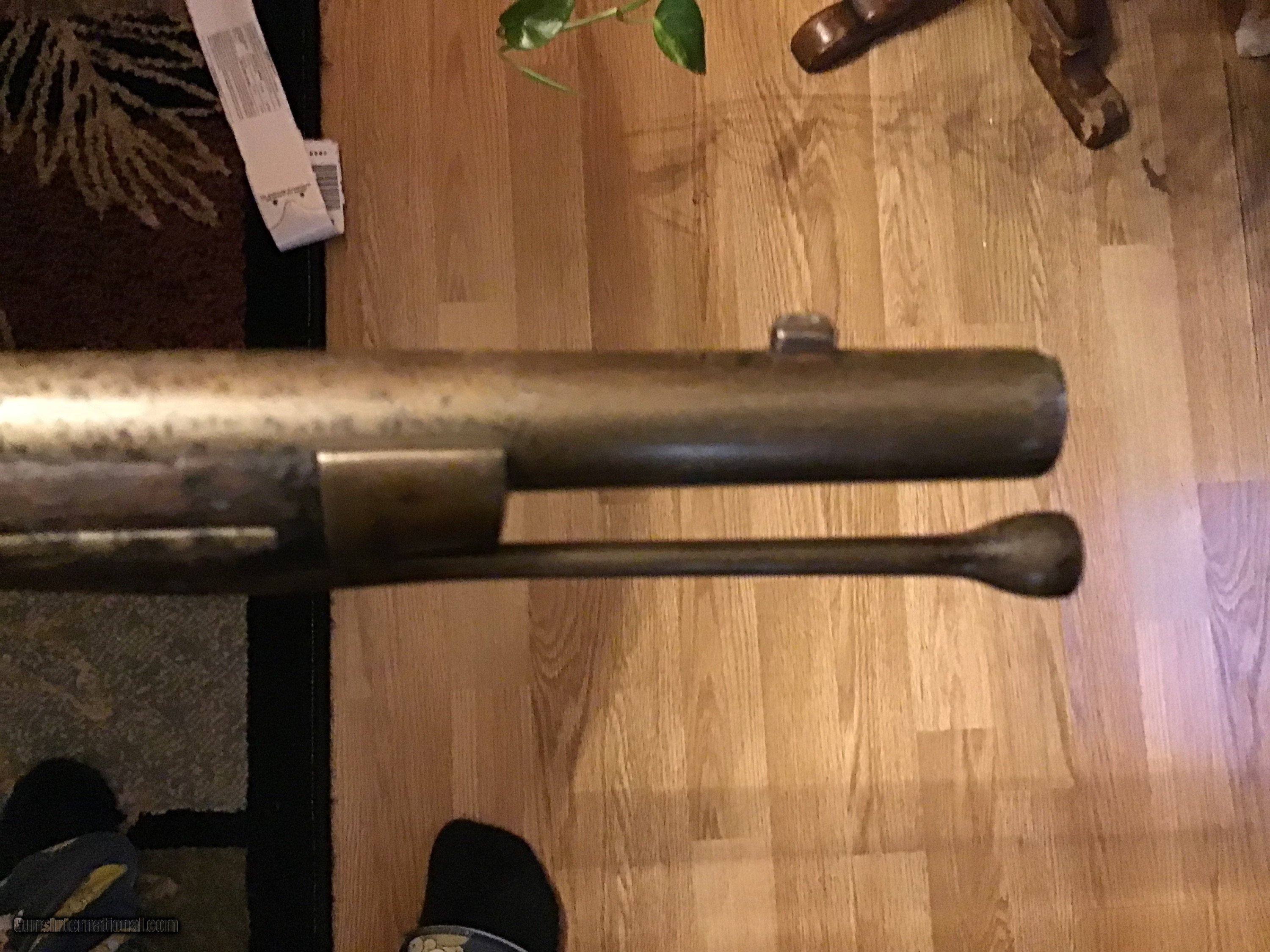 Description: The US Model 1861 Springfield 58 caliber musket was the favorite Union arm favored for it range accuracy and reliability. This one is still in its original condition with a 40 inch rifled 58 caliber bore. The functioning lock is marked US Springfield, dated 1862 with the American eagle. The 40 inch barrel is dated 1862 with VP and eagle head. The dark walnut stuck is stamped 72 a rack or regimental marking with numerous dents dings and shows normal wear. All metal parts are a grey brown mix with scattered pitting. This old musket is in good antique functioning condition and complete with sling swivels and ramrod. A good representative civil war rifle. The bore shows good rifling but needs cleaning. Please feel free to contact me with any questions. Shipping will be actual cost by usps insured mail with tracking. Antique: Yes Price: $795.00 Contact Seller |