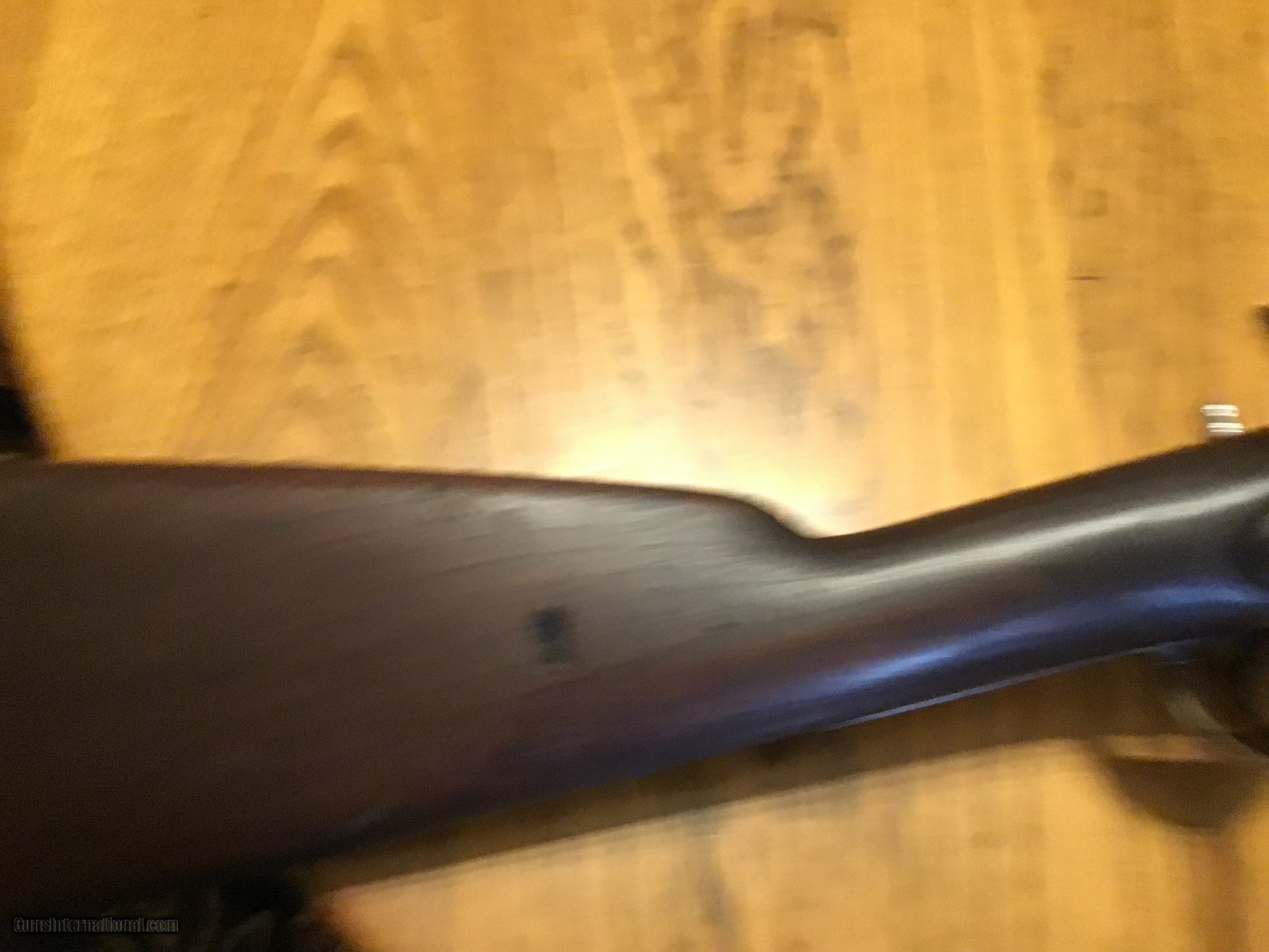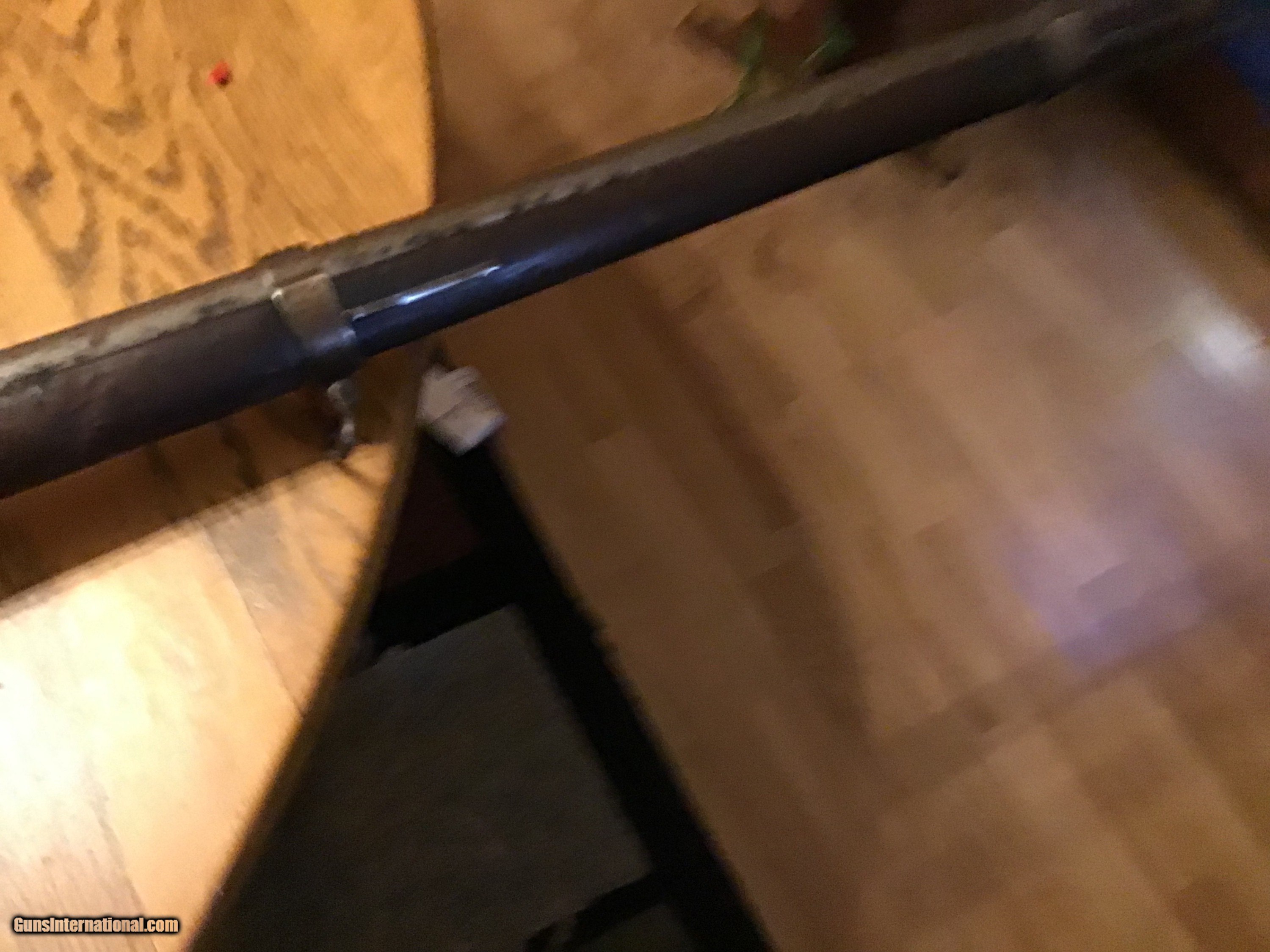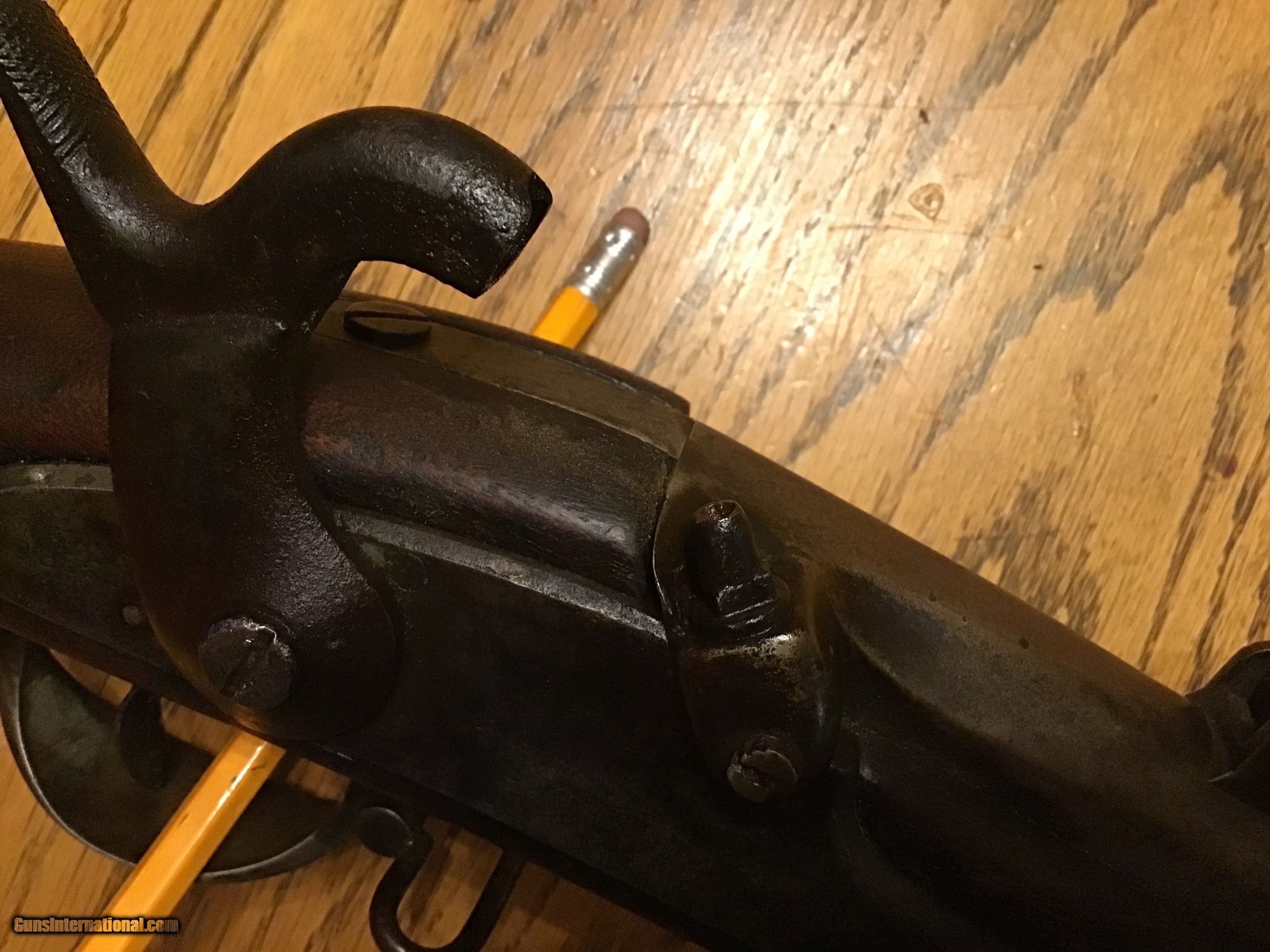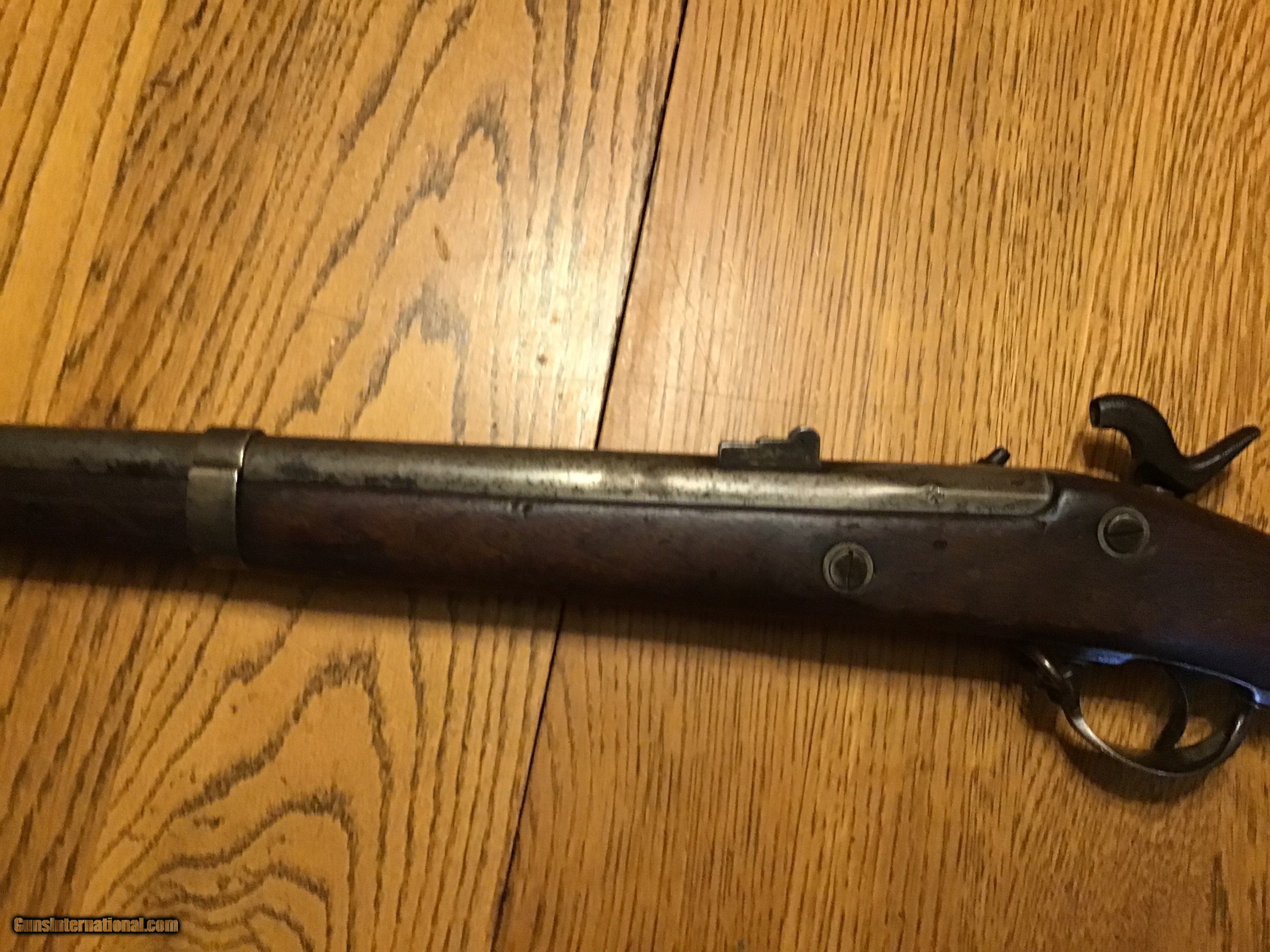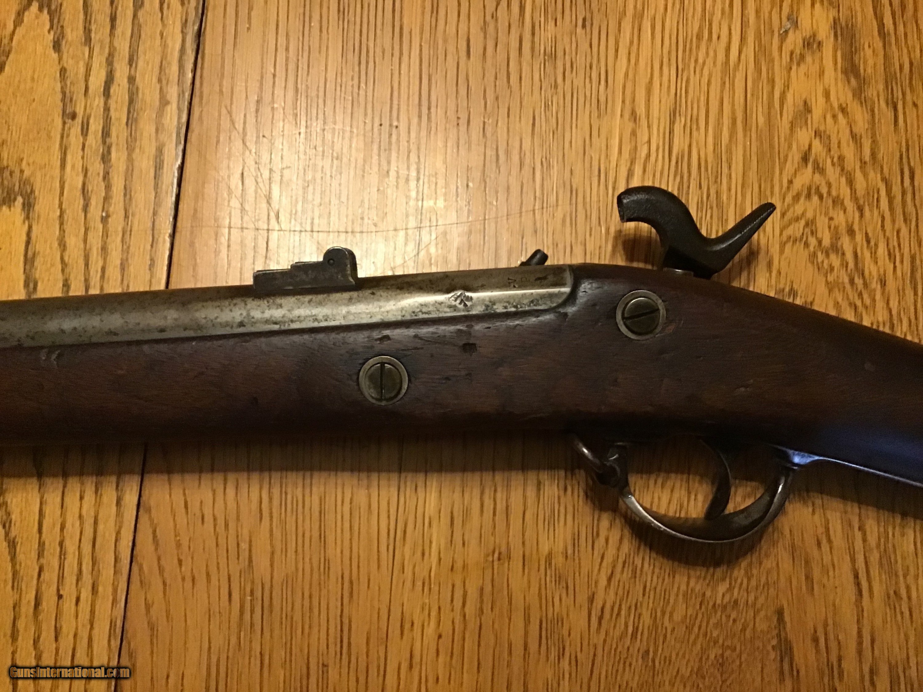 Description: The US Model 1861 Springfield 58 caliber musket was the favorite Union arm favored for it range accuracy and reliability. This one is still in its original condition with a 40 inch rifled 58 caliber bore. The functioning lock is marked US Springfield, dated 1862 with the American eagle. The 40 inch barrel is dated 1862 with VP and eagle head. The dark walnut stuck is stamped 72 a rack or regimental marking with numerous dents dings and shows normal wear. All metal parts are a grey brown mix with scattered pitting. This old musket is in good antique functioning condition and complete with sling swivels and ramrod. A good representative civil war rifle. The bore shows good rifling but needs cleaning. Please feel free to contact me with any questions. Shipping will be actual cost by usps insured mail with tracking. Antique: Yes Price: $795.00 Contact Seller |
