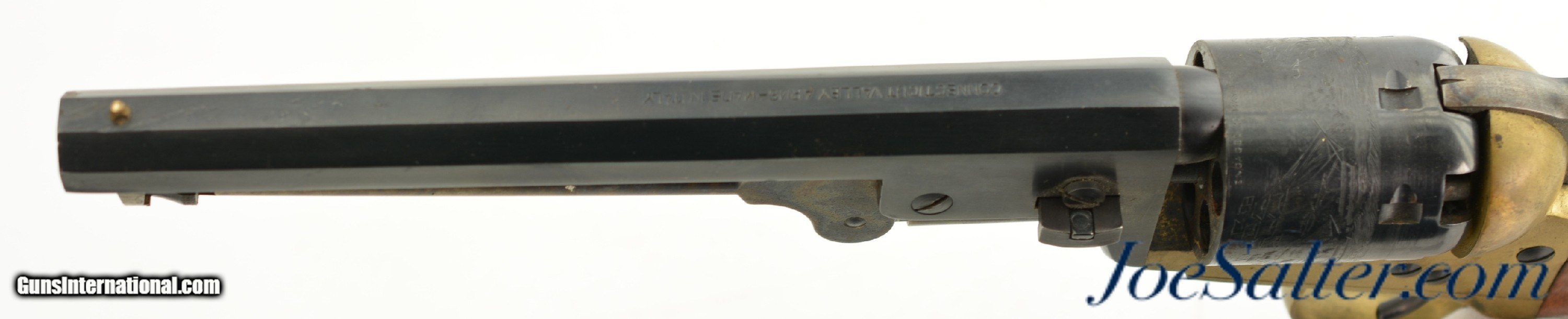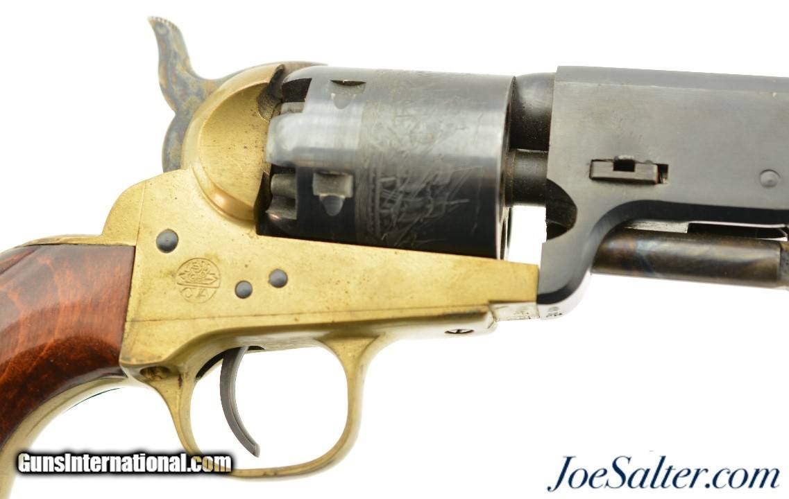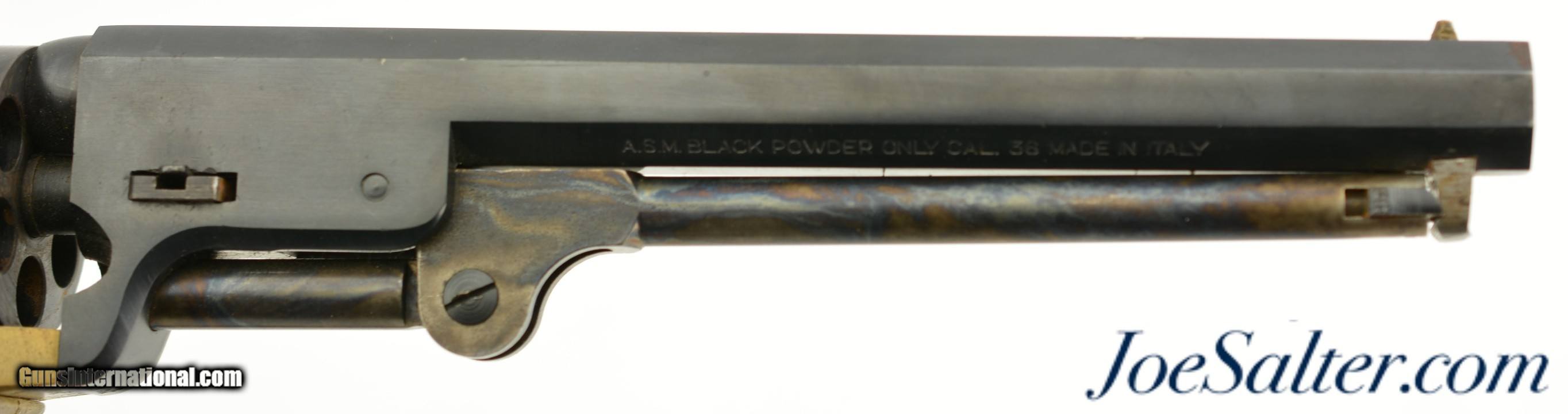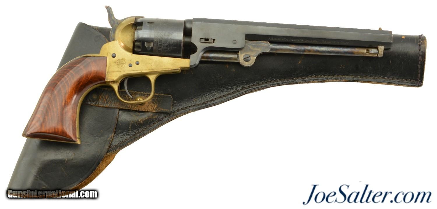 Description: Serial #D56044, .36 Caliber black powder percussion with a 7 ½ inch barrel with a bright, excellent bore. This is the CVA Model 1851 Navy revolver manufactured in Italy by ASM. In excellent condition it retains 85-90% of the original blue finish with some mild oxidation in the chambers. The loading lever and hammer showing vibrant case colors and the brass frame a mellow aged goldenrod. The grips are excellent. It comes in a leather flap holster. Antique SOLD |