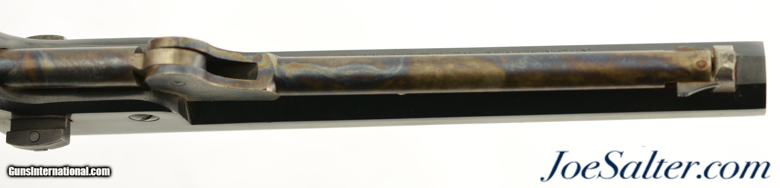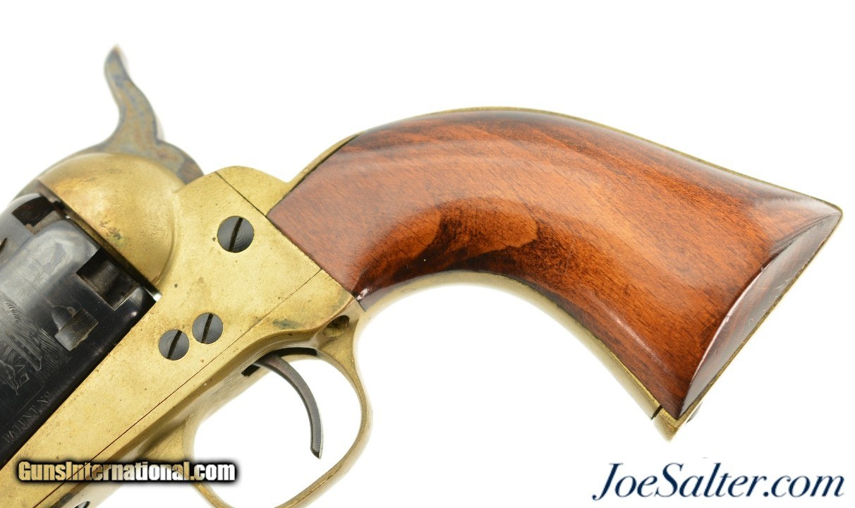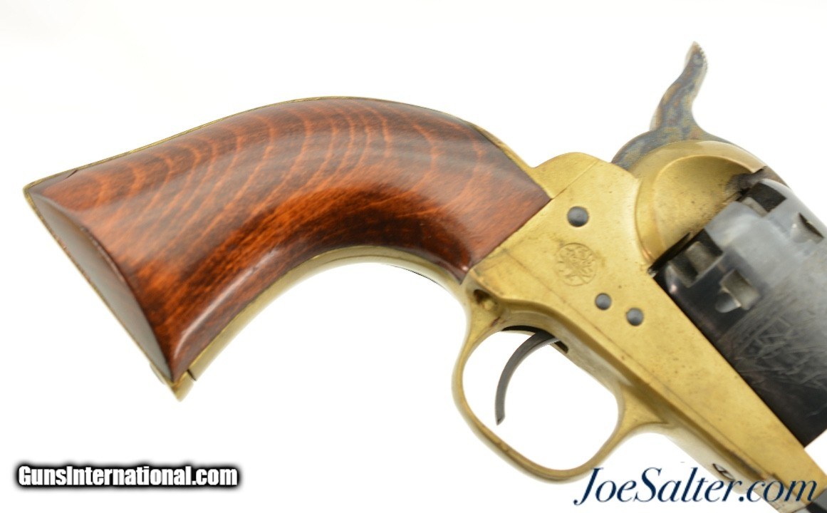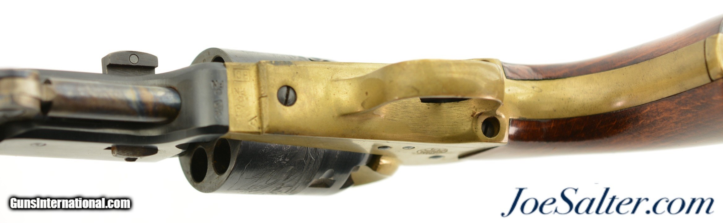 Description: Serial #D56044, .36 Caliber black powder percussion with a 7 ½ inch barrel with a bright, excellent bore. This is the CVA Model 1851 Navy revolver manufactured in Italy by ASM. In excellent condition it retains 85-90% of the original blue finish with some mild oxidation in the chambers. The loading lever and hammer showing vibrant case colors and the brass frame a mellow aged goldenrod. The grips are excellent. It comes in a leather flap holster. Antique SOLD |