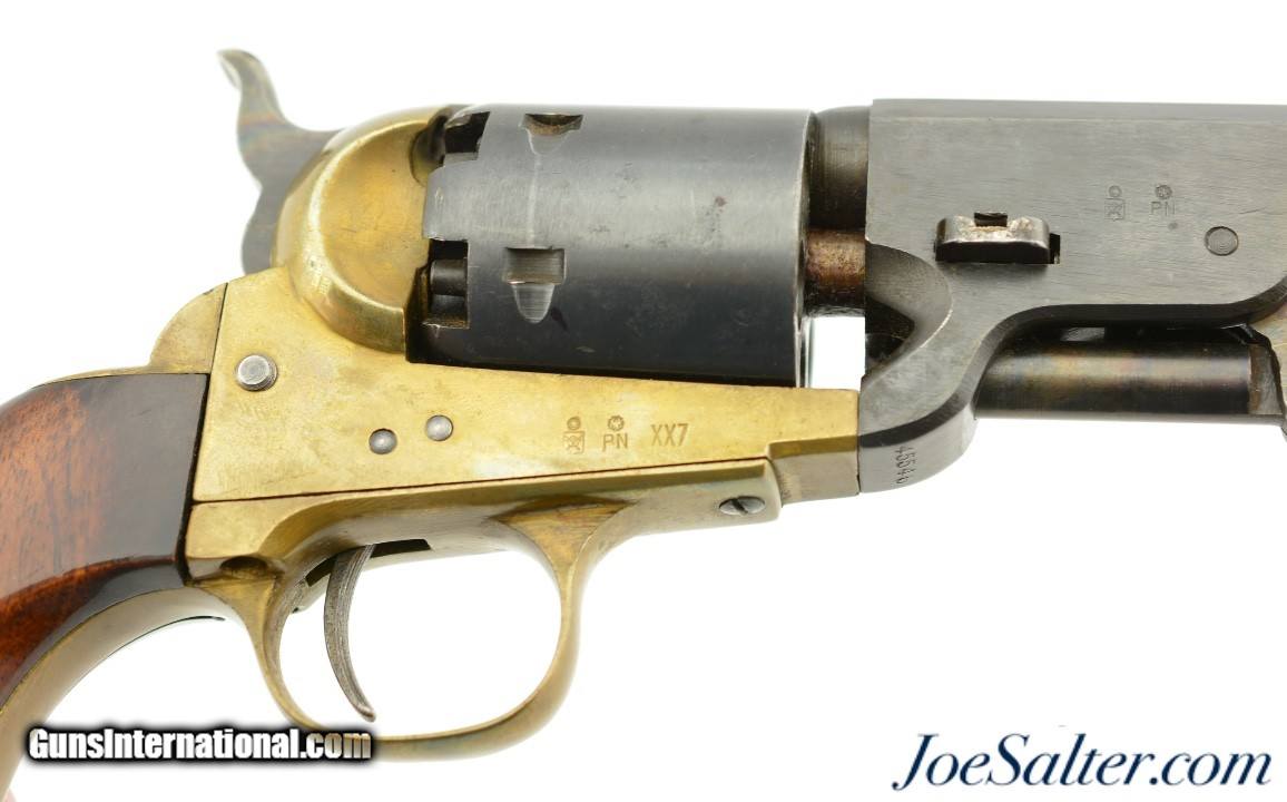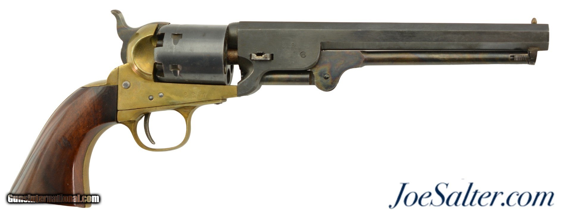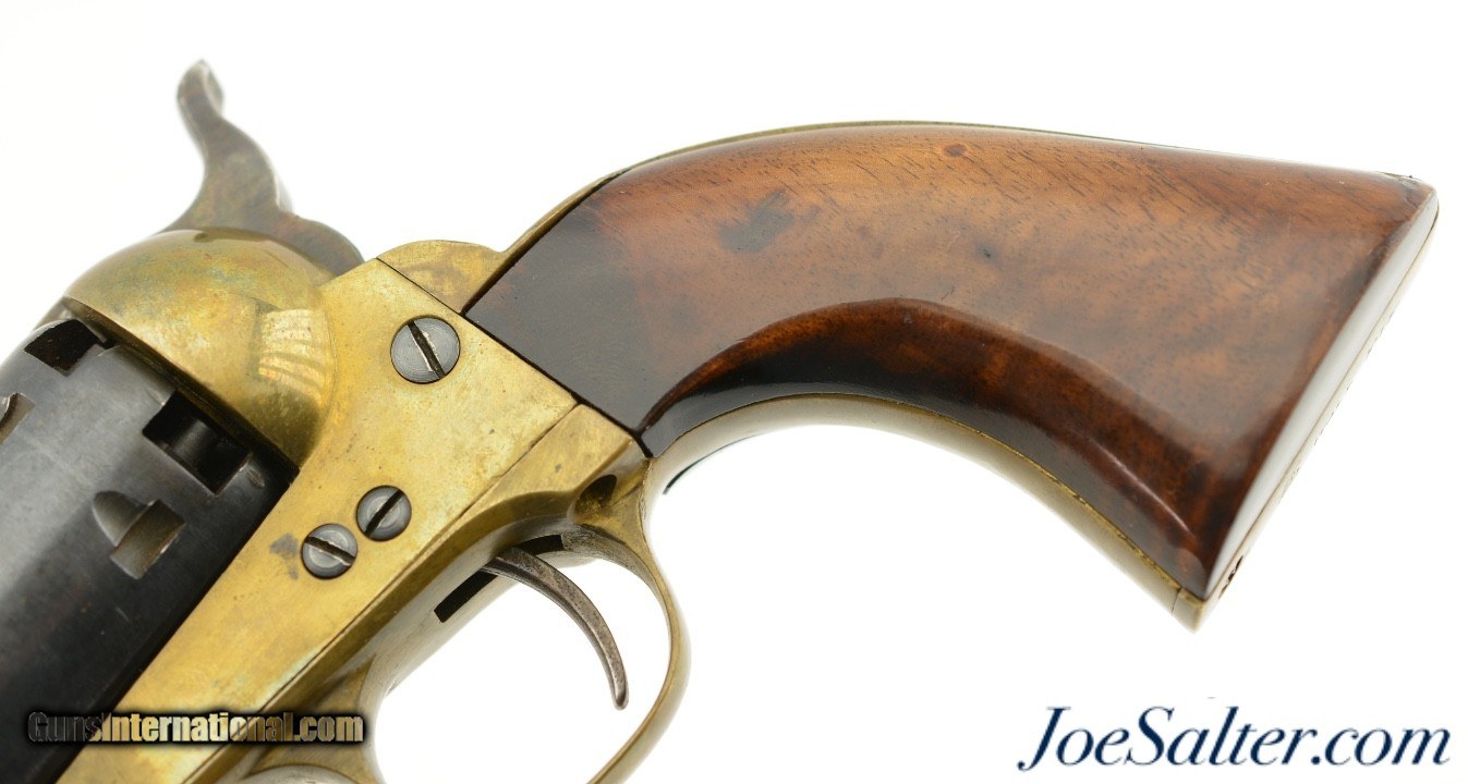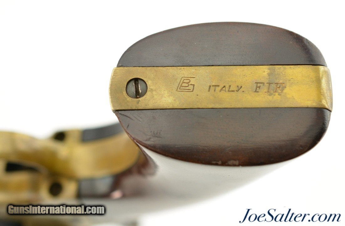 Description: Serial #45546, .36 Caliber black powder percussion, 7 ½ inch octagon barrel with a bright, excellent bore. This is a 1851 Navy model revolver manufactured by FIE in 1971 in Italy. In excellent condition the barrel and cylinder show 90-95% original blue with light scratches and use marks. The loading lever and hammer show muted case colors and the frame is a pleasing aged brass. The hardwood grips rate excellent. The action functions properly with a smooth trigger. Antique Price: $295.00 Contact Seller |