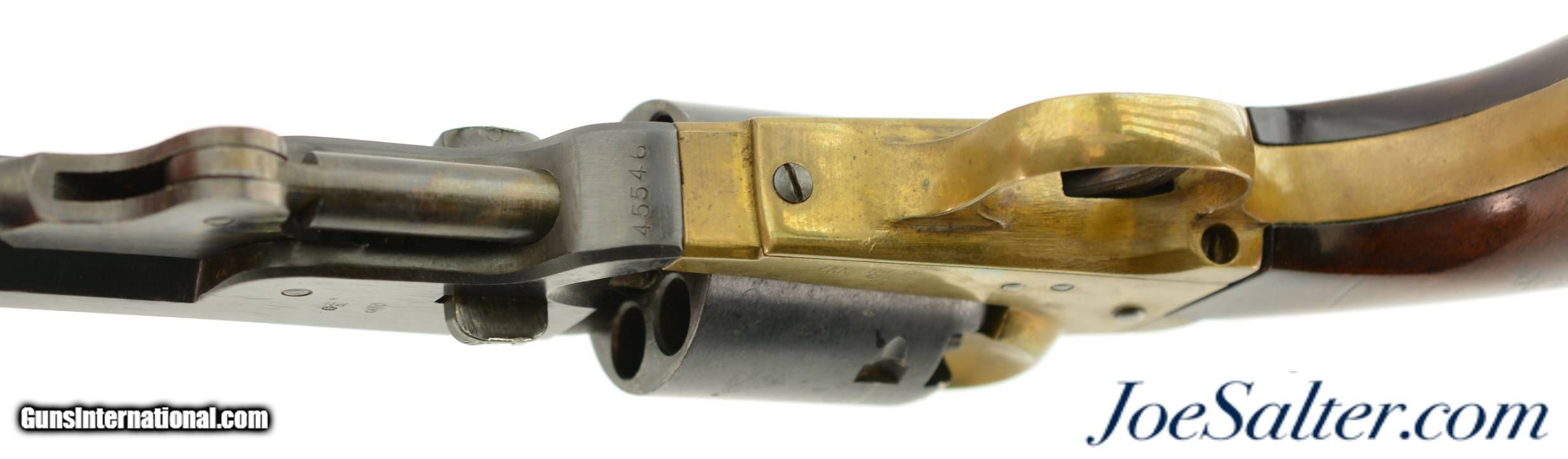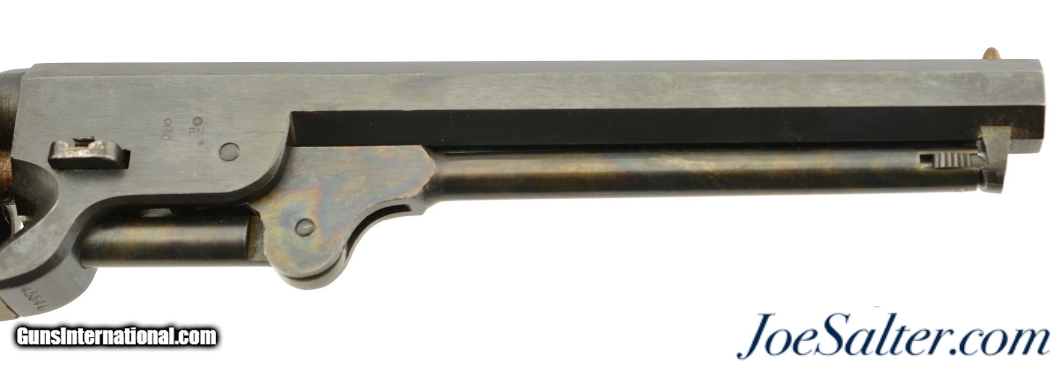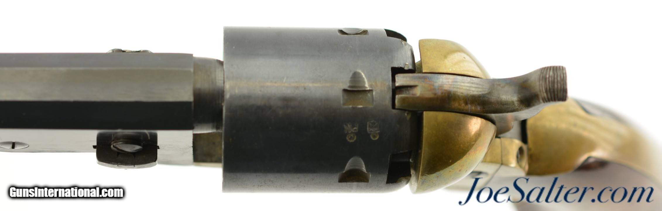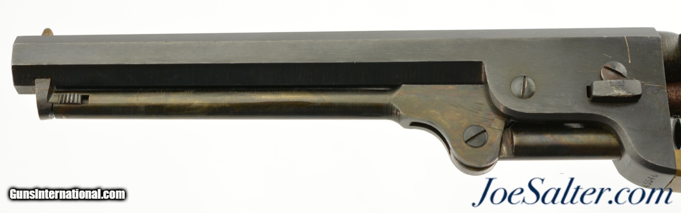 Description: Serial #45546, .36 Caliber black powder percussion, 7 ½ inch octagon barrel with a bright, excellent bore. This is a 1851 Navy model revolver manufactured by FIE in 1971 in Italy. In excellent condition the barrel and cylinder show 90-95% original blue with light scratches and use marks. The loading lever and hammer show muted case colors and the frame is a pleasing aged brass. The hardwood grips rate excellent. The action functions properly with a smooth trigger. Antique Price: $295.00 Contact Seller |