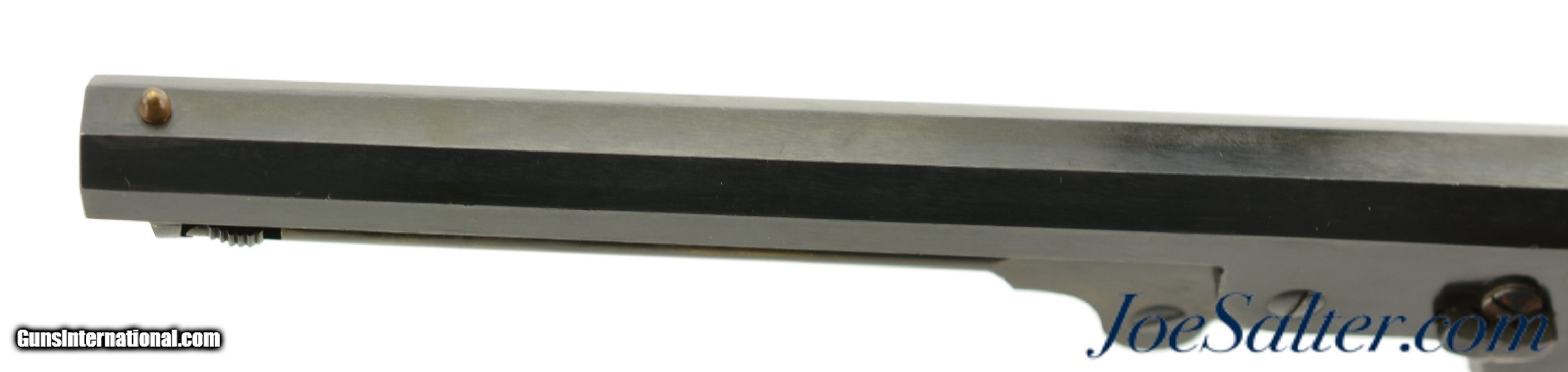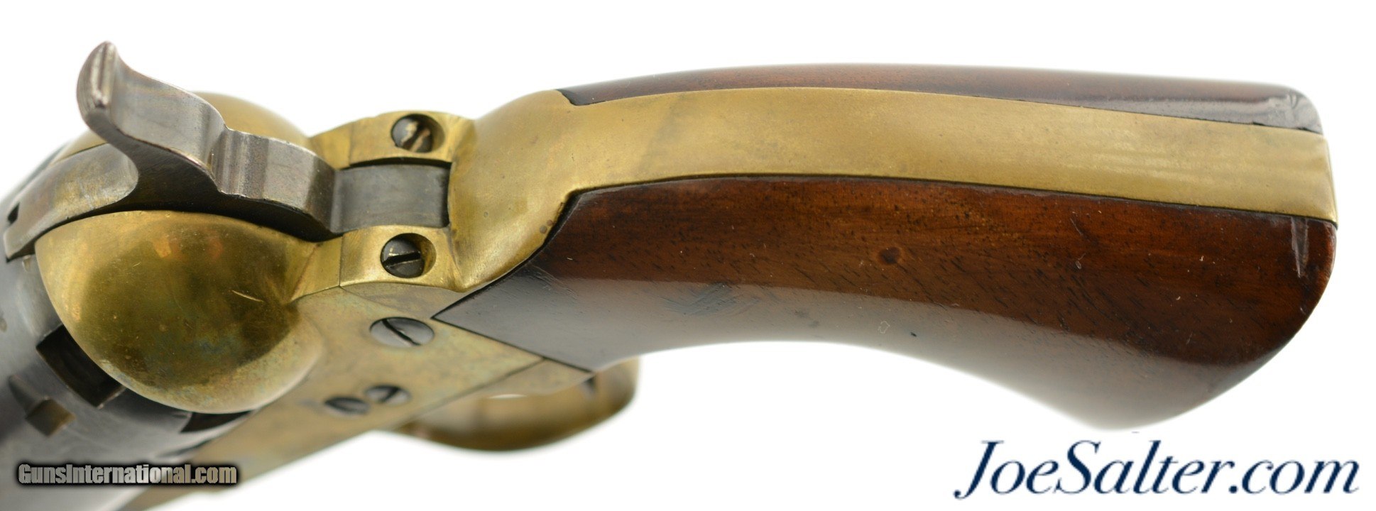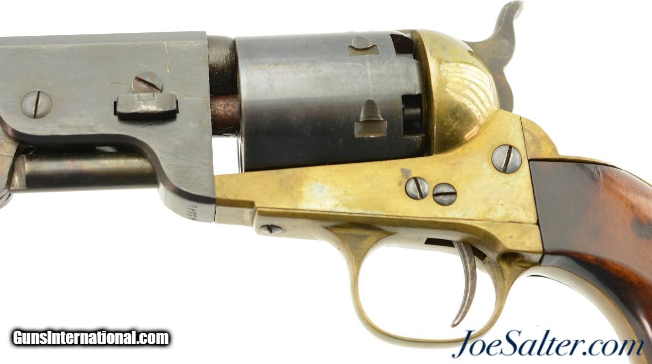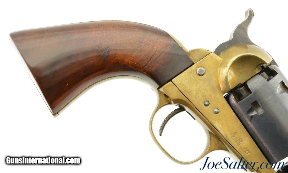 Description: Serial #45546, .36 Caliber black powder percussion, 7 ½ inch octagon barrel with a bright, excellent bore. This is a 1851 Navy model revolver manufactured by FIE in 1971 in Italy. In excellent condition the barrel and cylinder show 90-95% original blue with light scratches and use marks. The loading lever and hammer show muted case colors and the frame is a pleasing aged brass. The hardwood grips rate excellent. The action functions properly with a smooth trigger. Antique Price: $295.00 Contact Seller |