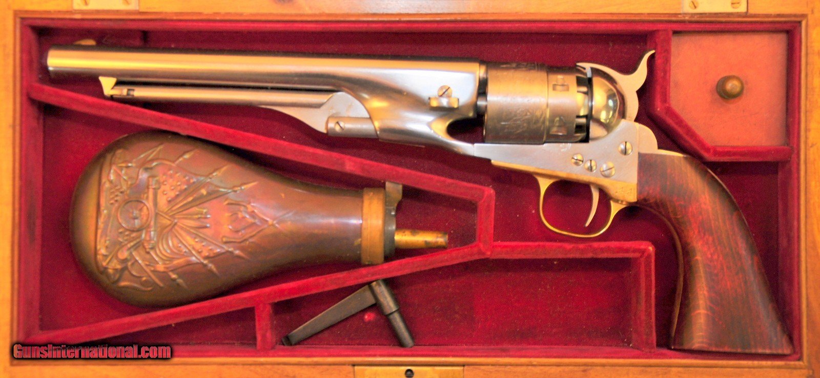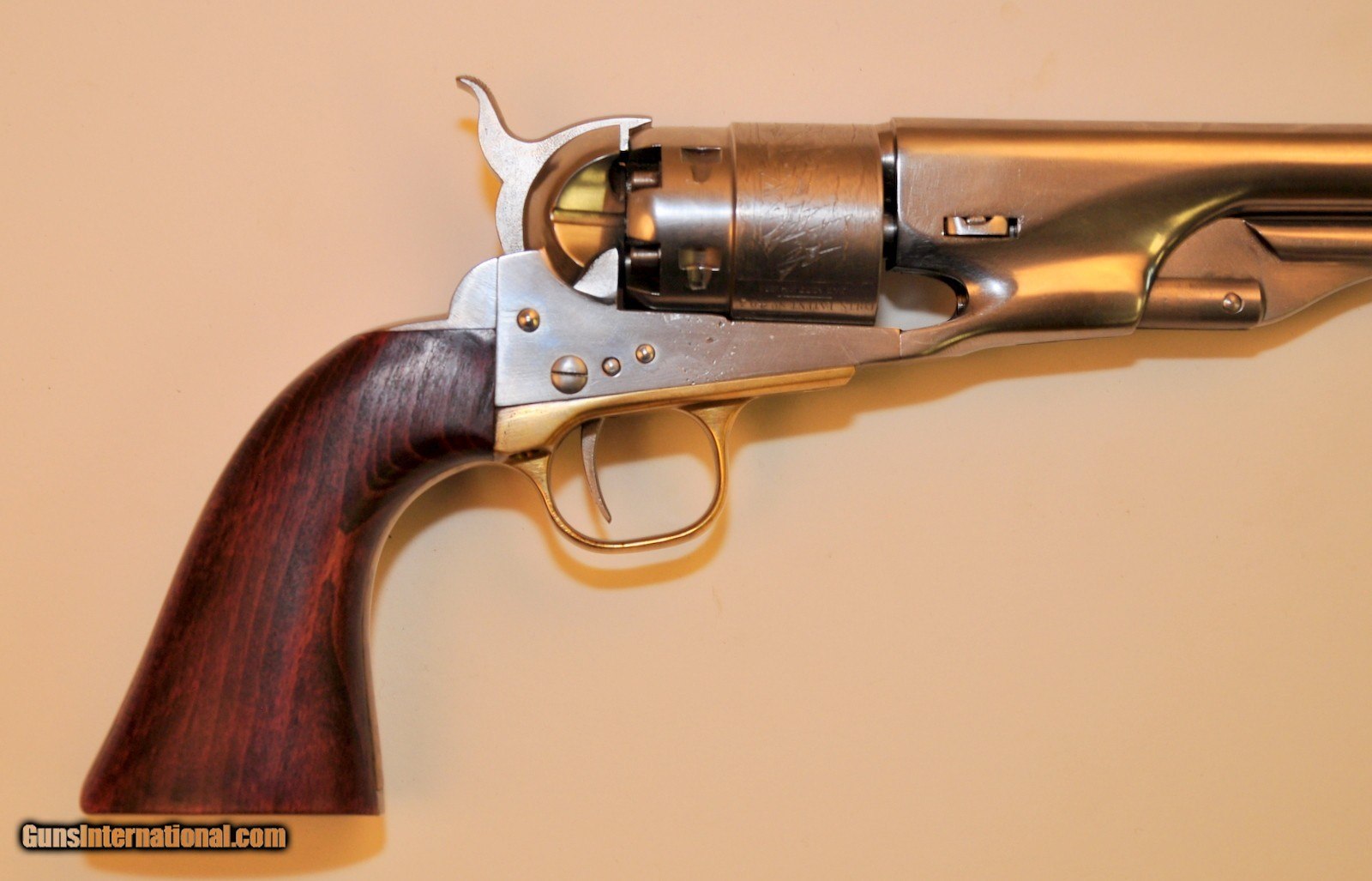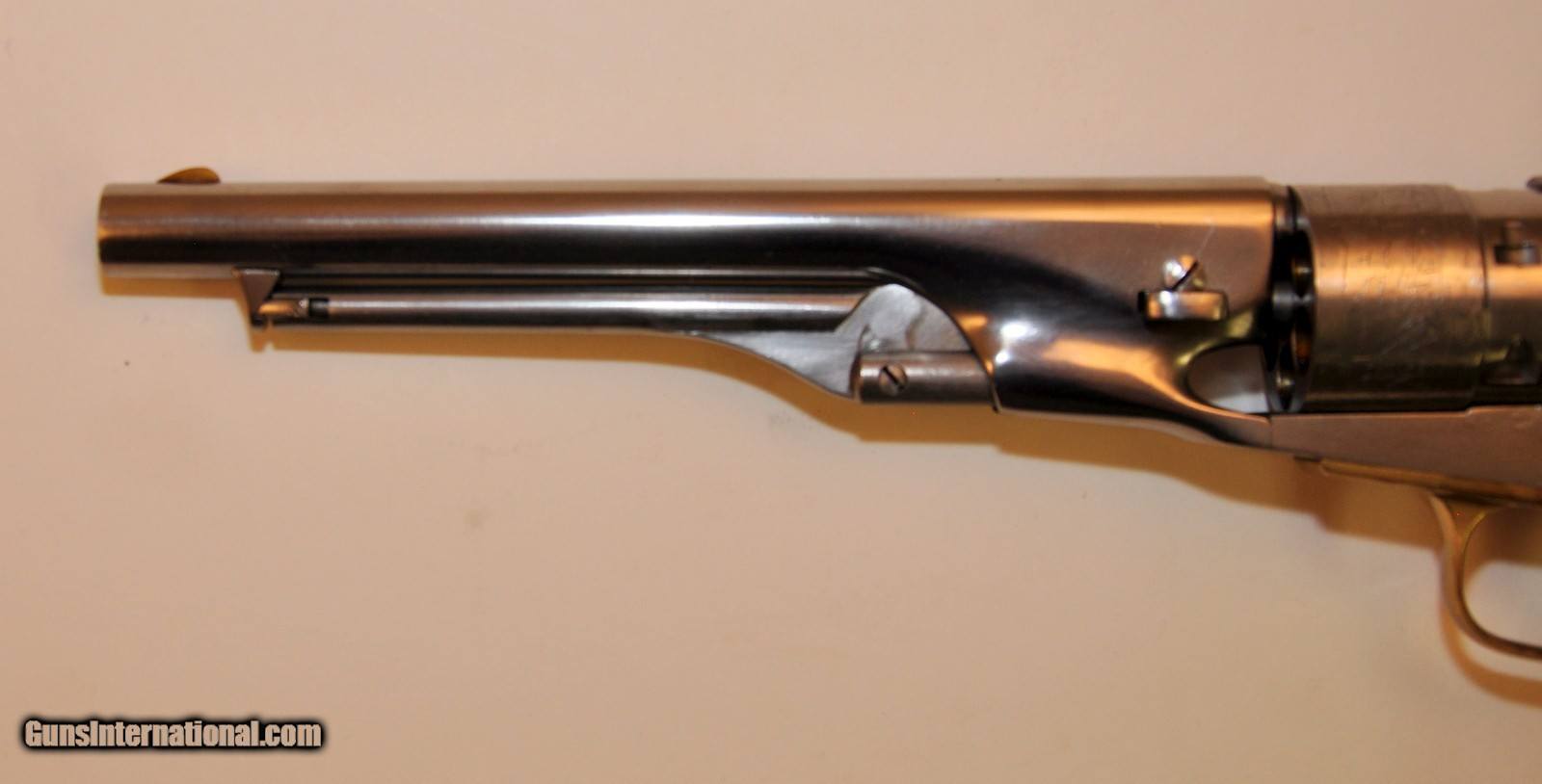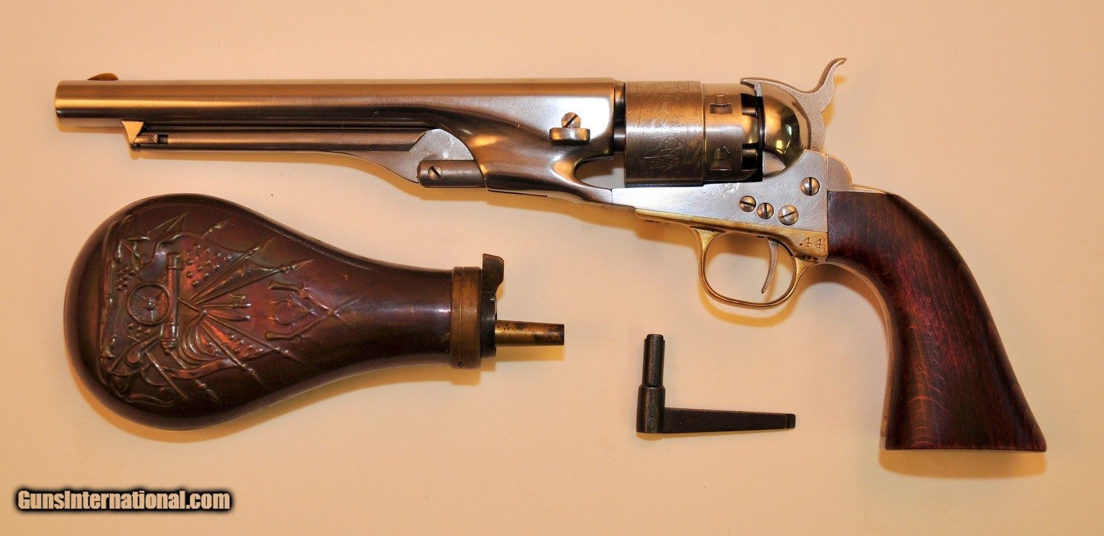 Description: 44 caliber. SN, 104000. 8" round barrel. 6 shot round rebated cylinder with naval engagement scene roll engraving. Brass trigger guard is stamped ".44". 1 piece hardwood grip. Wood presentation case with red velour fitted interior. Case contains powder flask & nipple wrench with a small quanity of lead bullets & round balls. Very good used condition.Cleaned bright finish. Sides of frame show areas of small dents. Grips show light wear. Very good bright bore. Sound action. Shipping $20. Credit card accepted with 4% upcharge. SOLD |
