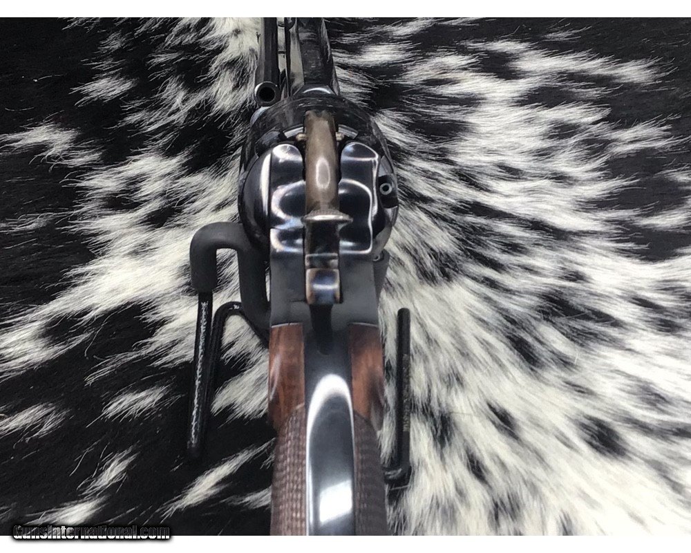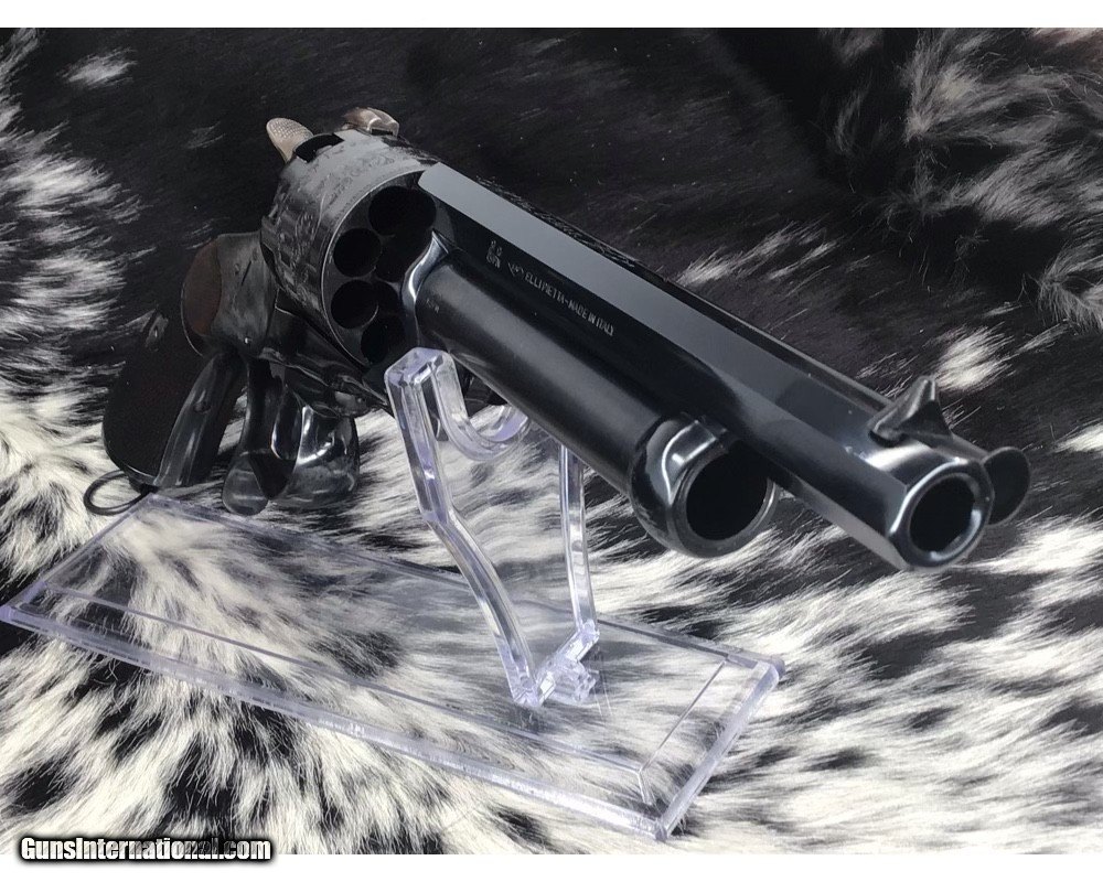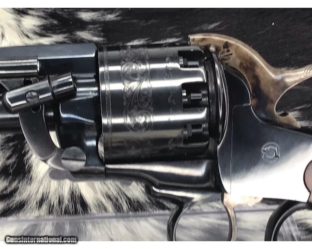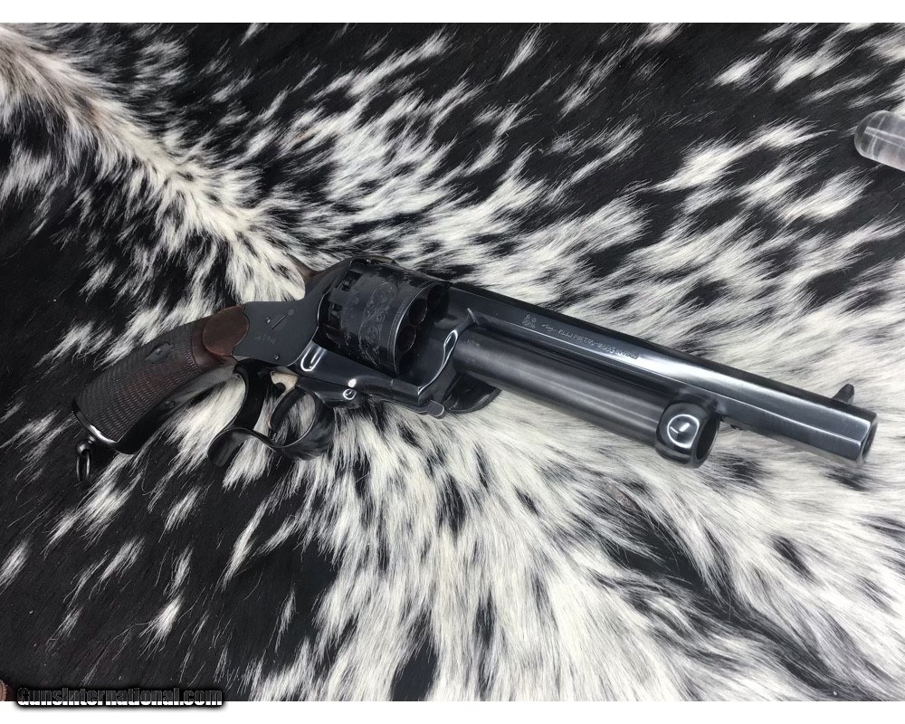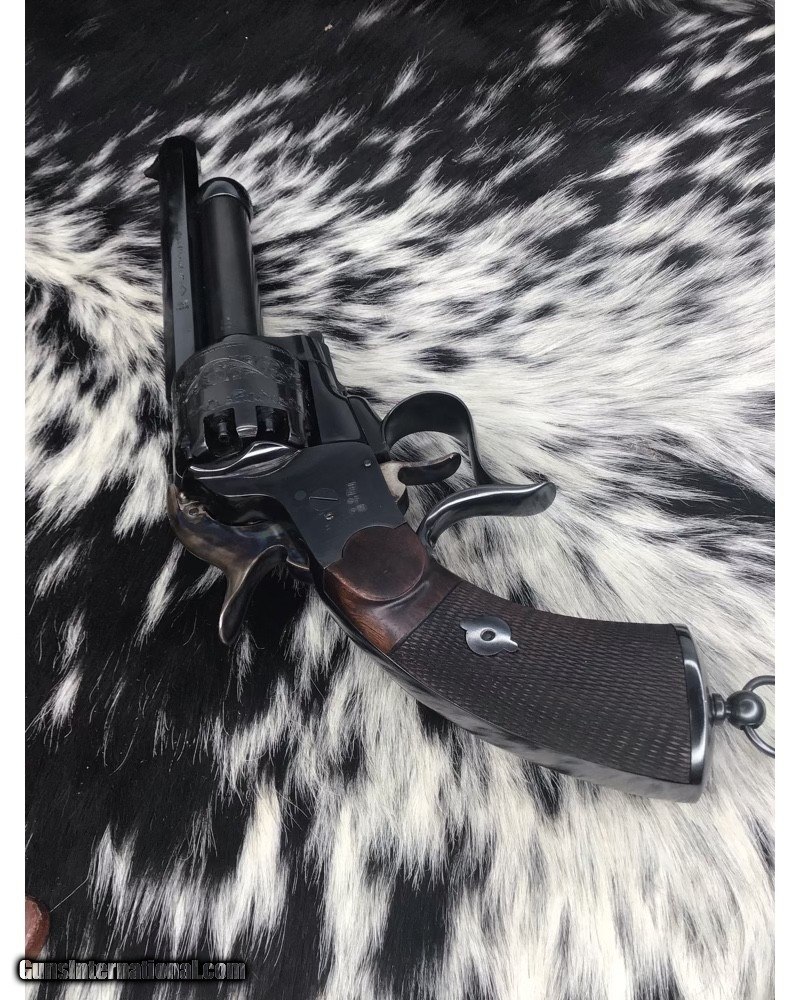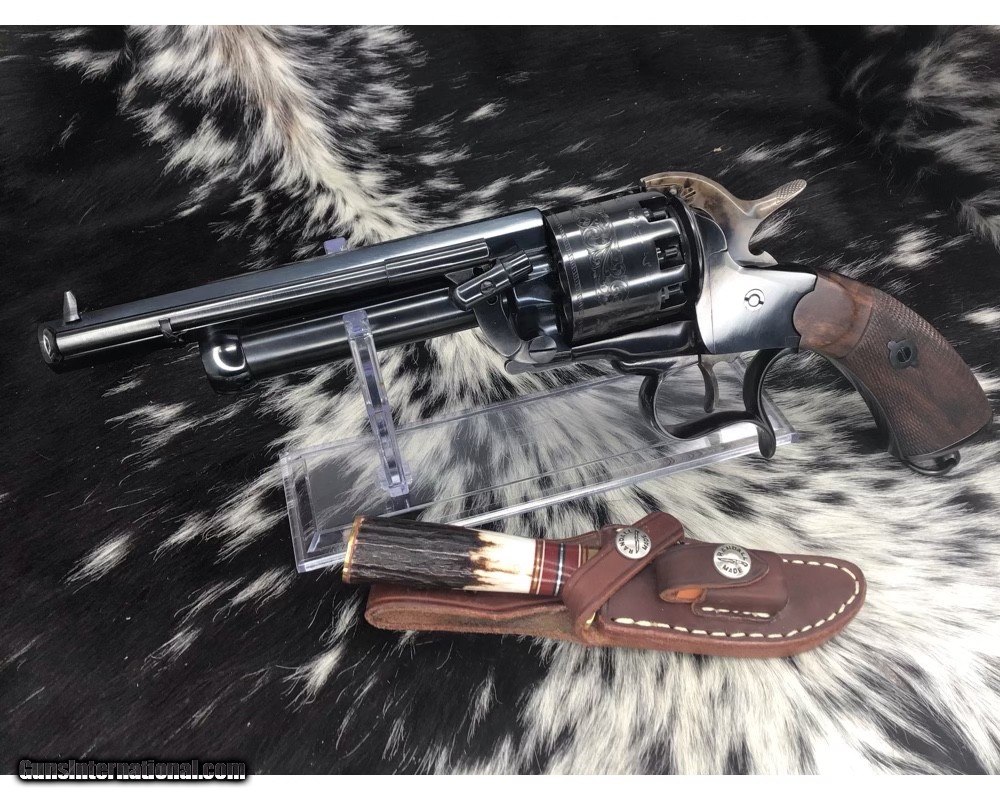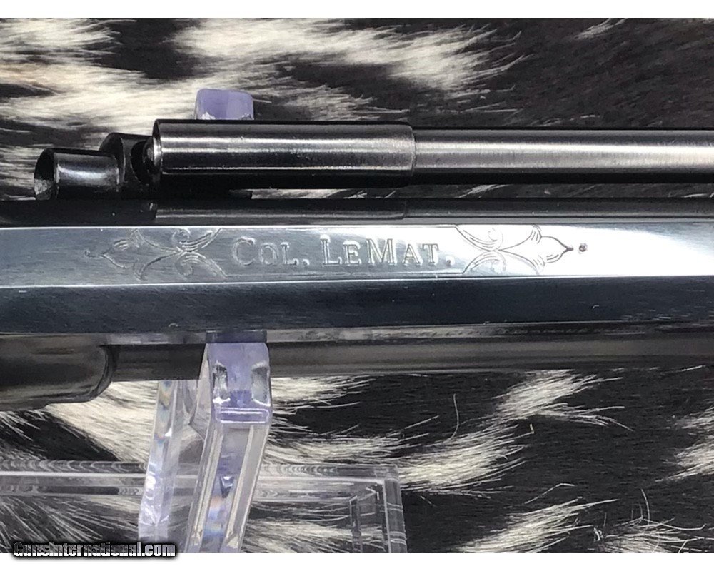 Description: New and unfired in Excellent condition. LeMat 9-shot .44 cal scroll engraved cylinder, 6.75 in. octagonal rifle barrel, secondar 20 ga. 5 in. smooth-bore barrel capable of firing buckshot functioning as short barrel shotgun, blued finish, case hardened smooth trigger and checkered hammer, flipping lever at end of hammer selects whether to fire from cylinder or smooth-bore barrel, top of octagonal barrel stamped "COL. LEMAT" surrounded by scroll work, Italian black powder proof marks on right side of both barrels and frame, S/N 11092, trigger guard spur, swivel lanyard ring, walnut checkered grips, S/N 11092. Beautifully rendered and accurate replica of a Confederate officers pistol that originals fetch five figures in collectors market.Can be shipped direct to your address, no FFL needed. Add 3% if paying with credit card. SOLD Handgun Caliber: .44 Manufacturer: Pietta Model: LeMat Serial Number: 11092 Barrel Length: 6.75 inch Condition: New Metal Condition: New Wood Condition: New Bore Condition: New Barrel Type: Octagon Action: Single action Finish: Blued Sights: Fixed Engraving: Cylinder Case: Generic hardcase Item Location: Mn |