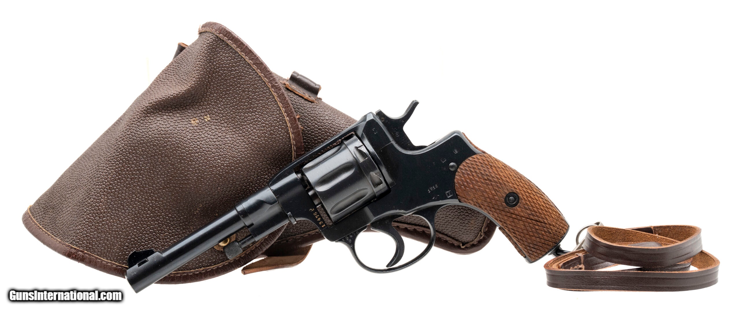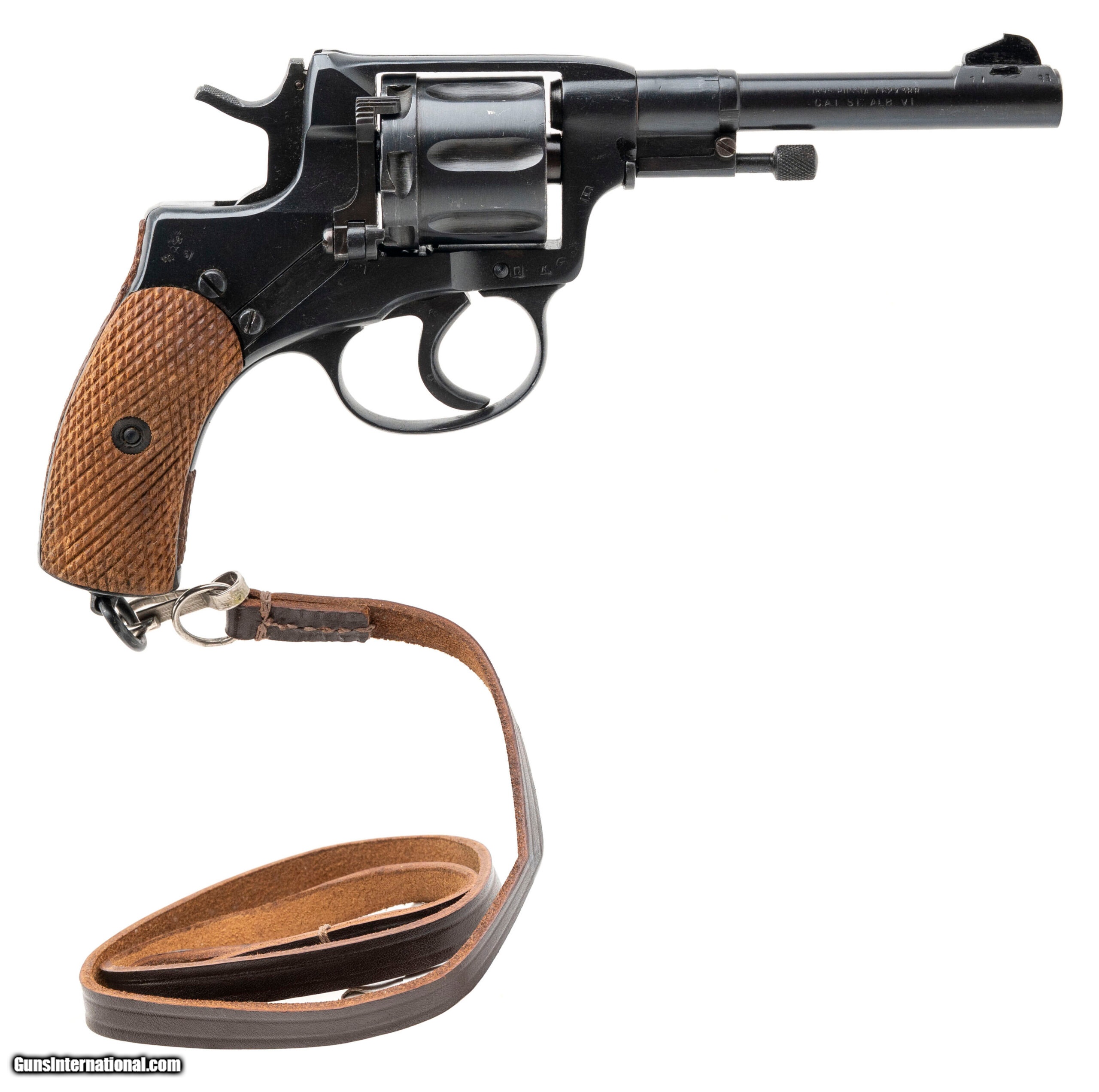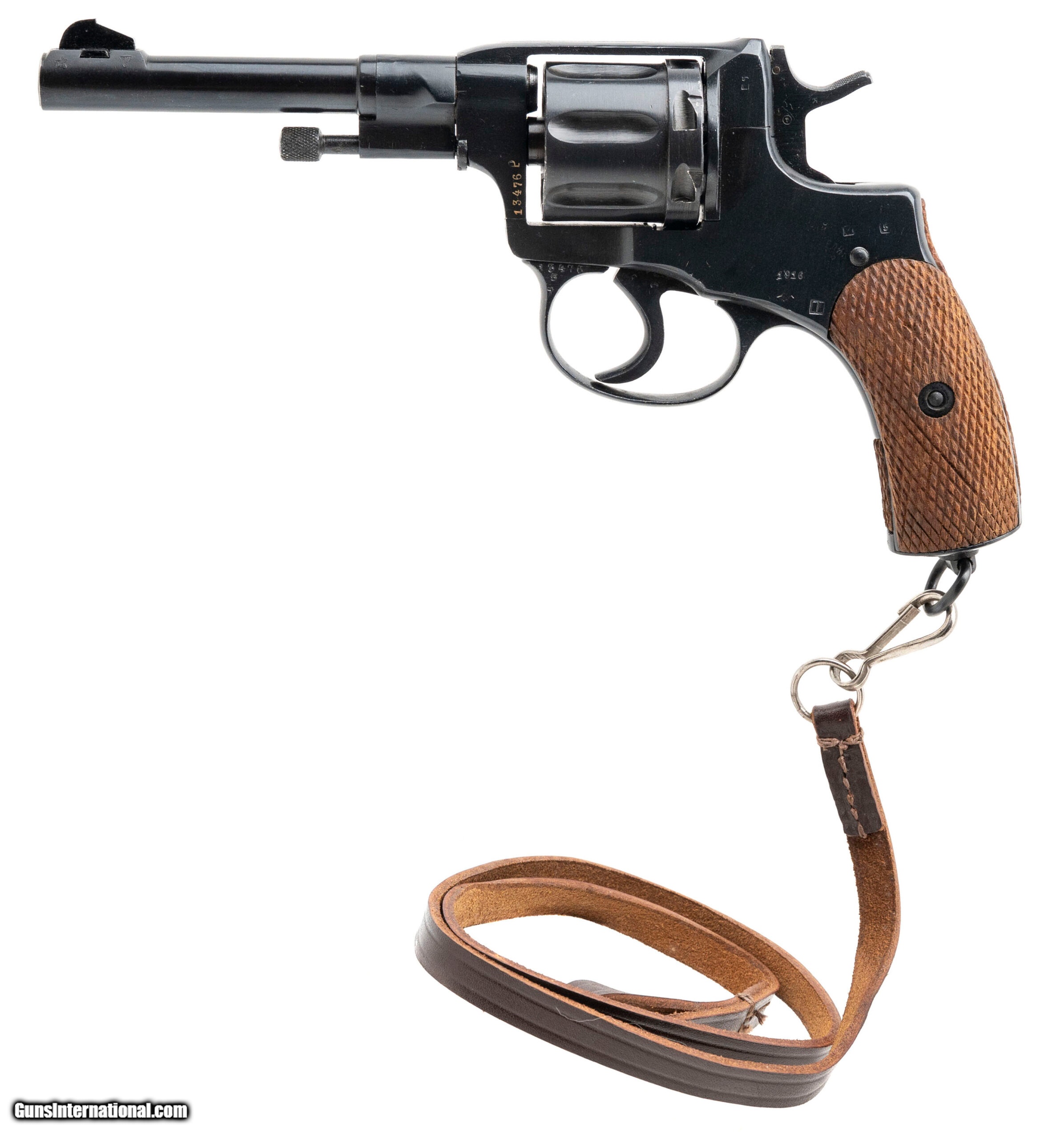 Description: "Serial No. 13476p, made in 1916, chambered in 7.62x38R with a 4 ½" round barrel. Revolver retains 98% of its arsenal refinish, with matching serial numbers throughout. Right side of the barrel is import marked. Grips are in excellent condition. Includes original lanyard and brown leather holster. Action indexes correctly with a tight lock-up. A strong example of a WWI-era Russian service revolver. SOLD Curio/Relic: Yes |