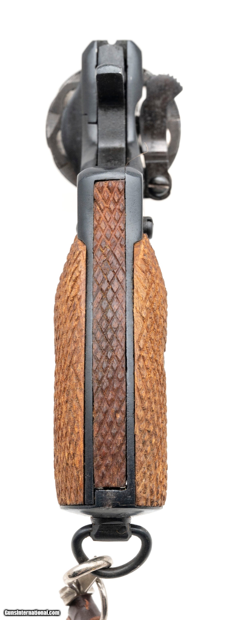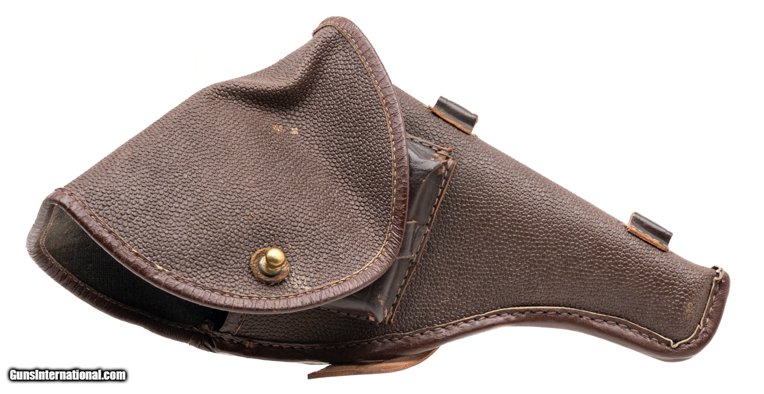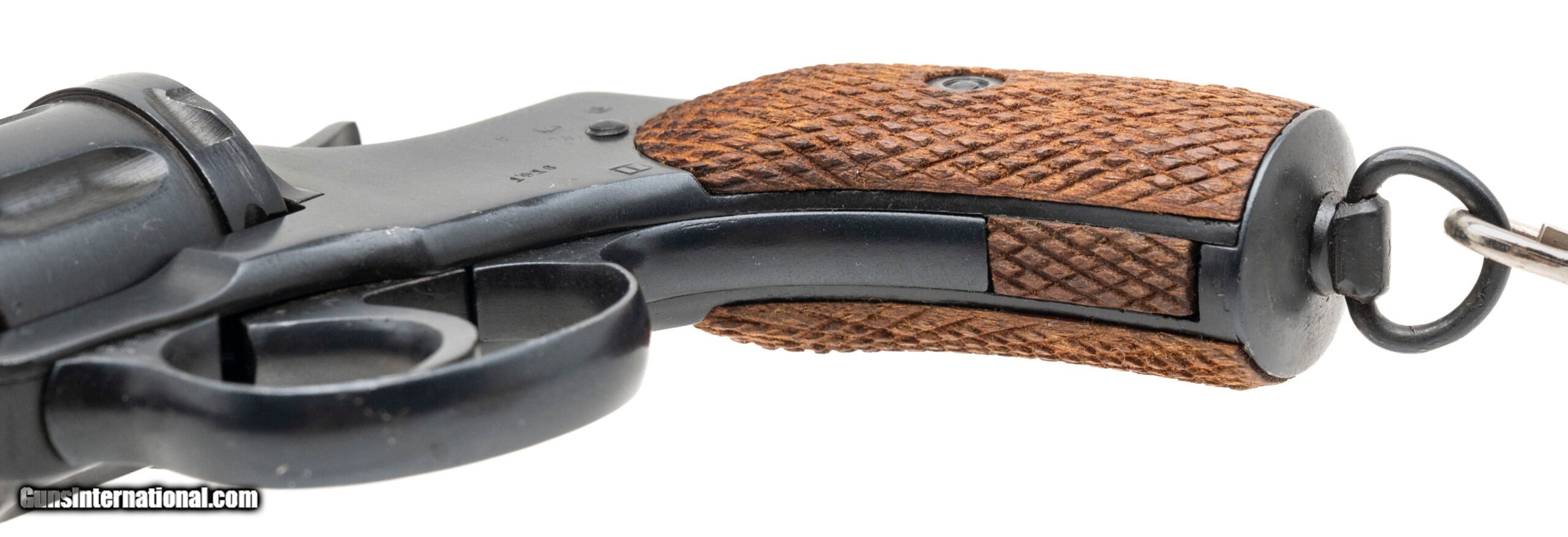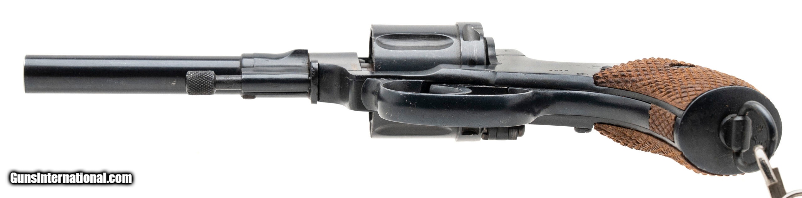 Description: "Serial No. 13476p, made in 1916, chambered in 7.62x38R with a 4 ½" round barrel. Revolver retains 98% of its arsenal refinish, with matching serial numbers throughout. Right side of the barrel is import marked. Grips are in excellent condition. Includes original lanyard and brown leather holster. Action indexes correctly with a tight lock-up. A strong example of a WWI-era Russian service revolver. SOLD Curio/Relic: Yes |