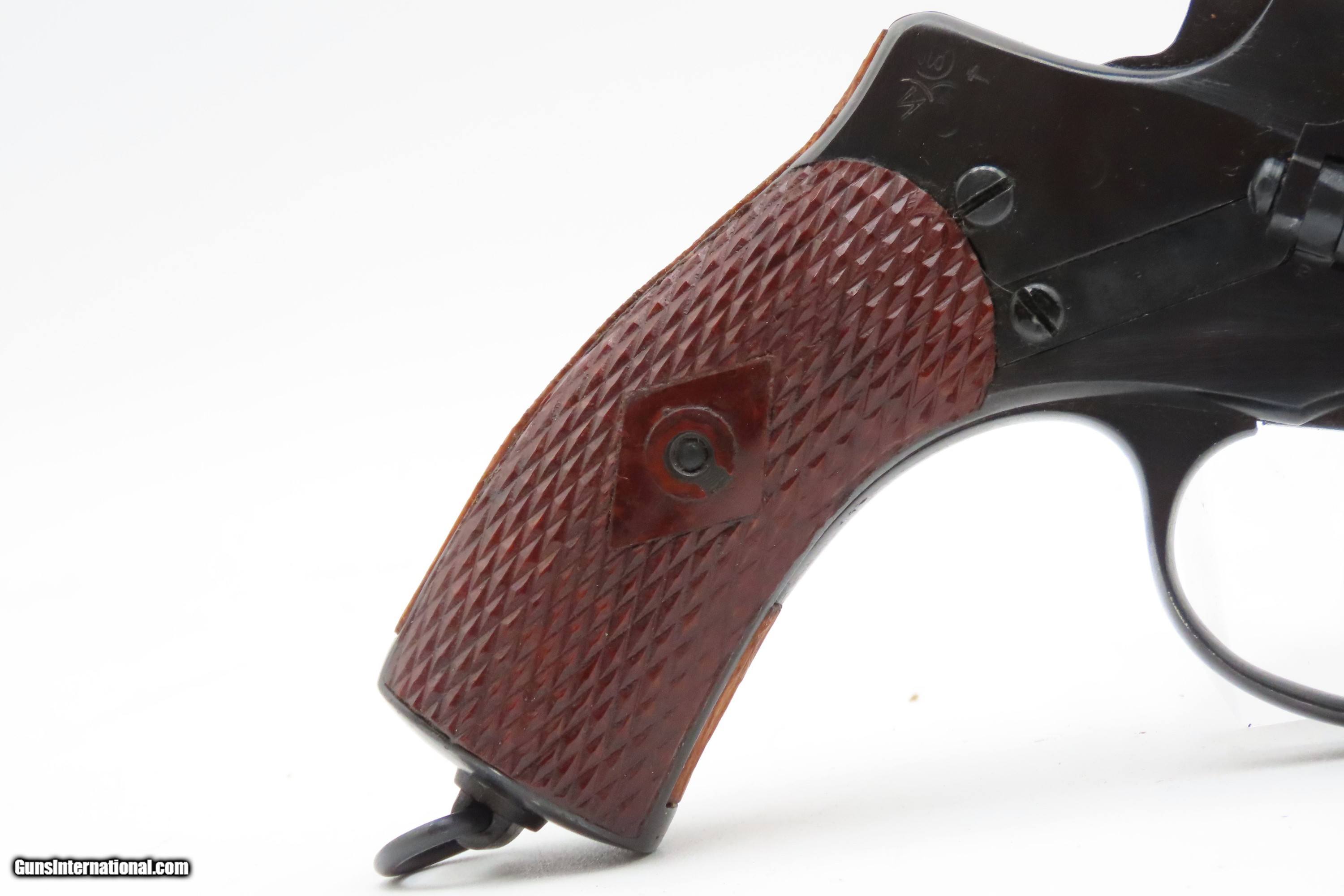 Description: RUSSIAN Pre-WW II Soviet NAGANT M1895 TULA Arsenal 7.62 Revolver w/HOLSTER Russian Sidearm Made in 1927 used into WORLD WAR 2 Here we present a C&R Soviet Russian Nagant Model 1895 Revolver made at the Tula Arsenal in Russia, circa 1927. The Nagant was designed by Léon Nagant, whose brother Émile had also taken part in designing the Mosin–Nagant rifle. The Nagant M1895 was adopted as the standard issue sidearm for the Imperial Russian Army and police officers, where it replaced earlier Smith & Wesson models such as the Model 3. Production began in Liège, Belgium, though Russia purchased the manufacturing rights in 1898, and moved production to the Tula Arsenal, and was soon producing 20,000 examples per year. This was the primary sidearm of the Soviet Union during the Second World War. This one bears the Tula arsenal mark and a date of 1927. The overall condition is good. This example is refinished. Excellent action. The bore is shiny bright with strong rifling. Legible markings. Import marked left frame. Fine grips. “1927” dated frame. The holster is in very good shape. Own the original! This firearm is classified as a Curio & Relic. Barrel is 4-1/2 inches. Caliber: 7.62x38mmR Nagant Overall condition as seen in photos. Very Fast. Very Safe. FREE SHIPPING. Will need to be sent to your local FFL or C&R licensee. This firearm is classified as a Curio & Relic. ancestryguns $1800 #250715 SOLD Curio/Relic: Yes |