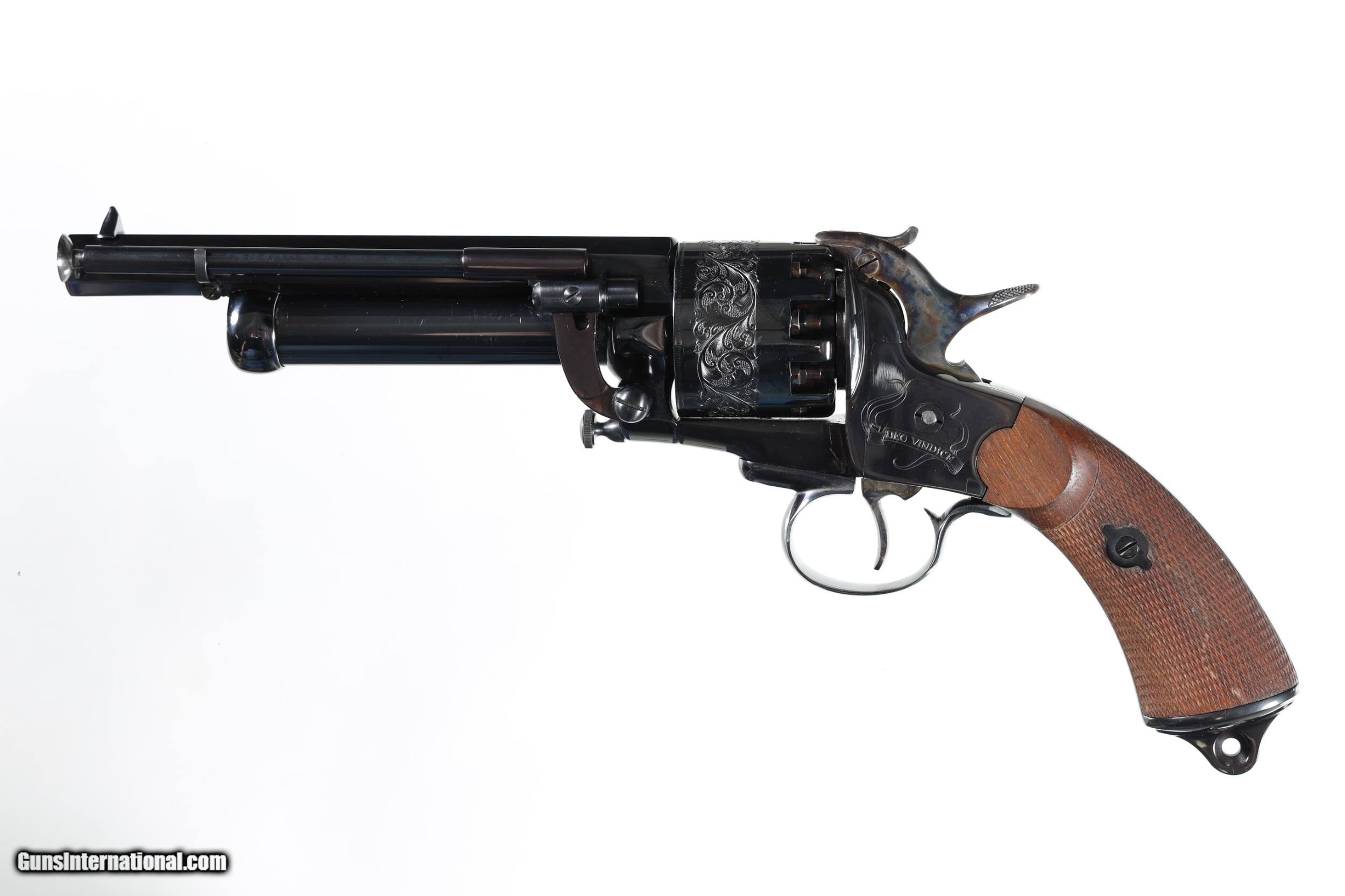 Description: Near new overall in appearance with possibly a collector type handling mark. "DEO VINDICE" marked on left side plate. Small spots of rust on the butt. With hardwood display case, papers and an unused brass bullet mold. Handling marks to outside of box. • Free Shipping, No Credit Card Fees. • Lay-a-way available for this firearm. • 1/3 Down, a 1/3 in 30 Days 1/3 in 60 Days. SOLD Antique: Yes Manufacturer: Navy Arms Model: Le Mat Serial Number: G119 Barrel Length: 6 3/4 |
