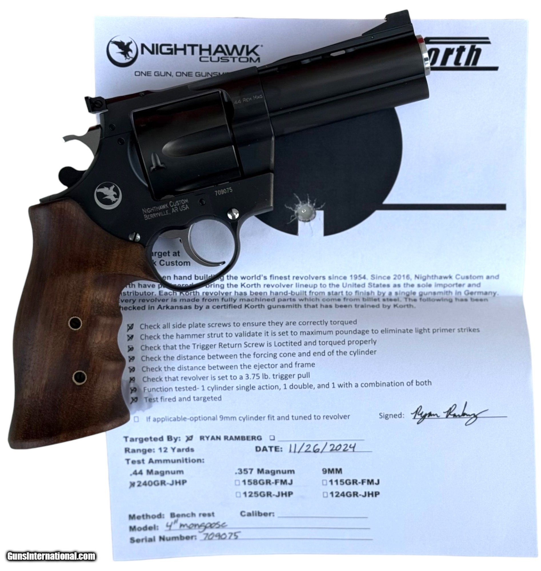 Nighthawk Custom Korth Mongoose 4" Barrel 44 Mag Revolver 1091