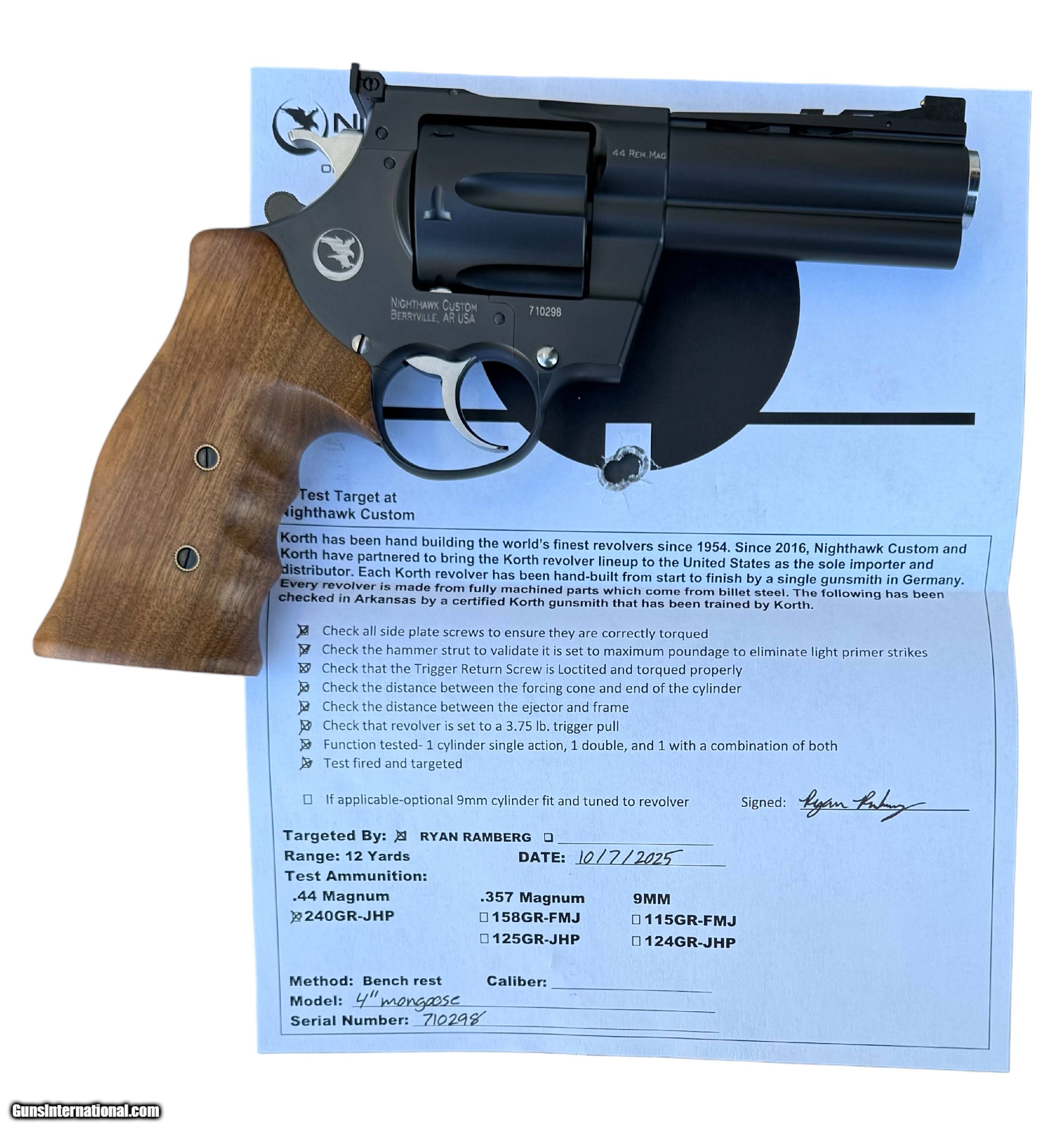 Nighthawk Custom Korth Mongoose 44 Mag 4" Barrel 6- Shot Turkish Walnut 1404