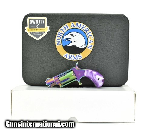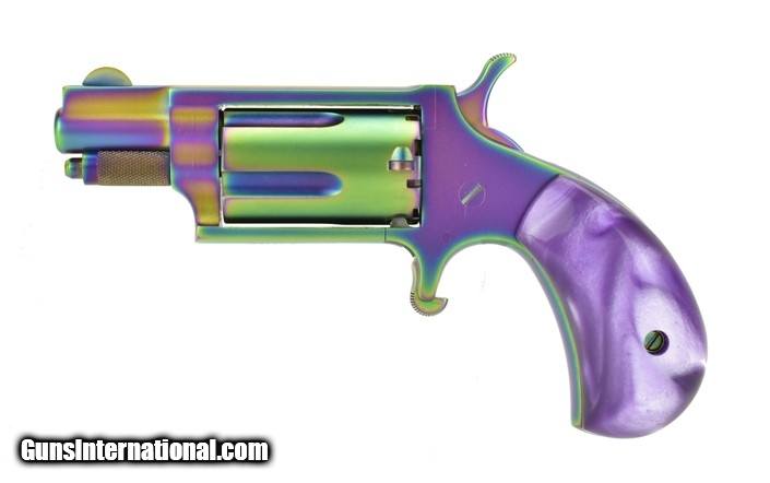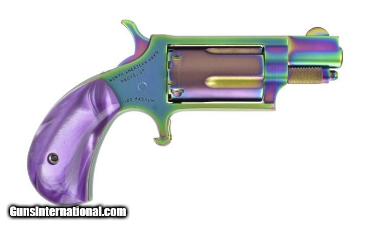 Description: NAA Mini .22 Magnum caliber revolver. .22 Magnum single action revolver with 1 1/8” Barrel, 5-shot capacity, Titanium rainbow coating, Pearlite grips and box. New.
