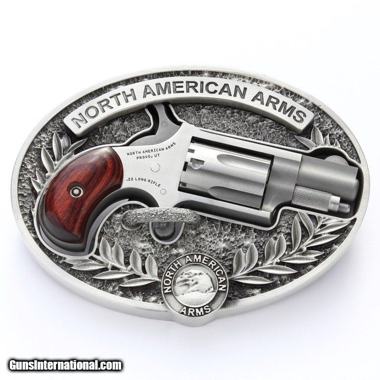 Description: Manufacturer: North American Arms Model: Mini-Revolver with Belt Buckle SKU: NAA-22LR-BBO Caliber: .22 LR Capacity: 5 Round Cylinder Barrel Length: 1.125" Stainless Steel Frame: Stainless Steel Included Oval Ornate Belt Buckle Sights: Fixed Grips: Wood Weight: 6.2 oz As with every NAA Mini-Revolver, the hammer need not rest on an empty chamber. Using the original half-way notch cylinder, the hammer may rest safely and securely without chance of accidental discharge. North American Arms' .22 LR can be used with all popular .22 LR ammunition, including .22 LR shot shells (called Snake Shot by some manufacturers). Attach this belt buckle to your favorite belt and you’ll feel comfortable knowing that you are protected by one of North American Arms Convenient, Reliable, Effective Firearms when and if the need exists. (Remember to have your concealed weapon permit!). SOLD |