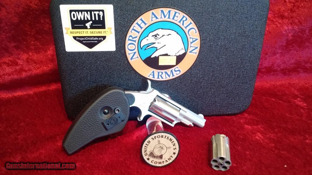 Description: North American Arms Revolver 22 magnum American Made Firearms are Great to keep in your Collection! This Stainless .22 Magnum is crafted by North American Arms of Provo, UT USA. Comes with a Textured Holster that is Designed to be the Grip to help enhance your handling and comfort. Comes with Two cylinders, The Holster is also the Grip!, and Locking Metal Box