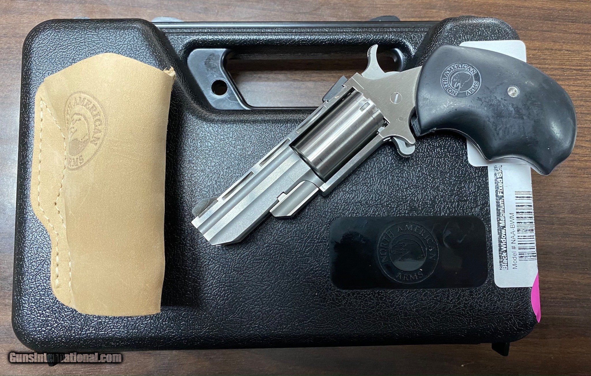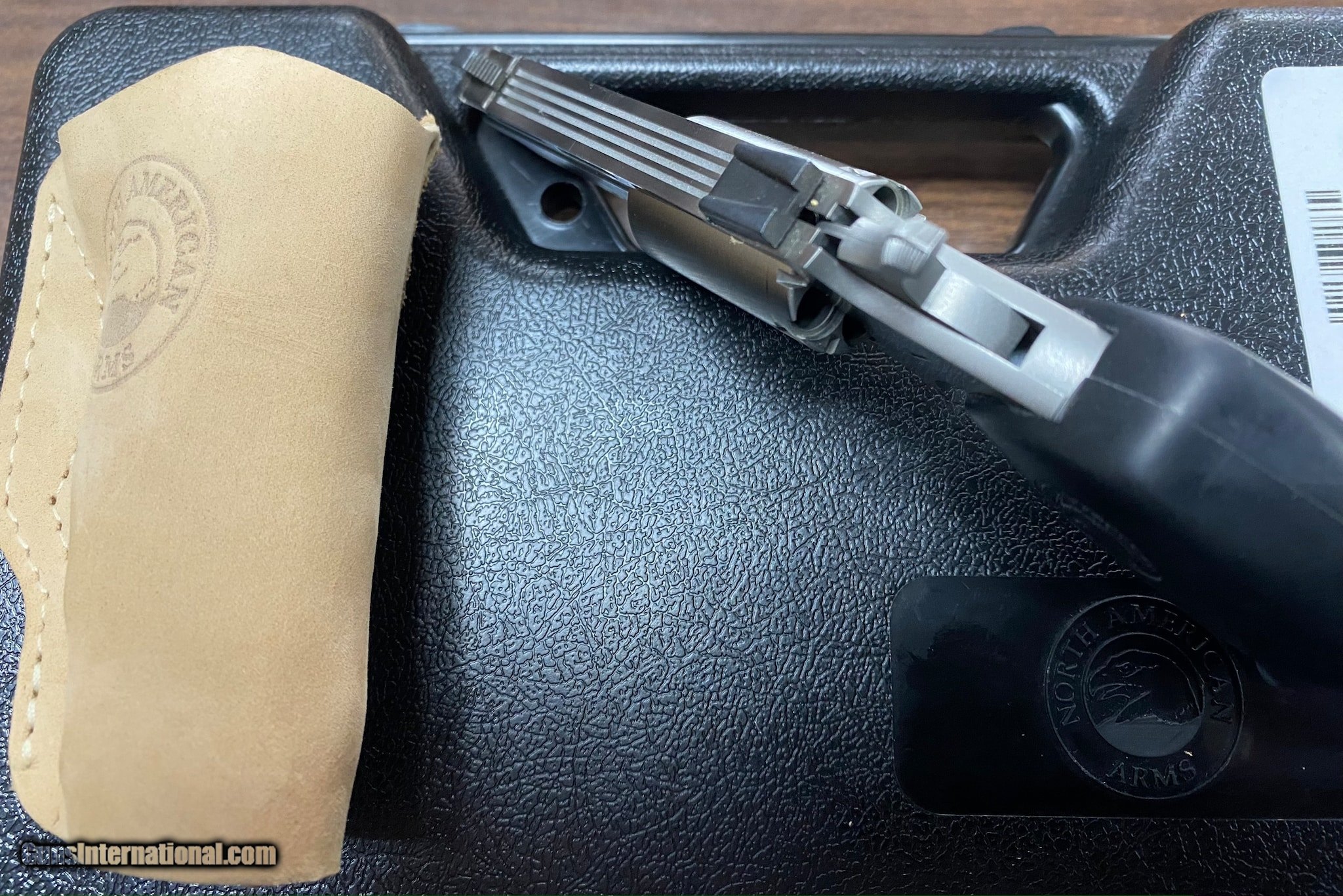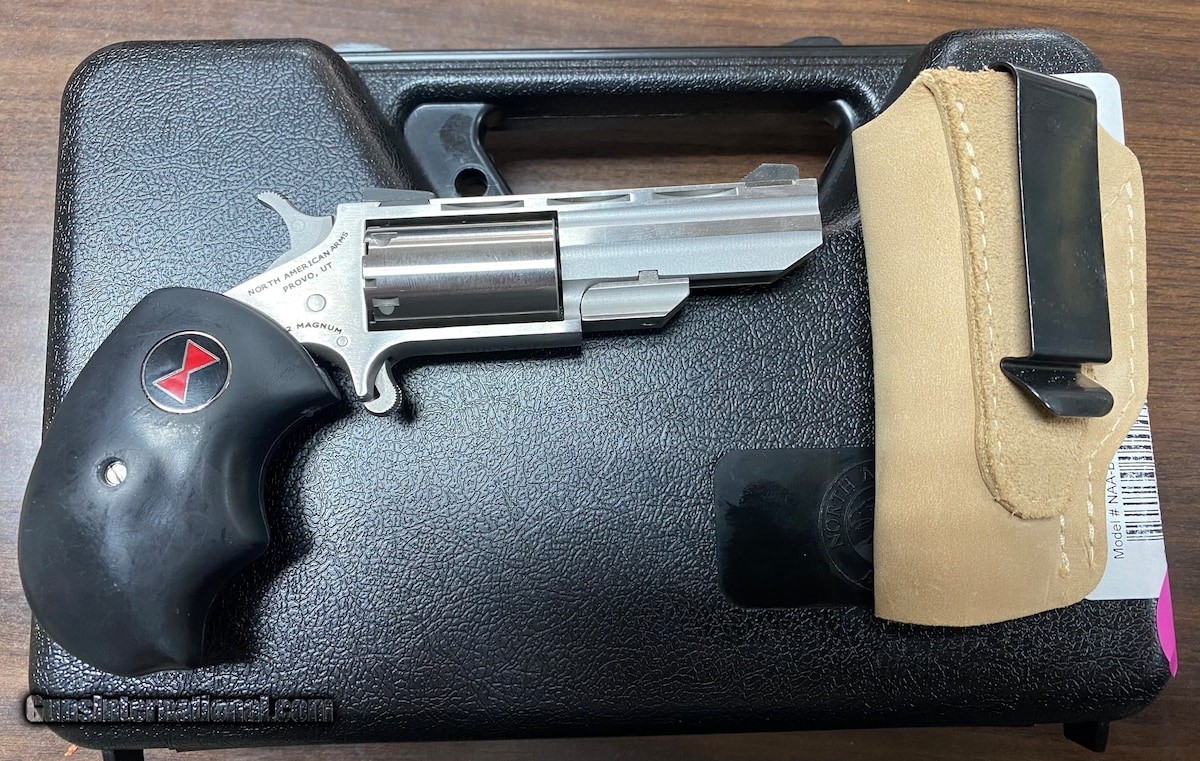 Description: Guns Listing ID: 741422 COMES WITH LEATHER HOLSTER AND ORIGINAL BOX. SLIGHT SINGS OF WEAR FROM USE. SOLD Manufacturer: NORTH AMERICAN ARMS Model: BLACK WIDOW FS Caliber Info: .22 WMR Condition: Used - Non-Certified Barrels: 2" barrel |
