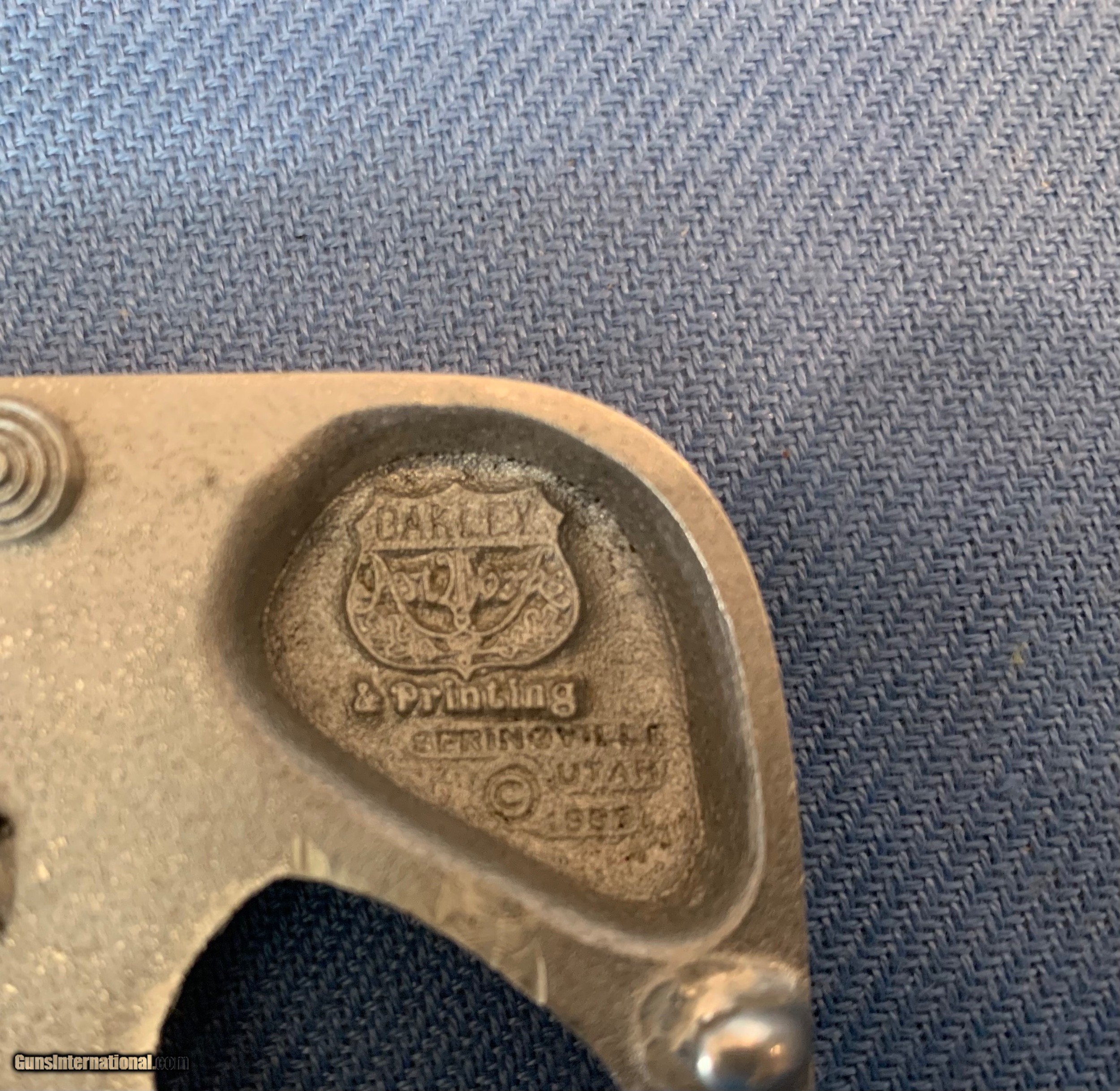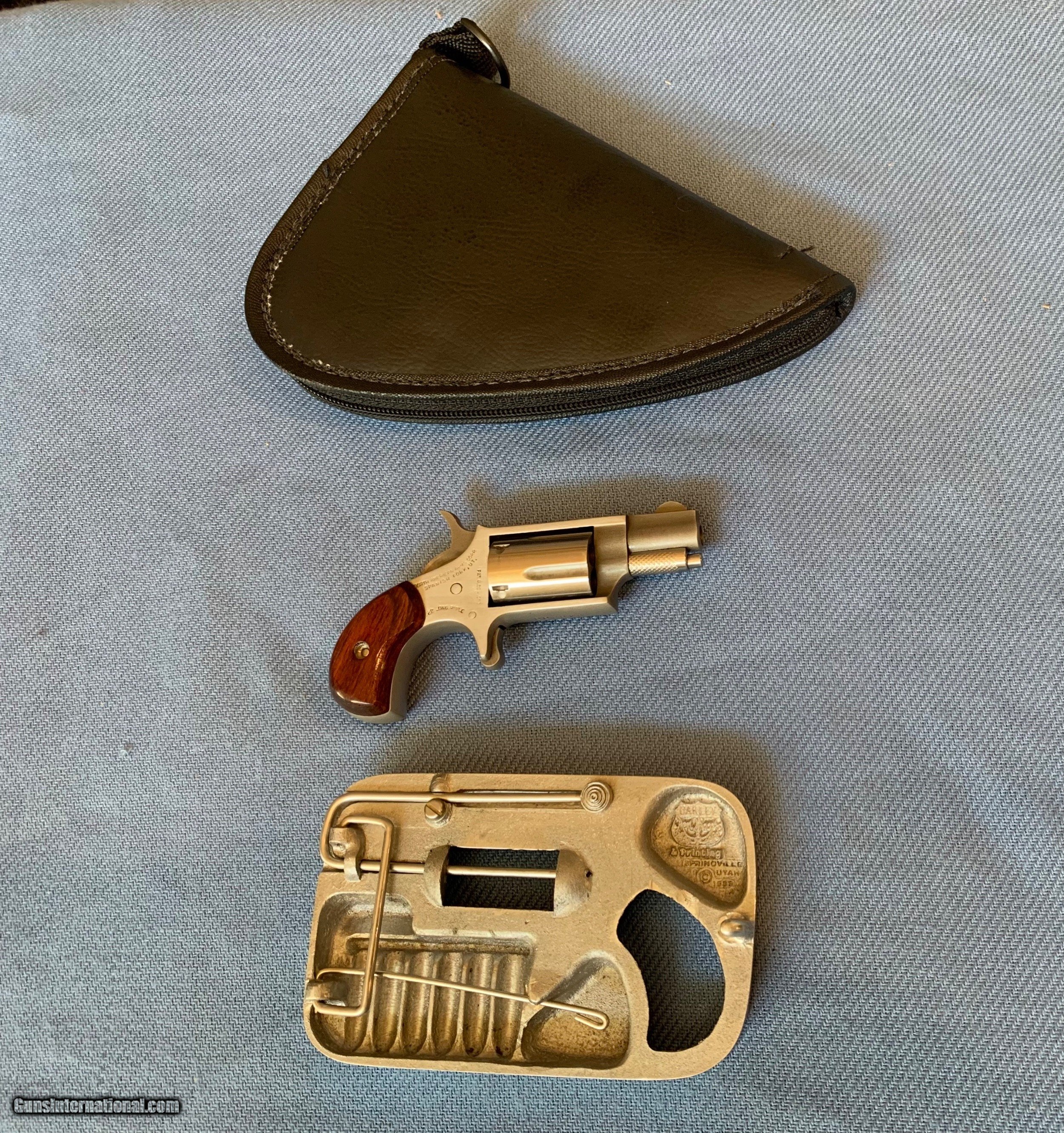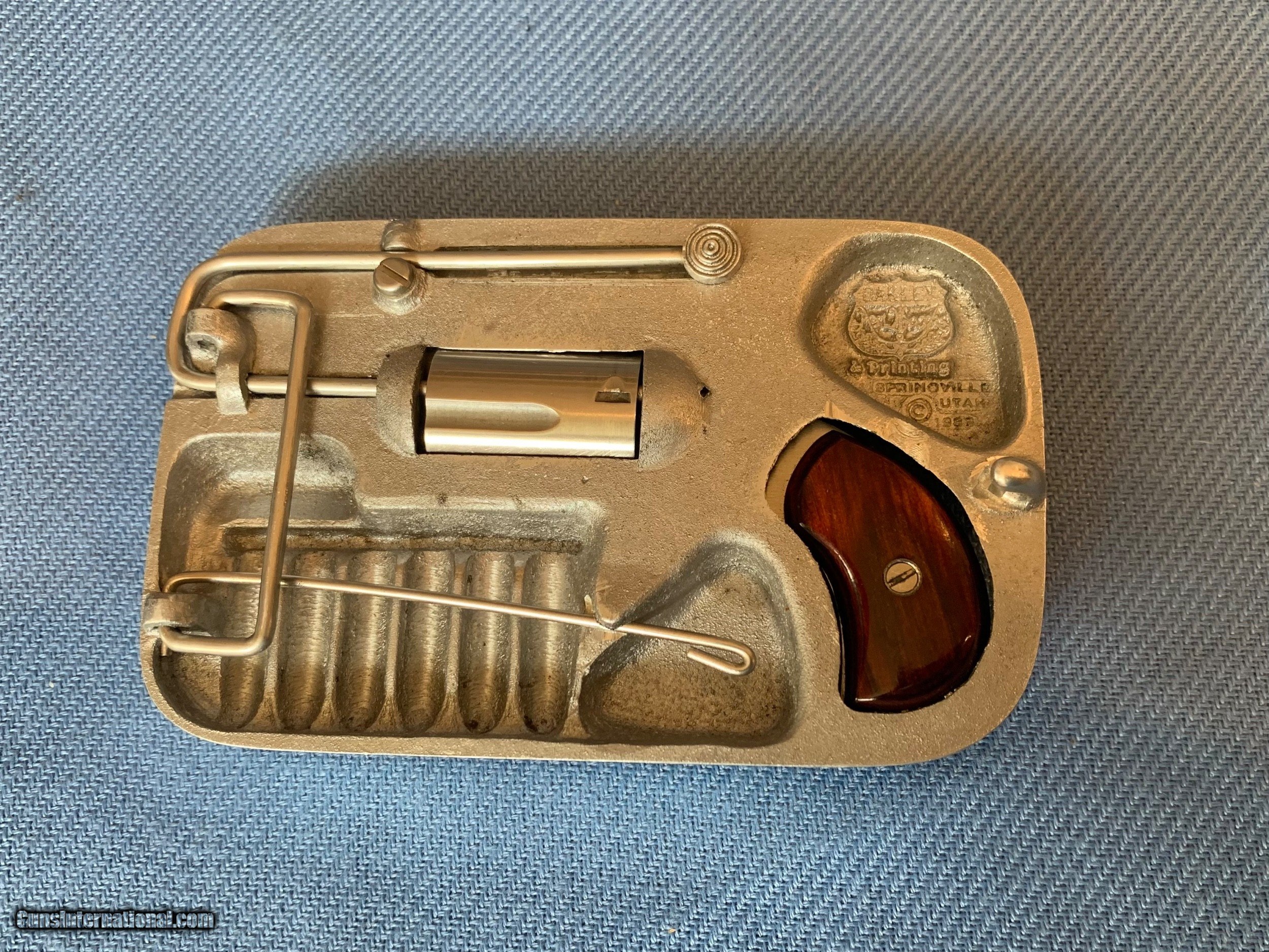 Description: Here's a Early North American made in Spanish Forge , Utah . Rare Smallest 22 Long Rifle they made in. 1 " Barrel! Rare gun made for a Genuine Quality Turquoise in layer buckle ! Ease release to get revolver out Quickly! Serial number G48200 . Excellent example of a rare buckle gun North American in a 1" barrel in 22 long rifle! Gun is in excellent plus original condition! Bore and mechanics are in Excellent Plus Condition! Gun is in excellent working order. Buckle holster is in excellent plus condition! Super nice set ! Comes with a original North American Pistol case with logo ! Please review my photos and please email me with any questions? 3 day inspection as allways! Thank you for looking, Little Jo SOLD Handgun Caliber: .22 Long Rifle Manufacturer: North American-Spanish Forge , Utah Model: Buckle gun Serial Number: G48200 Barrel Length: 1” Condition: Mint |