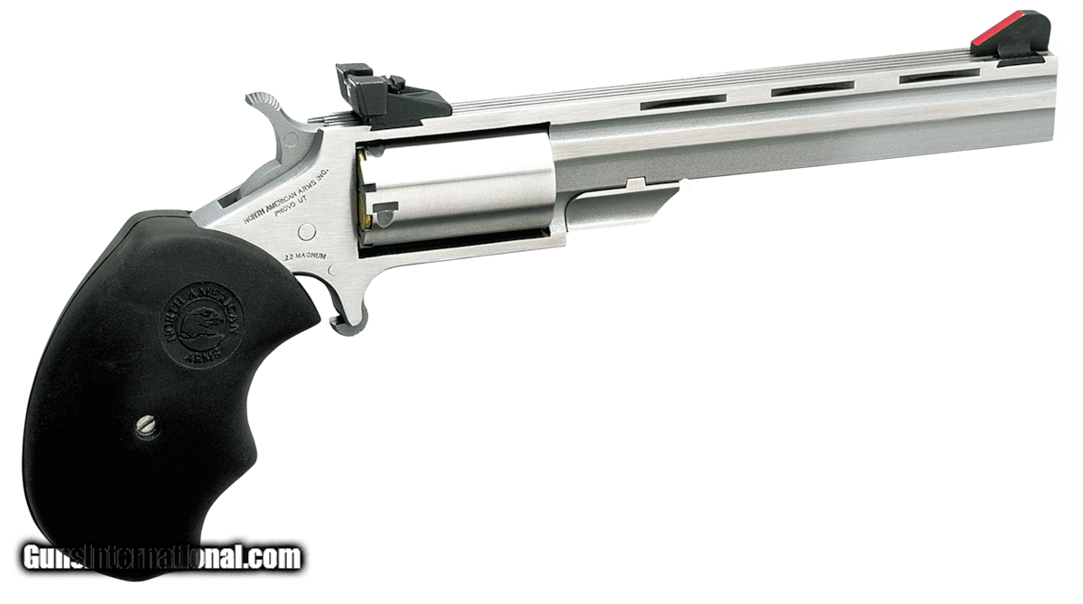 Description: Guns Listing ID: 381463 The North American Arms Mini-Master is a five-shot revolver that evolved from the companys popular 22 Mag frame series resulting in increased stability and accuracy. Features include a 4 stainless steel heavy vent barrel bull cylinder and oversized textured rubber grips. The Mini-Master is chambered in 22LR or 22 Mag has a length of just under 8 width of less than an inch and a weight of 10.7 ounces. Details NAA MMTL Magnum Mini Master Single 22 Long Rifle 4 5 Black Rubber Black SOLD Manufacturer: NORTH AMERICAN ARMS Model: MINI MASTER Caliber Info: .22 LR Condition: new Barrels: 4 BARREL |