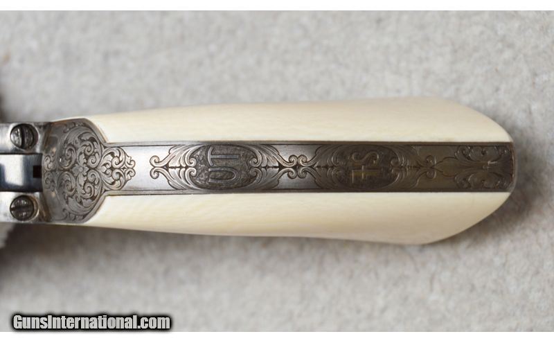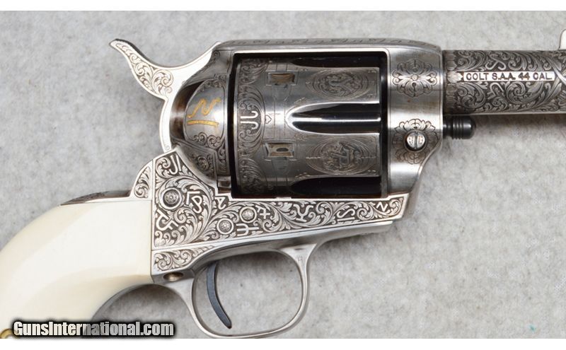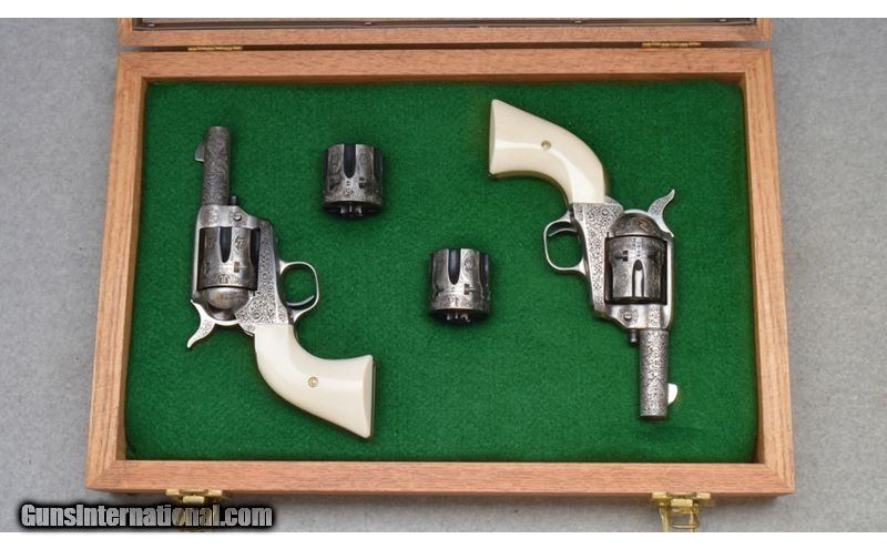 Description: Pair of Colt Sheriff's model chambered in .44-40 Winchester is in excellent condition. Includes an extra cylinder for each chambered in .44 special. They are both elegantly engraved with a floral pattern and cattle brands all over. The left side of the frame behind the cylinder has an engraving of a cowboy lassoing a calf. On the right side of the frame behind the cylinder there is a gold engraving of a rattlesnake and a golden banner below it with the name Neary. Under the barrel on the frame it has the master engravers signature R. Swartley. The second revolver does not have as many of the small engravings on the screws like the other one. It has the same golden inlays on the right side of the frame. On the left of the frame behind the cylinder has a cowboy chasing a calf. The master engravers signature R. Swartley is on the back of the right side of the frame. .44-40 Winchester SOLD Metal Condition: Excellent condition Barrels: 3 Butt Pad: Smooth grips Weight: 2 lb 1 oz Item Location: Fort Worth, TX |
