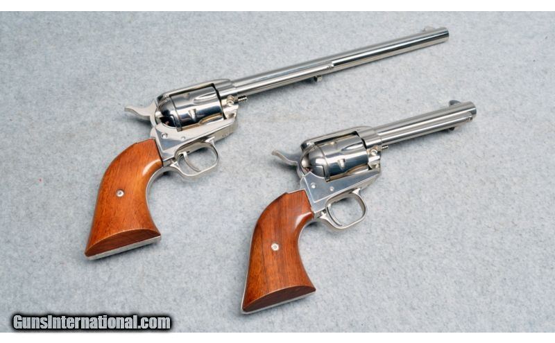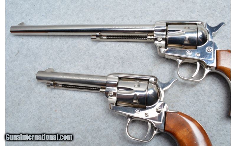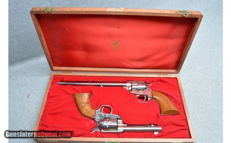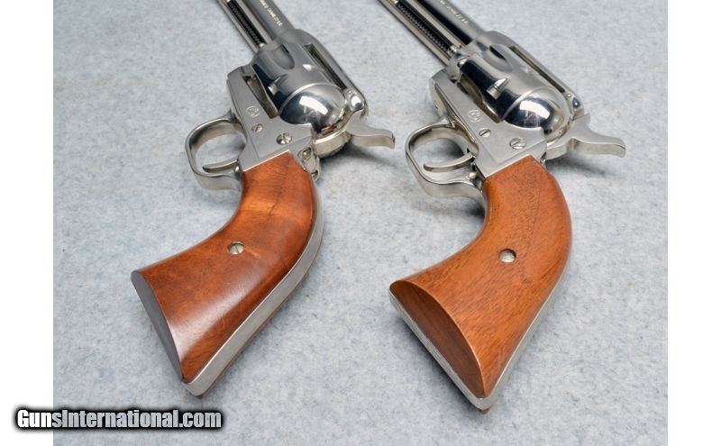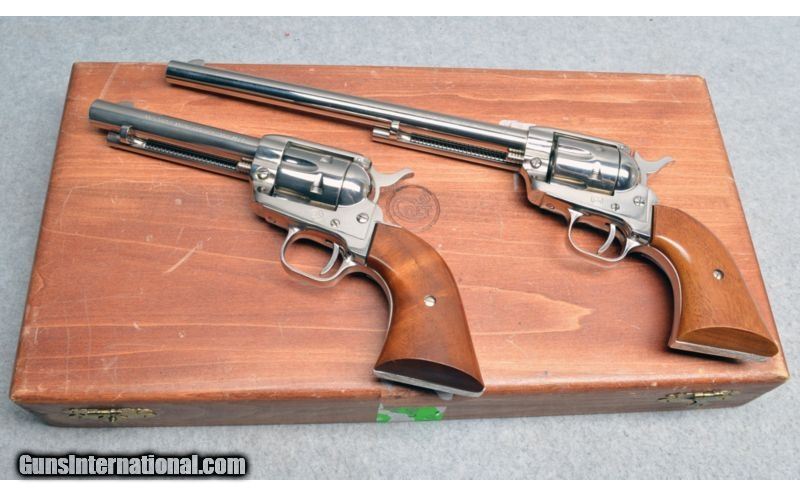 Description: The Single-Action Frontier Scout was manufactured circa 1964 is a K suffix gun. The SA Buntline Scout with 9-1/2" barrel was manufactured circa 1963 and is K suffix gun. Both of these revolvers are .22lr. They are in a high polished nickel finish with smooth walnut grips. Both are in 98%+ condition. The walnut presentation case has some scratches and dings. The Colt logo is wood burned into the top of the case. The K serial numbered Scouts had zinc alloy frames, grip frames and loading gates which were much heavier than the aluminum ones. The K guns were bright nickel plated, available in .22 LR, .22 Magnum and .22 CAL (shipped with .22 LR and .22 Magnum cylinders) and had 4 3/4 inch (Frontier Scout) or 9 1/2 inch (Buntline Scout.) SOLD Curio/Relic: Yes Manufacturer: Manufactured circa 1963. Caliber Info: .22 caliber Chambers: 6 shot single action revolvers. Metal Condition: Very good with few handling marks. Wood Condition: Grips are in excellent condition. Bore Condition: Bright and shiny. Barrels: 4 3/4 inch and 9 1/2 in bright nickel polished barrel. Triggers: Bright nickel polished single-action trigger. Stock: Smooth walnut grips. Sights: Blade front sight with grooved rear sight. Extras: These Colt revolvers come in a nice fabric lined Colt presentation case. Item Location: Hazelwood, MO |