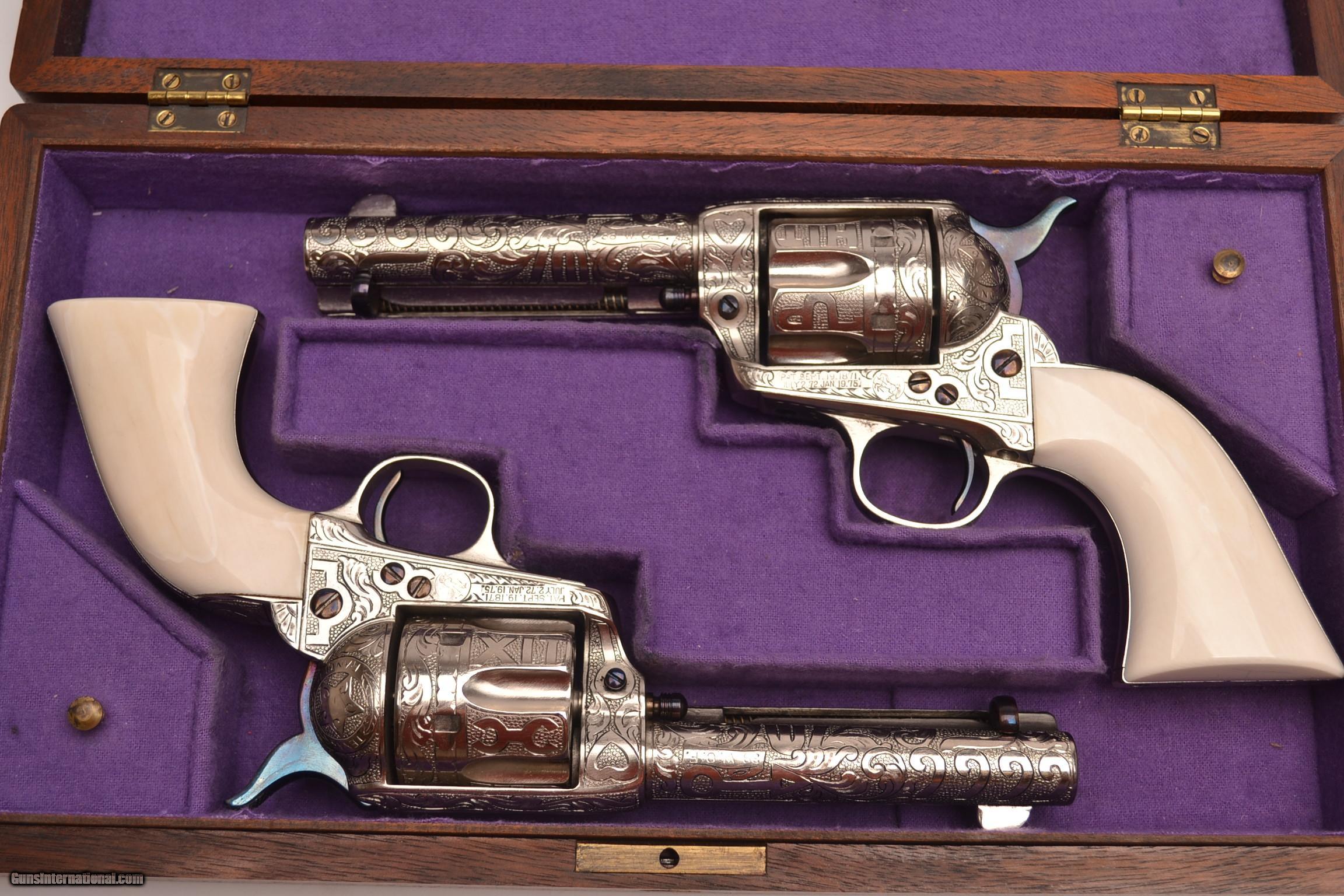 Description: COLT SAA Pair .38 WCF 4 ¾” barrels, Matching pair of Colt Single Action Army revolvers numbered 1 & 2 on the loading gate, engraved and signed by DW Harris, full coverage cattle brand designs with punch dot backgrounds, nickel finish, ivory grips, guns remain in excellent condition, excellent collector condition, cased. Inv# 31443 - 31444 $17,500.00 2lbs. 5oz. SOLD |