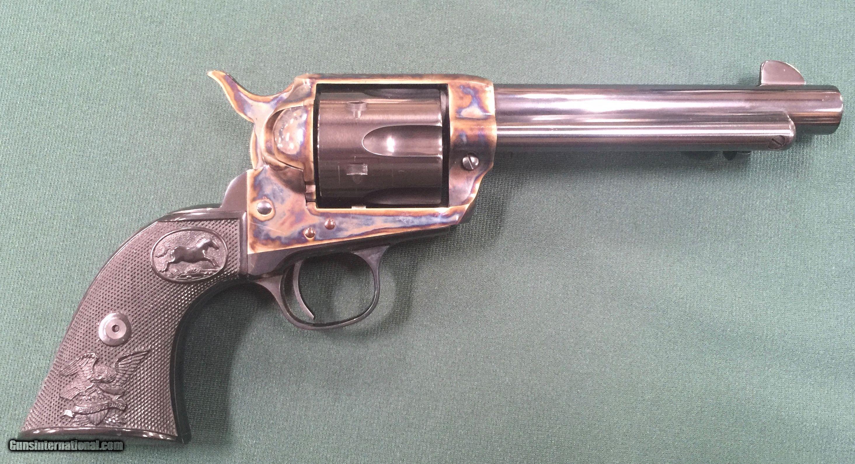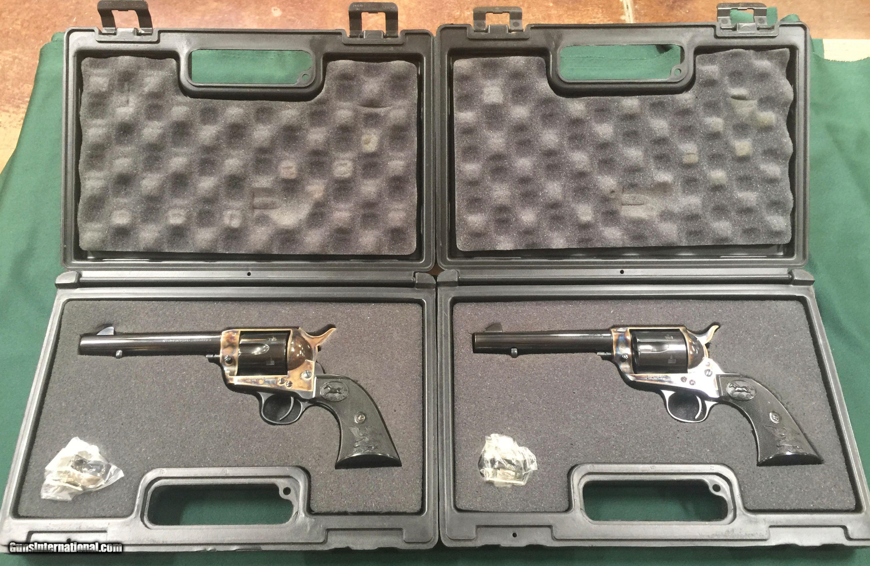 Description: INCREDIBLE consecutive serial numbered pair of 45 long colt revolvers! New and unfired American Western Arms Peacekeeper revolvers with factory cases. These revolvers are factory tuned as described on the boxes. High polished blue and case hardened. SN 2300 and 2301. Listen folks, the actions are as smooth as butter!! Sold as a pair only. SOLD |