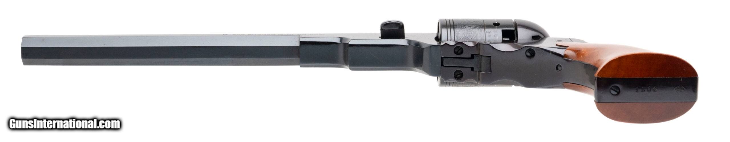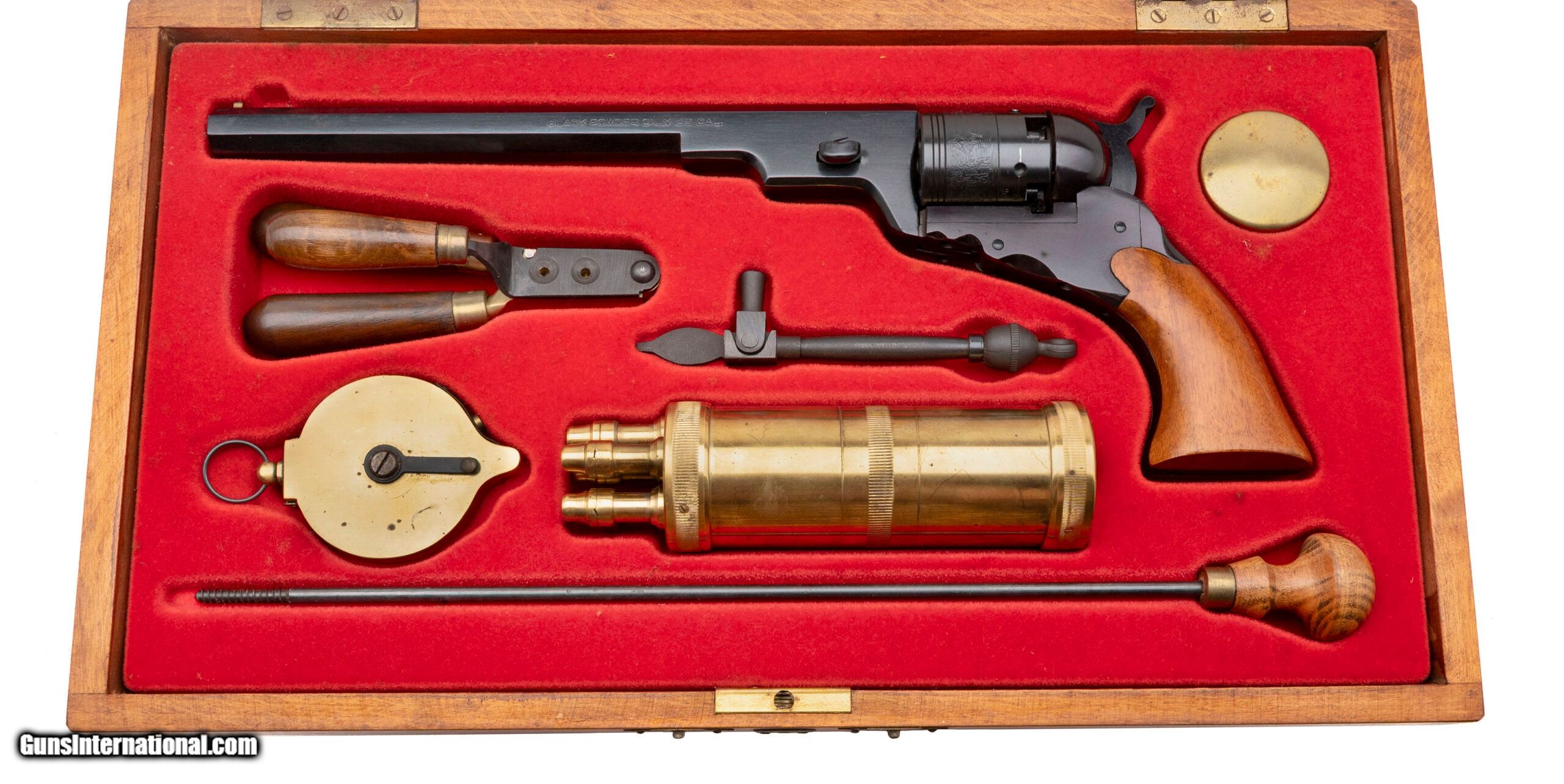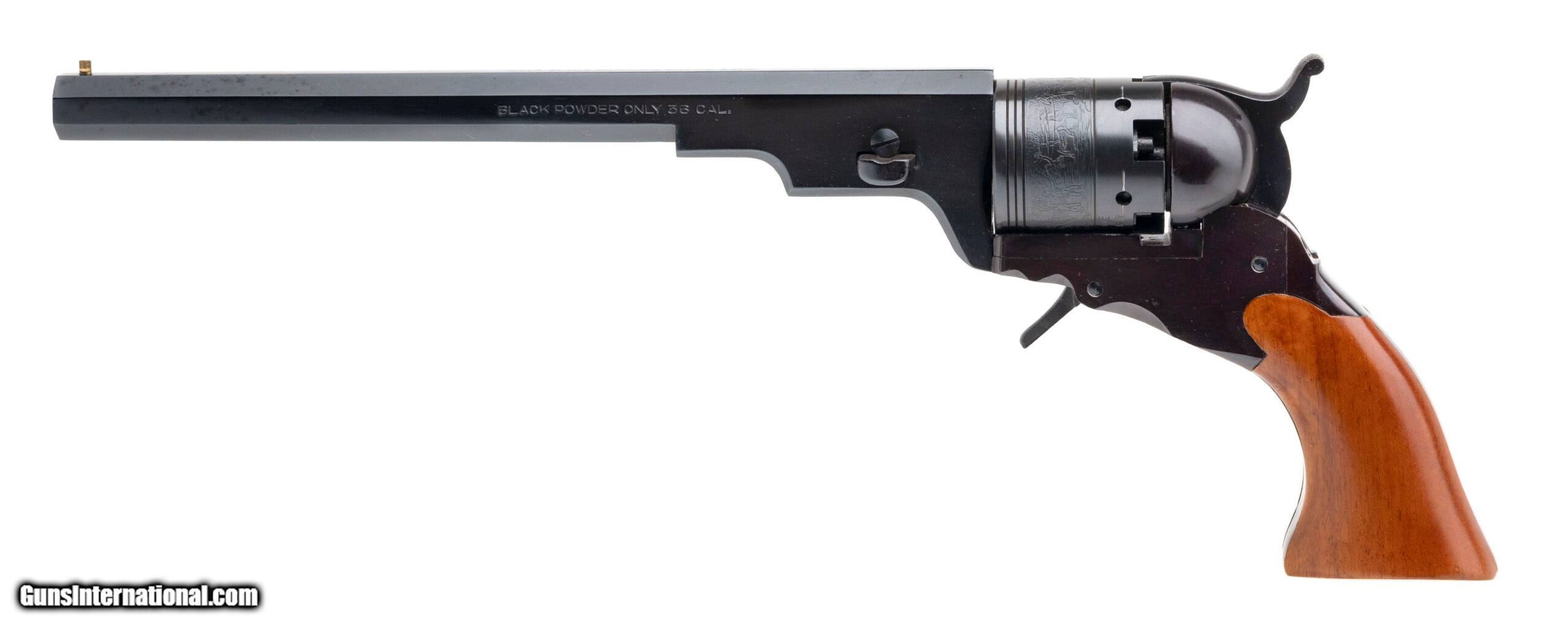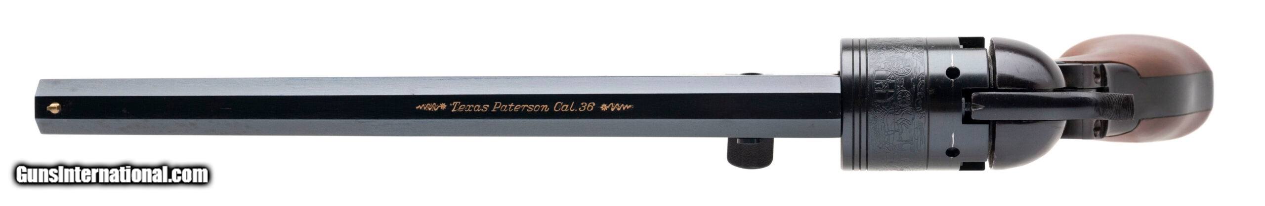 Description: "Sn: 1902 modern production made in Italy. Copy of the original Colt Patterson. 36 caliber percussion revolver with a 9" octagon barrel, 5 shot etched cylinder, blued finish and walnut grips. Overall in very good condition with some light patina on the barrel. Comes with wood presentation case and accessories. SOLD |