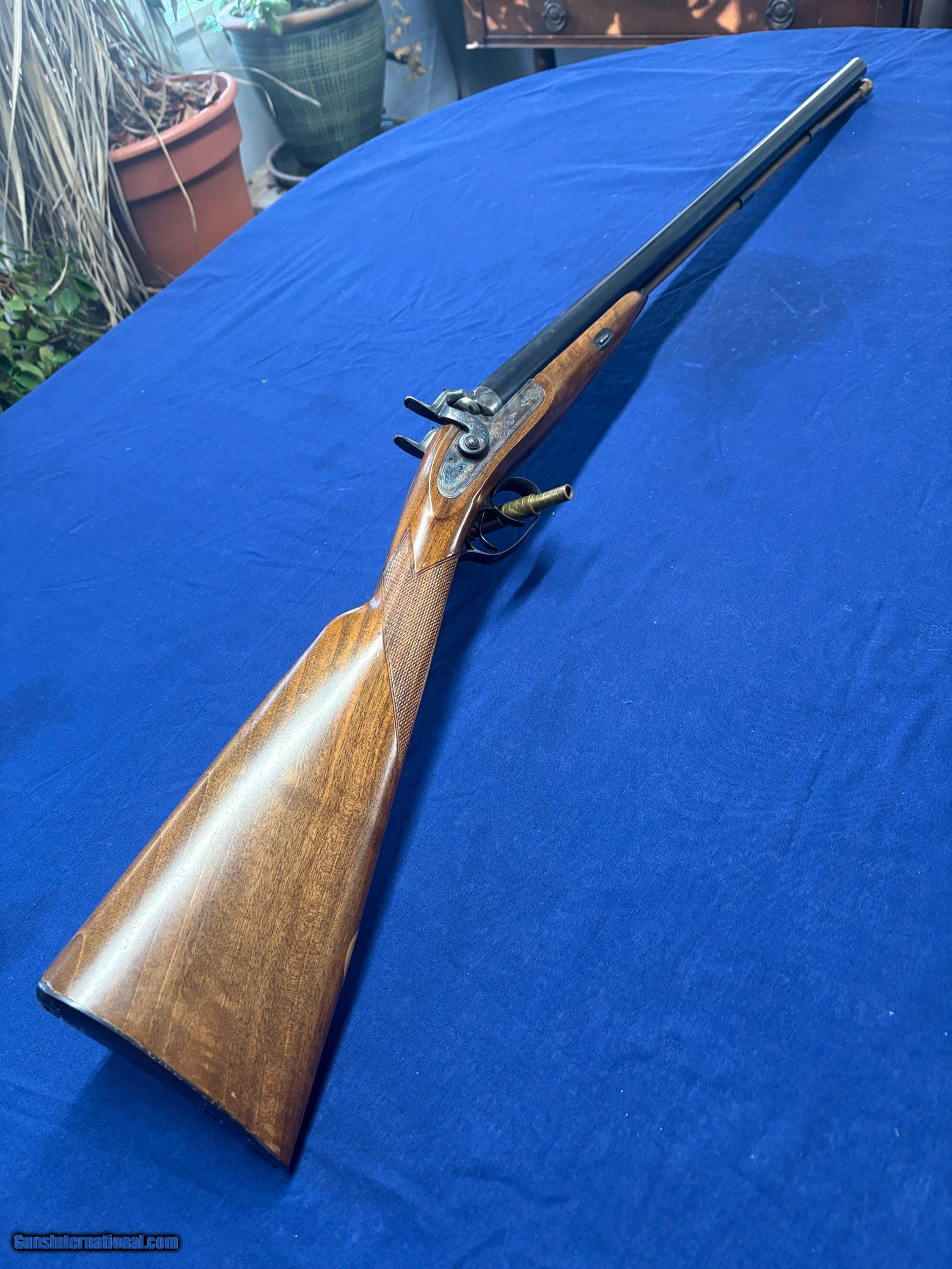 Description: This is a nicely made and finished 12 gauge double barrelled muzzle loading shotgun as made by Pietta in Italy and imported by Navy Arms, circa 1980...The 28" barrels are not choked and are proofed for 1 1/4 oz. black powder loads...141/4" length of pulll with stock drops of 1 1/2 and 2 3/4"...Weighs 7 pounds 4 ounces...Fine lock work and fine fit and finish make for a very attractive gun...Excellent overall condition, with a little fine rust forming on exterior of barrels...Bores in excellent condition, with little evidence of firing...FFl or photo id required to purchase, depending on your state laws... Price: $850.00 Contact Seller |