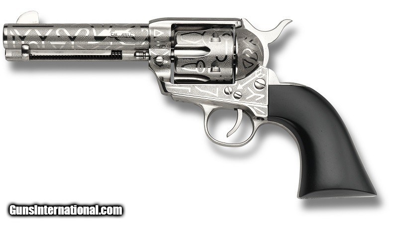 Description: Manufacturer: E.M.F. Model: 1873 GWII Deluxe Cattlebrand Sku: GW45NECB434NMUB Caliber: .45 LC Capacity: 6 Rounds Barrel Length: 4.75" Frame: Engraved Nickel Grips: Ultra Black Varnished Wood Sights: Fixed Ranching in the western United States is derived from vaquero culture. Throughout most of the 1800s, ranchers in the United States set their cattle to roam the prairie, historically referred to as "open range”. Livestock was usually branded, with distinct symbols, so lost cows - either through wandering animals or cattle rustlers - could be returned to their rightful owner. Manufactured and engraved by FAP F. LLI Pietta in Italy, then nickel-plated, the GWII "Cattlebrand" combines beauty and class, making this firearm a "must have" for any collection. The engraving is a cattlebranding pattern and covers 95% of the pistol. The black varnished wood grip gives a beautiful contrast to the bright nickel. SOLD |