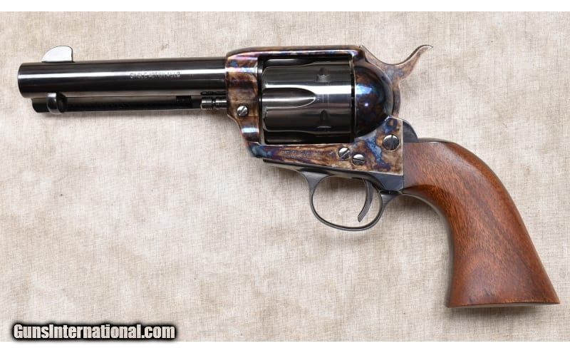 Description: Nice, short barrel SAA reproduction, featuring case colored frame, and blued barrel/cylinder, It appears unfired and includes the box. .45 Colt SOLD Chambers: 6 rounds Metal Condition: Excellent. Wood Condition: Excellent. Bore Condition: Shiny and bright with good rifling. Barrels: 4-3/4 inches Triggers: Factory single action trigger. Butt Pad: Smooth walnut Weight: 34 ounces Sights: Fixed blade and notch Item Location: Rogers |