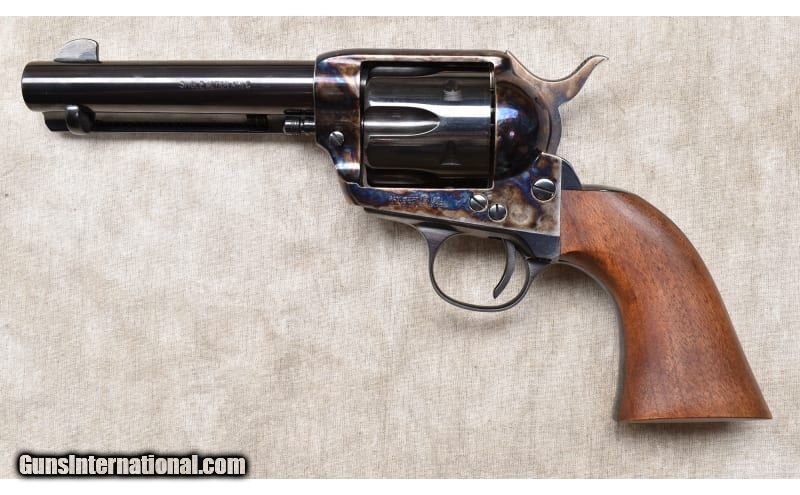 Description: Nice, short barrel SAA reproduction, featuring case colored frame, and blued barrel/cylinder, It appears unfired and includes the box. .45 Colt SOLD Chambers: 6 rounds Metal Condition: Excellent. Wood Condition: Excellent. Bore Condition: Shiny and bright with good rifling. Barrels: 4-3/4 inches Triggers: Factory single action trigger. Butt Pad: Smooth walnut. Weight: 34 ounces Sights: Fixed blade and notch Item Location: Rogers |
