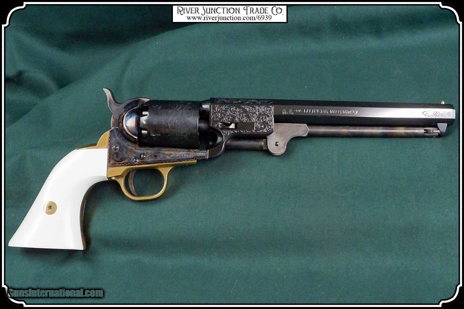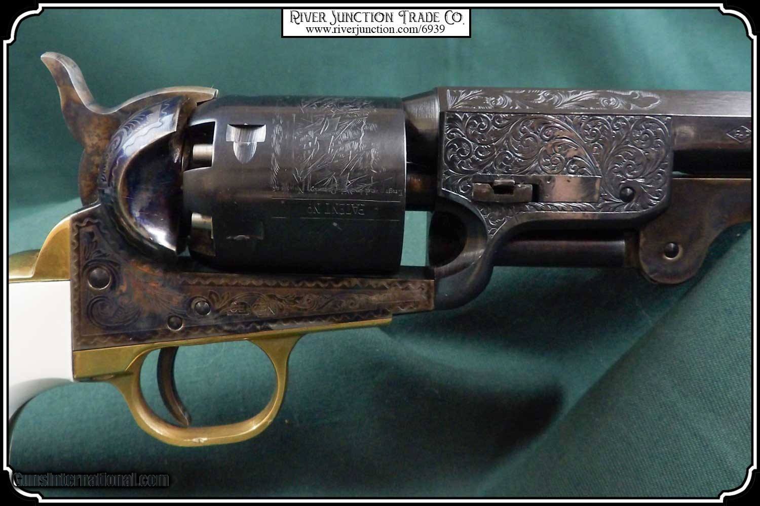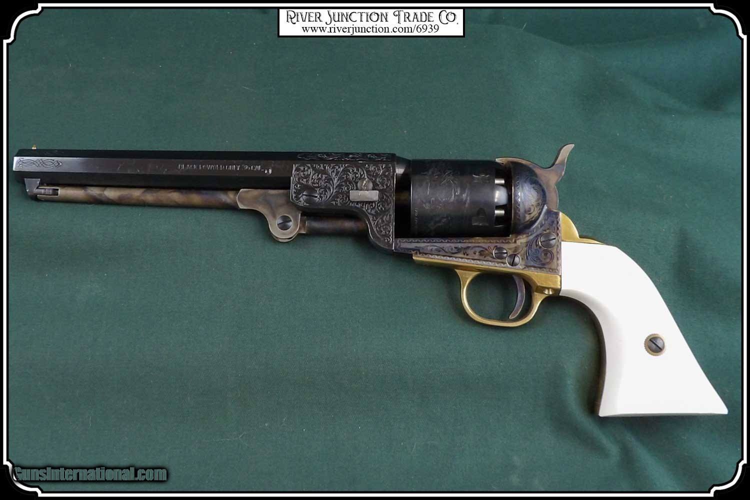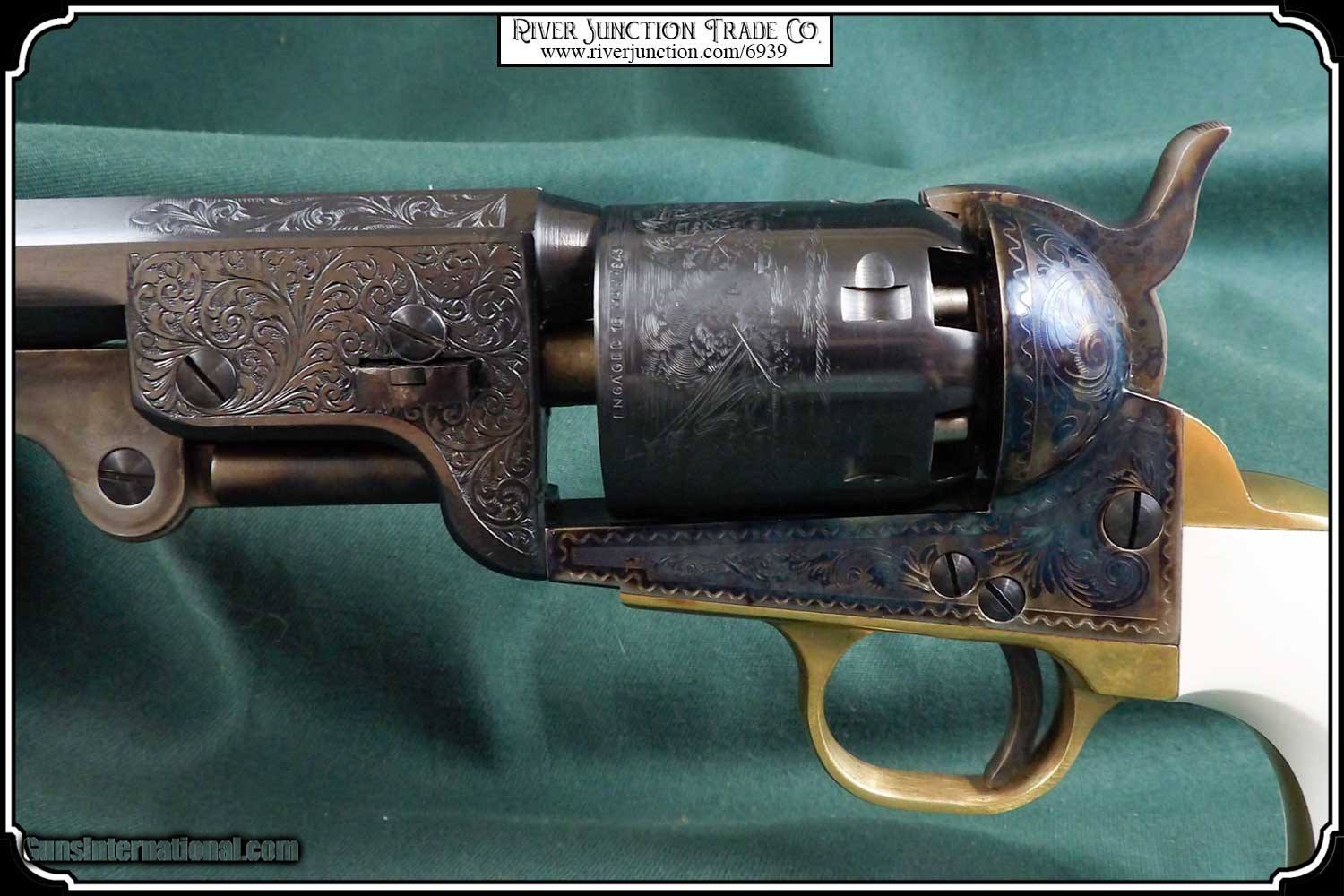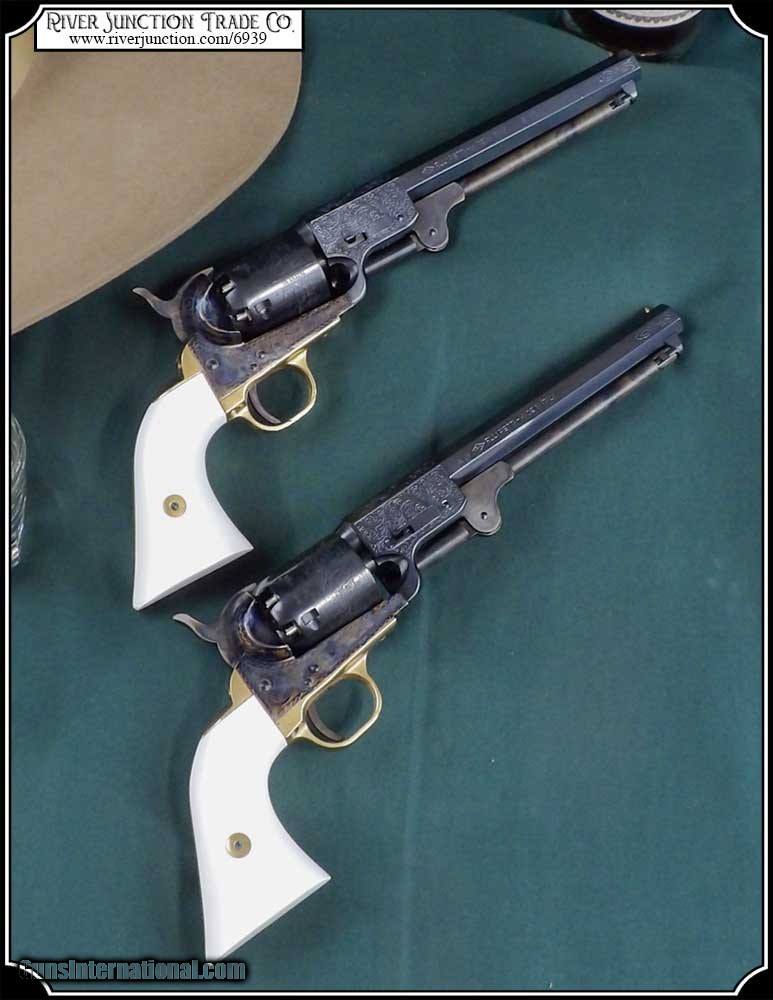 Description: A very popular revolver for its time, the model 1851 Navy revolver was adopted by both the U.S. and British military. This revolver received its name from the depiction on the cylinder of the Texas Navy's victory over the Mexican fleet in 1843. These 1851 Navy Deluxe Engraved Black Powder Pistols are high-quality, working reproduction pieces that abounds with incredible detail, making them a must-have, whether you’re a muzzleloader enthusiast or a historical firearms collector. These are .36 caliber, black powder pistols with detailed engraving, casehardened steel frames with a 7 1/2” blued barrels and a faux ivory grips. This pair is very much like the revolvers Wild Bill Hickok carried. SOLD |