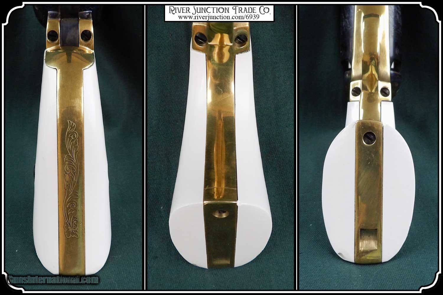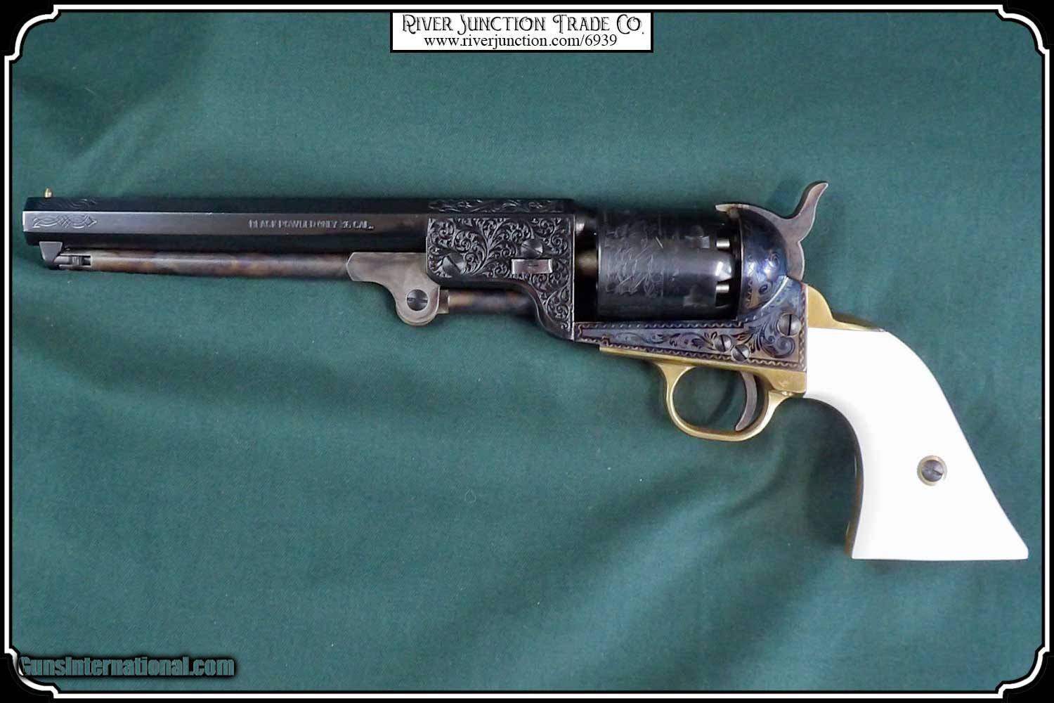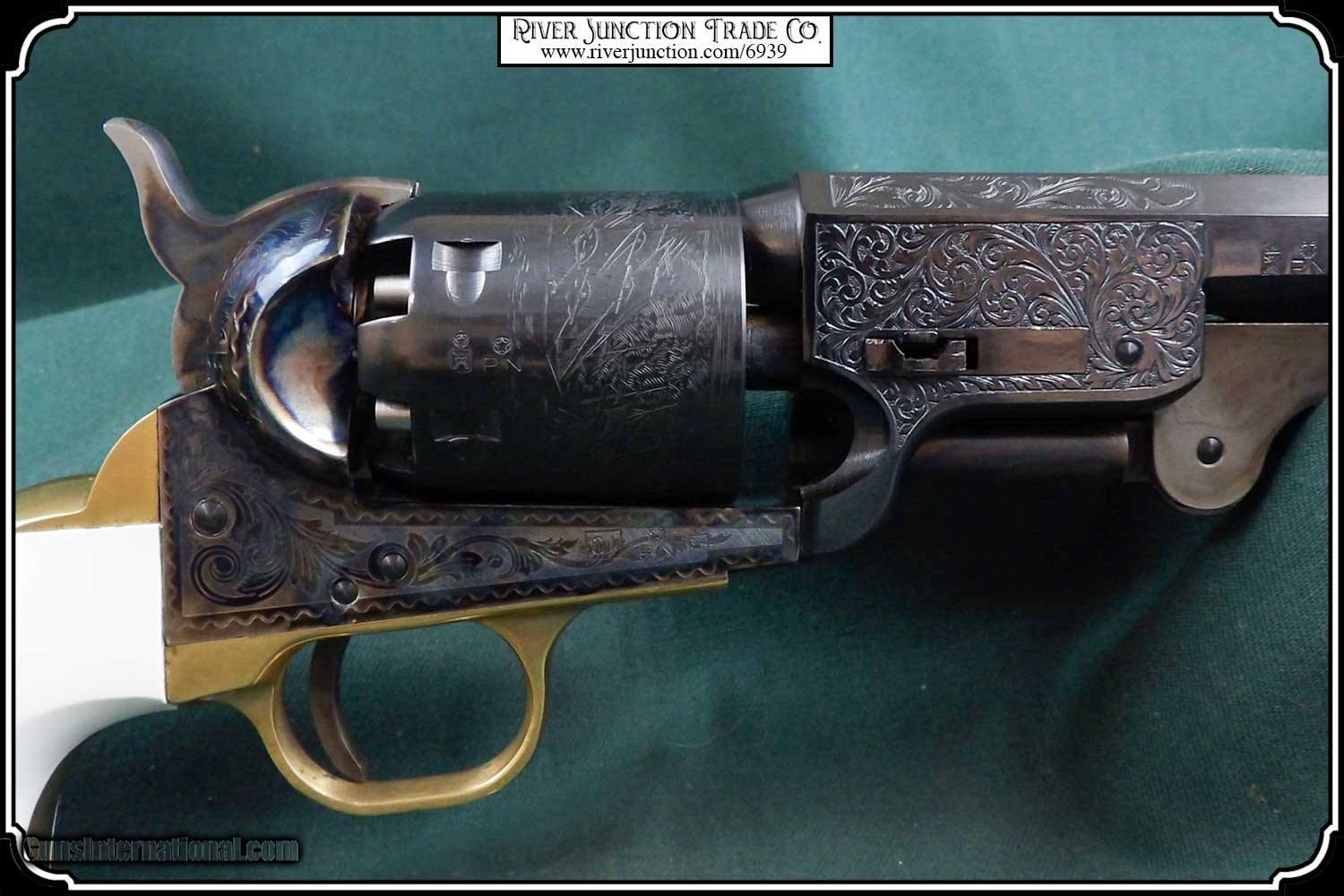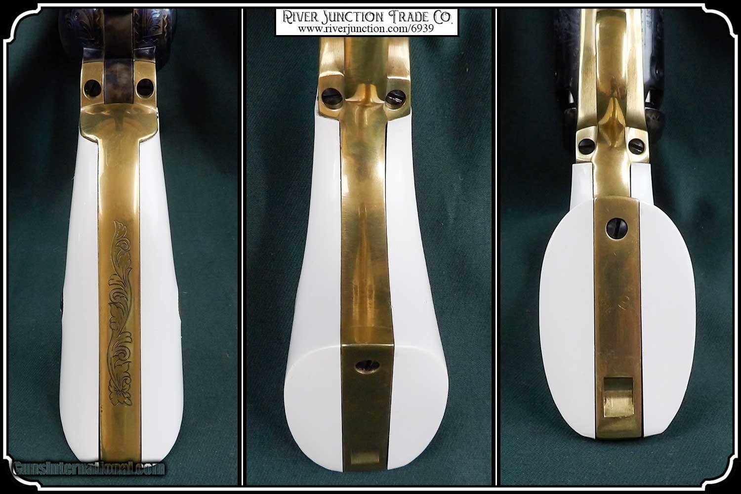 Description: A very popular revolver for its time, the model 1851 Navy revolver was adopted by both the U.S. and British military. This revolver received its name from the depiction on the cylinder of the Texas Navy's victory over the Mexican fleet in 1843. These 1851 Navy Deluxe Engraved Black Powder Pistols are high-quality, working reproduction pieces that abounds with incredible detail, making them a must-have, whether you’re a muzzleloader enthusiast or a historical firearms collector. These are .36 caliber, black powder pistols with detailed engraving, casehardened steel frames with a 7 1/2” blued barrels and a faux ivory grips. This pair is very much like the revolvers Wild Bill Hickok carried. SOLD |