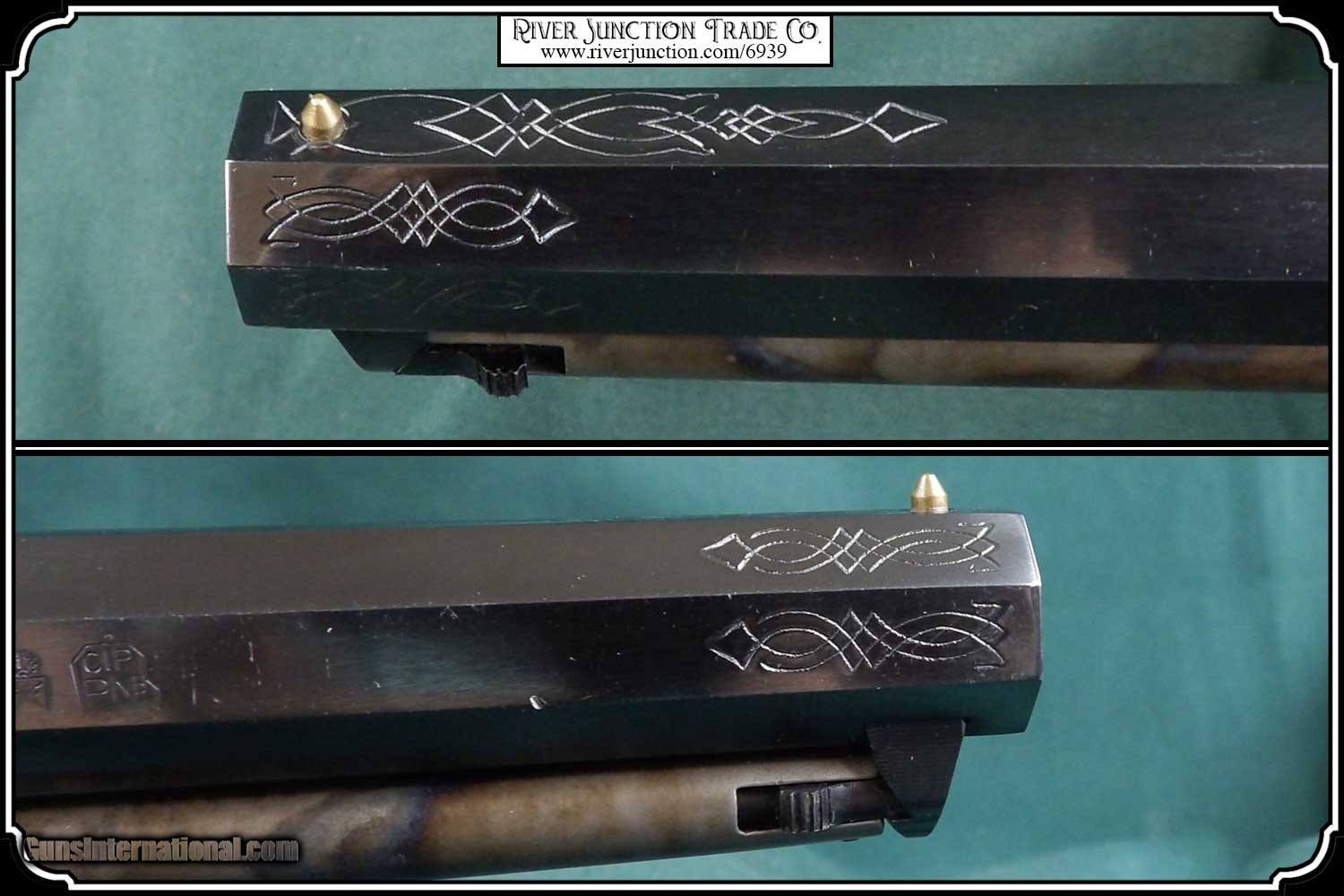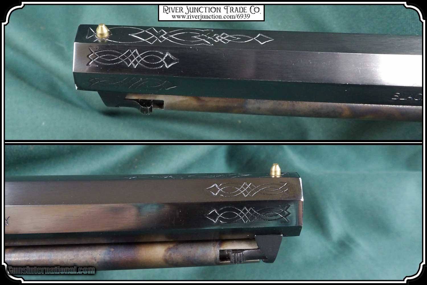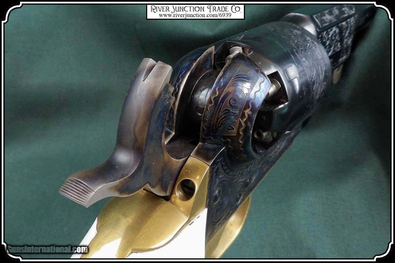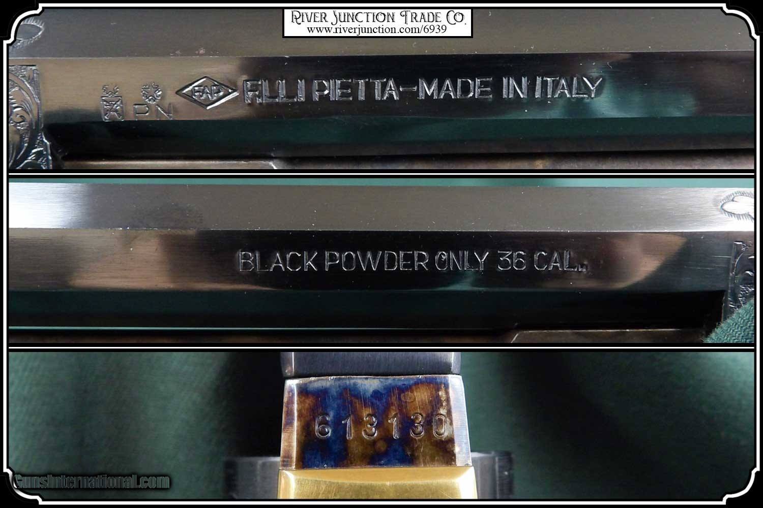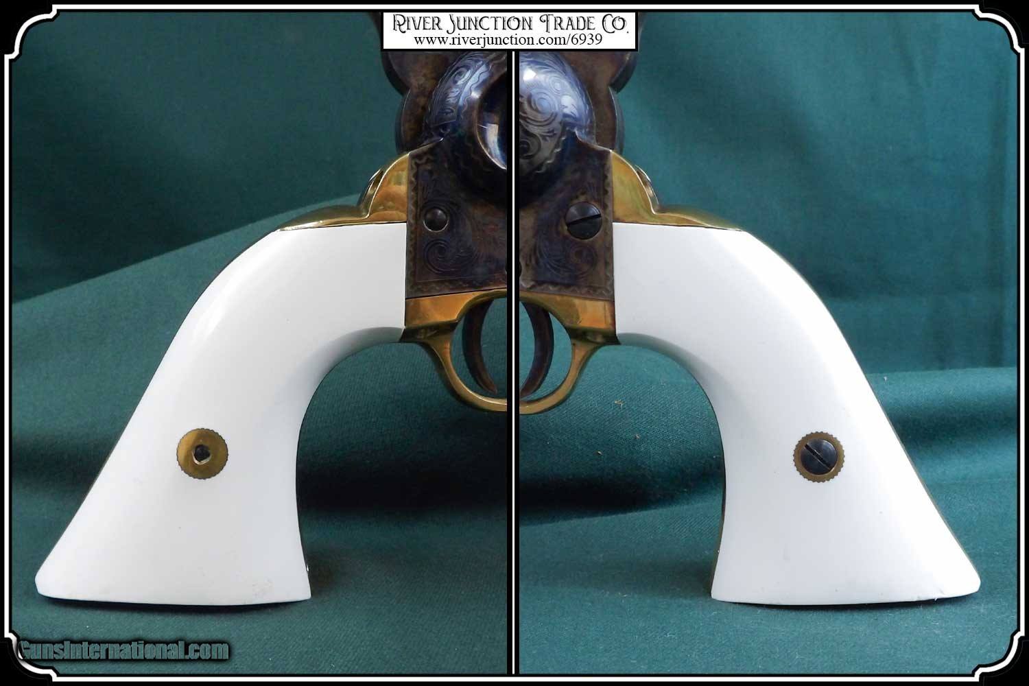 Description: A very popular revolver for its time, the model 1851 Navy revolver was adopted by both the U.S. and British military. This revolver received its name from the depiction on the cylinder of the Texas Navy's victory over the Mexican fleet in 1843. These 1851 Navy Deluxe Engraved Black Powder Pistols are high-quality, working reproduction pieces that abounds with incredible detail, making them a must-have, whether you’re a muzzleloader enthusiast or a historical firearms collector. These are .36 caliber, black powder pistols with detailed engraving, casehardened steel frames with a 7 1/2” blued barrels and a faux ivory grips. This pair is very much like the revolvers Wild Bill Hickok carried. SOLD |
