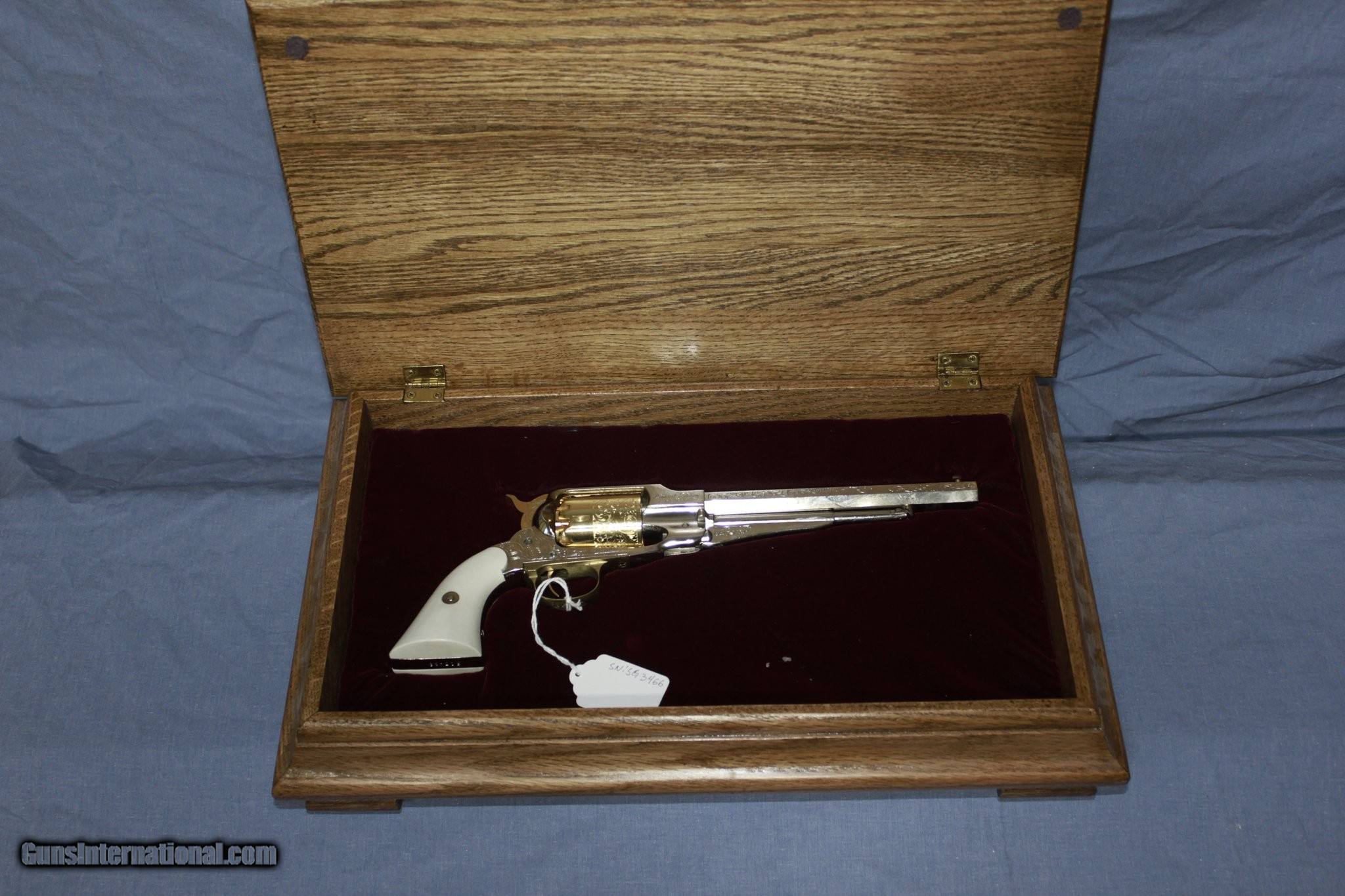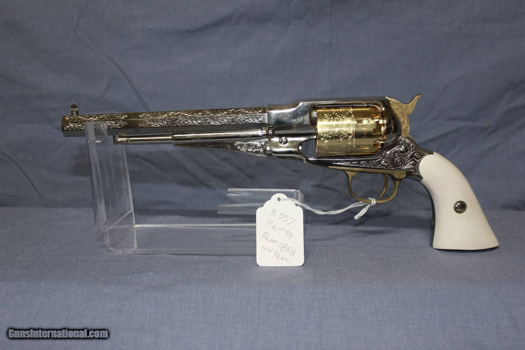 Description: Guns Listing ID: 604392 **UNFIRED** F.LLI Pietta Civil War replica Cap and Ball .44 caliber blackpowder revolver. Limited edition No. 3,488 of only 5,000 manufactured This collector‚s piece is a nickel and gold plated replica of a Remington 1858 Army model. The design was based on a display revolver given to Major General George Meade sometime after his victory at Gettysbuyrg. Manufactured in Italy by F. LLI Pietta, this is a six-shot, blackpowder .44 cap & ball revolver with an 8\" octagonal barrel, cased in a nicely crafted, lined, wooden box. Manufacturer: PIETTA Model: 1858 NEW MODEL ARMY REVOLVER Caliber Info: .44 (black powder only) Condition: Used - Non-Certified Barrels: 8" BARREL Action: REVOLVER Finish: nickel Price: $475.99 Contact Seller |