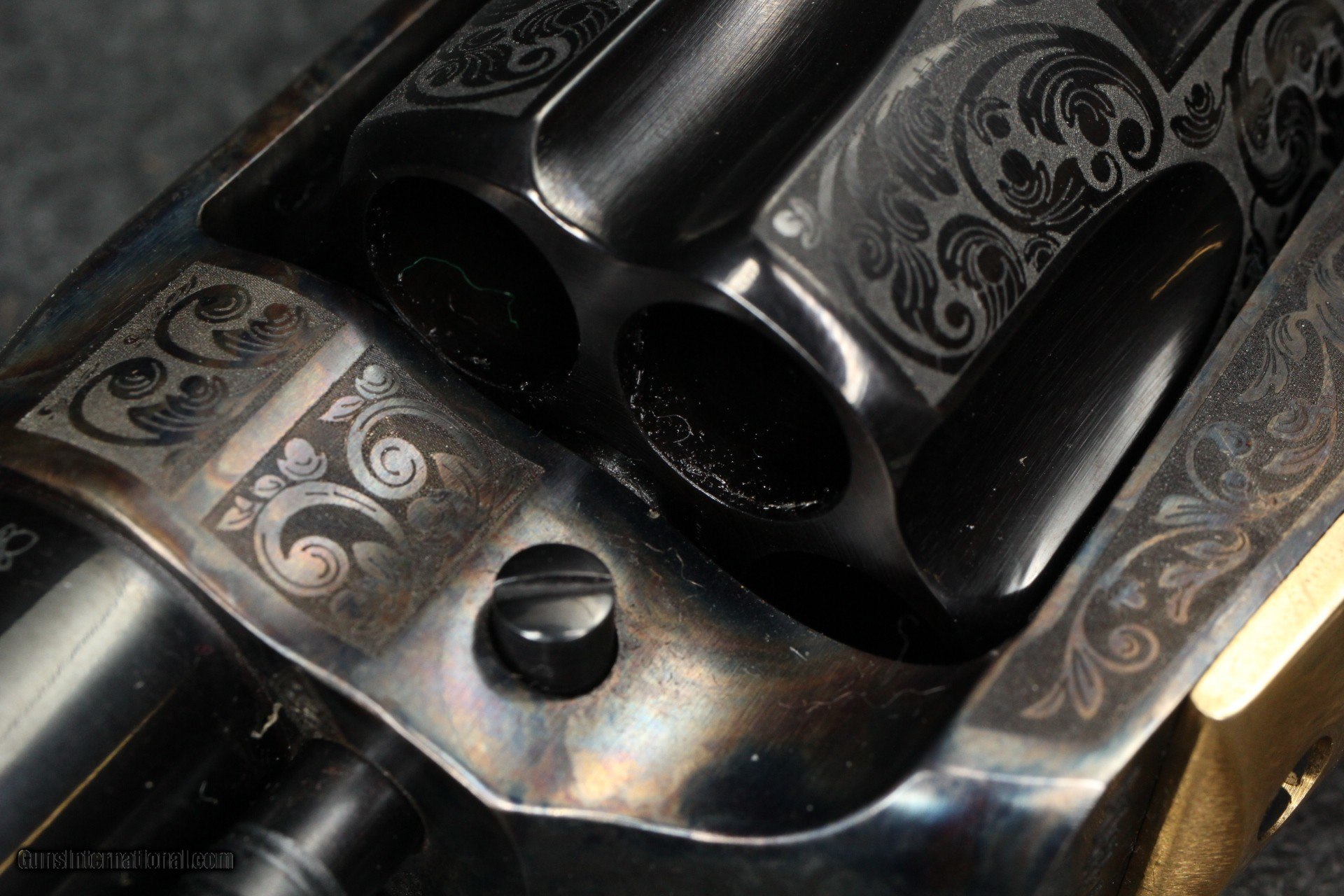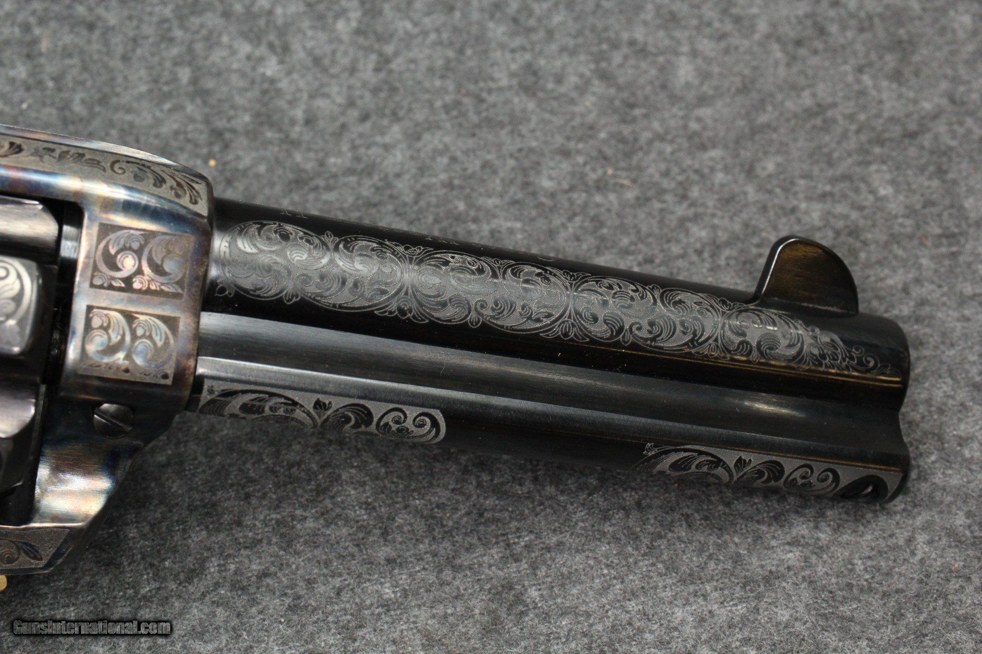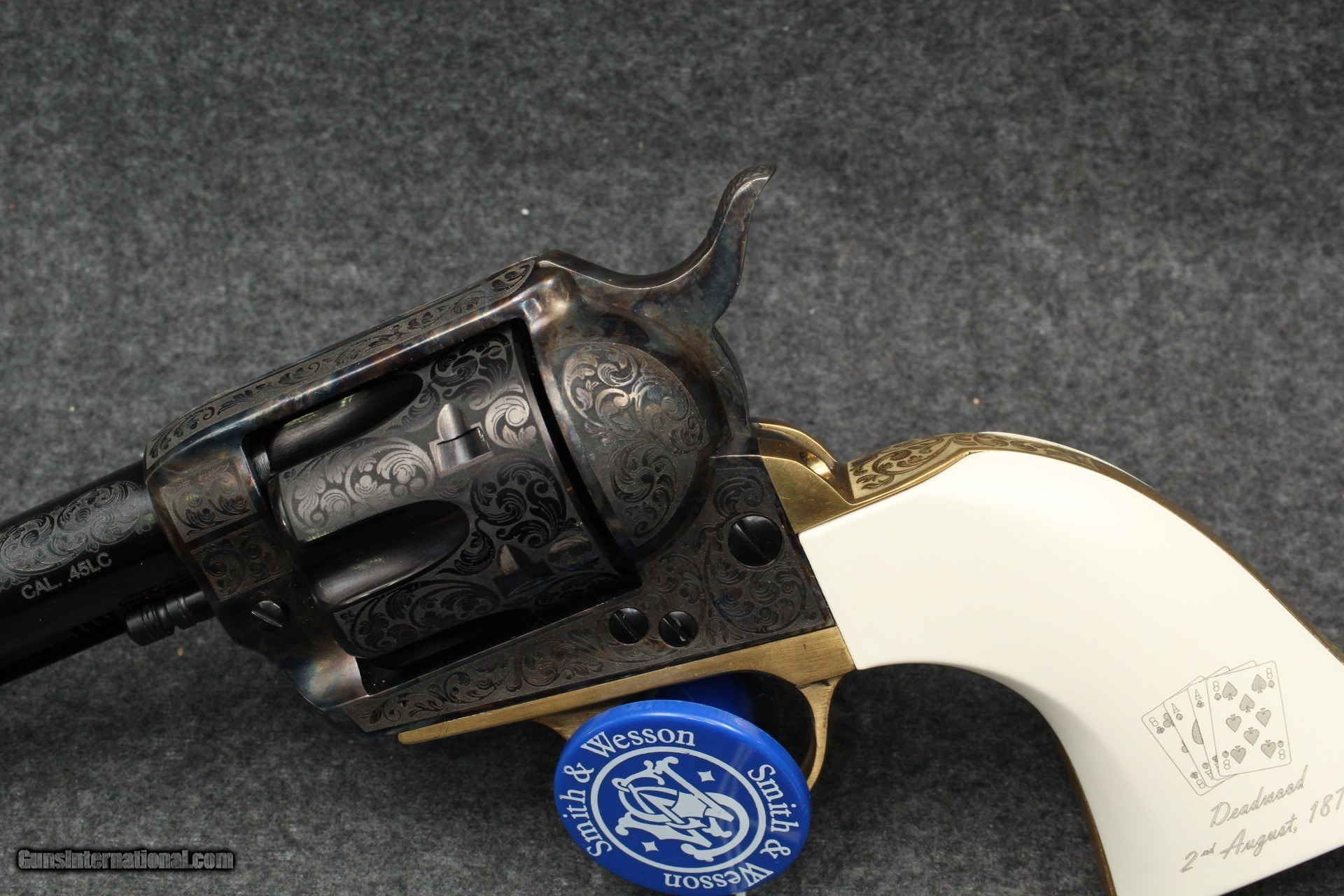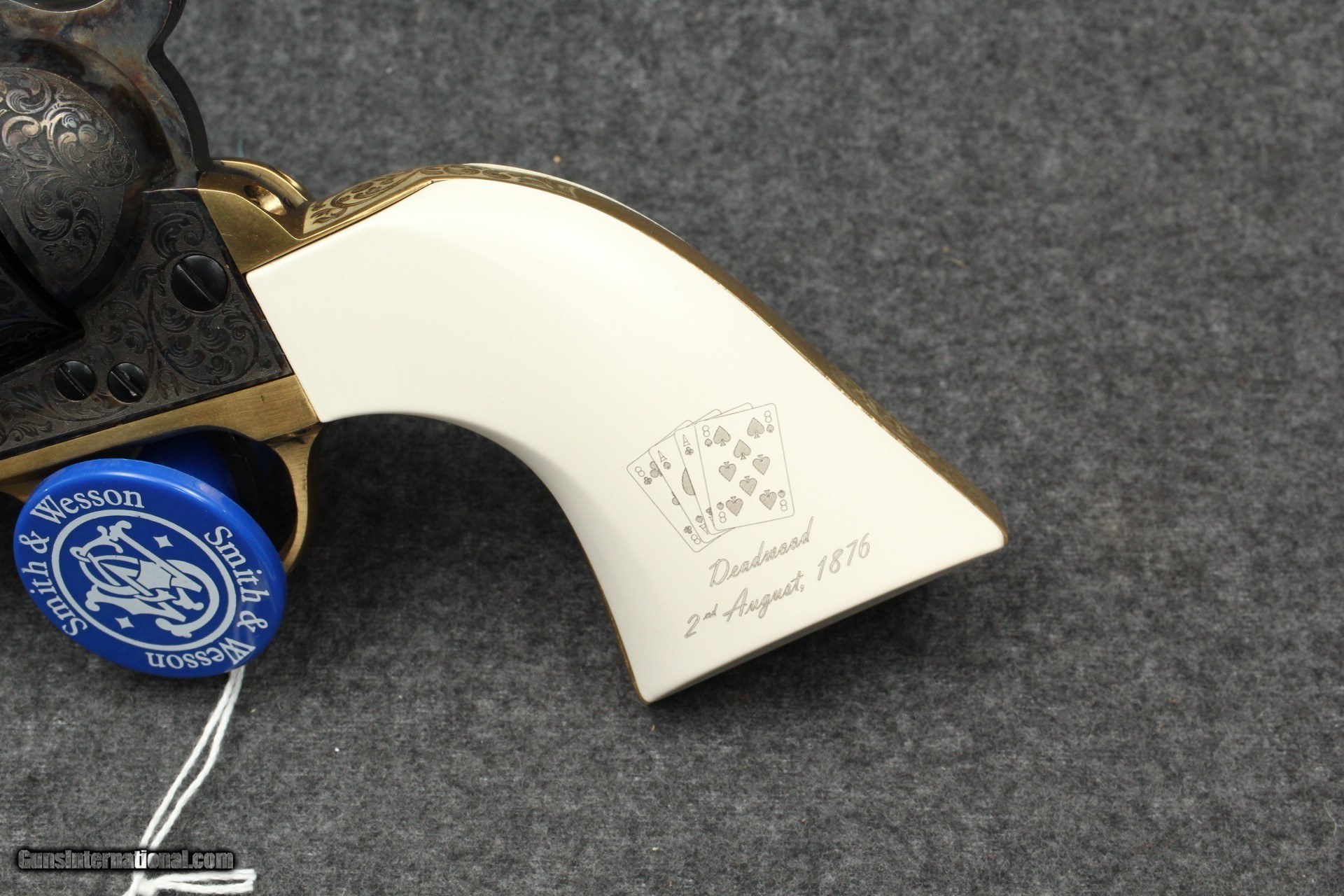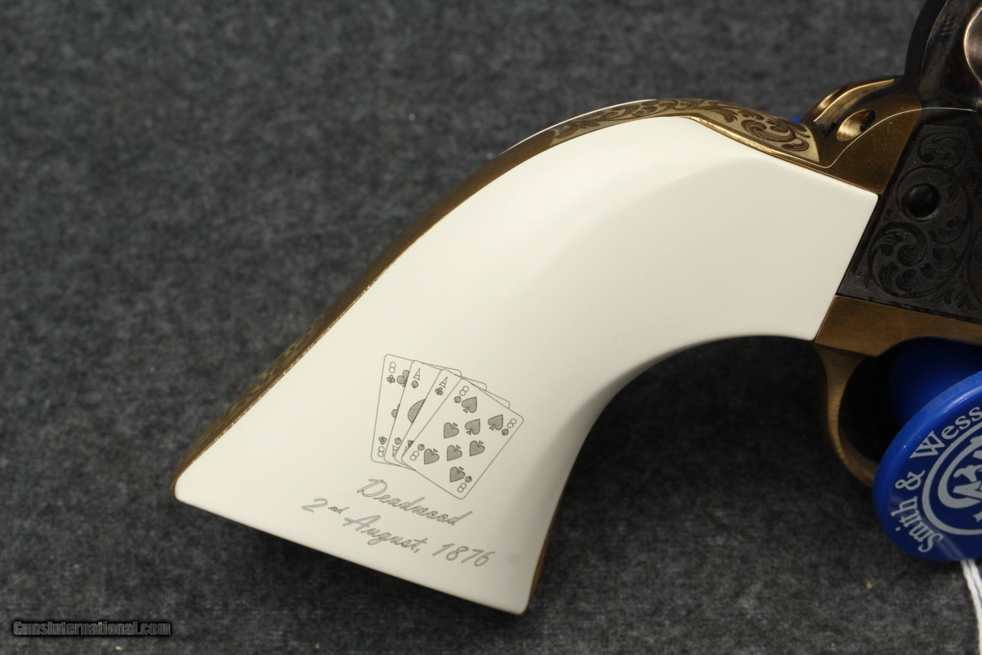 Description: Serial number E1748XX. Imported by EMF. Deadman's Hand configuration. 4 3/4" barrel, photo-engraved color case frame, photo engraved blue barrel and cylinder, and photo engraved brass backstrap. White grips with Aces and Eights. Overall in excellent condition, possibly unfired. Bore is excellent. Comes with box. More photos on request. Please add $35.00 for shipping and insurance. SOLD Handgun Caliber: .45 Colt |