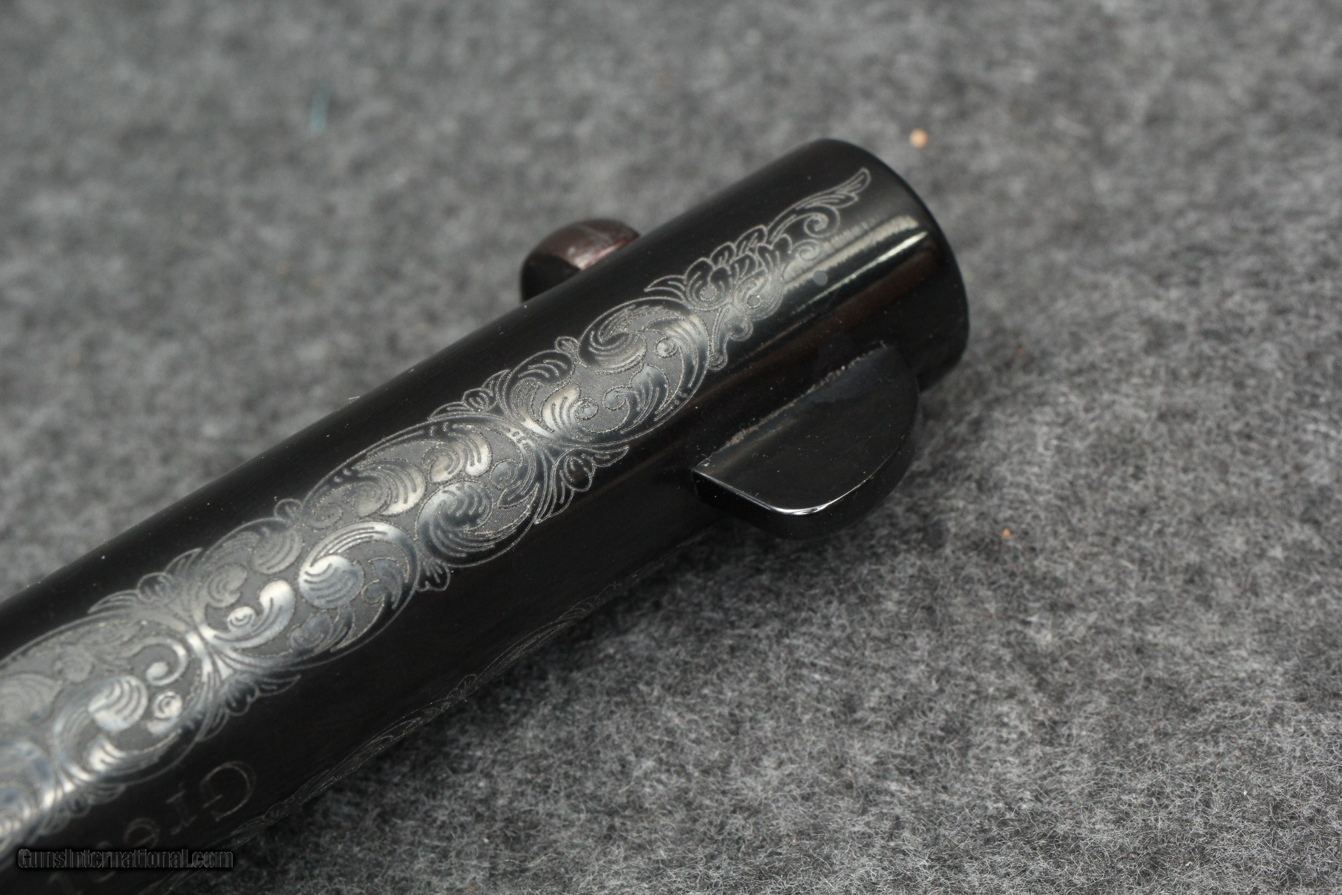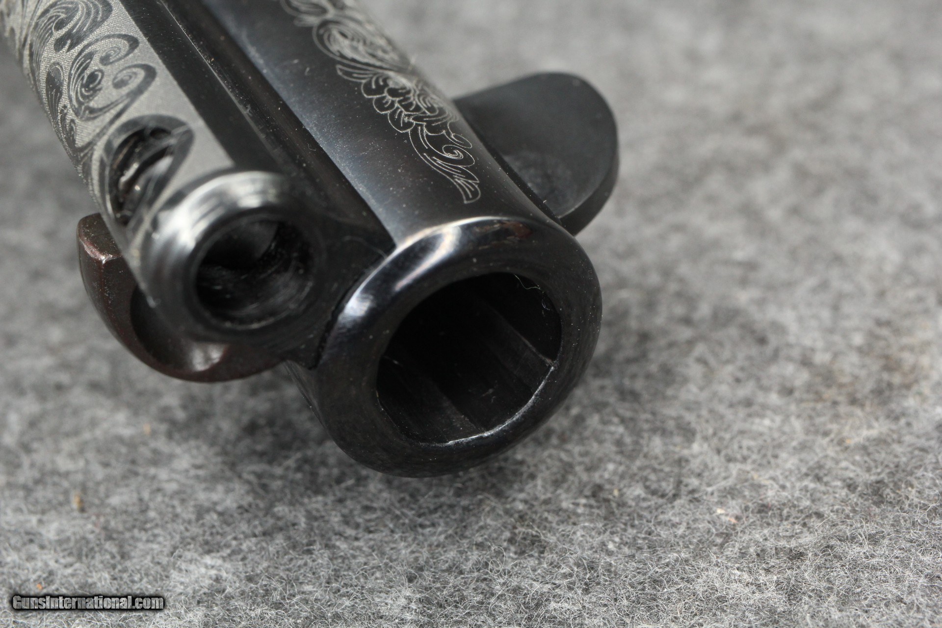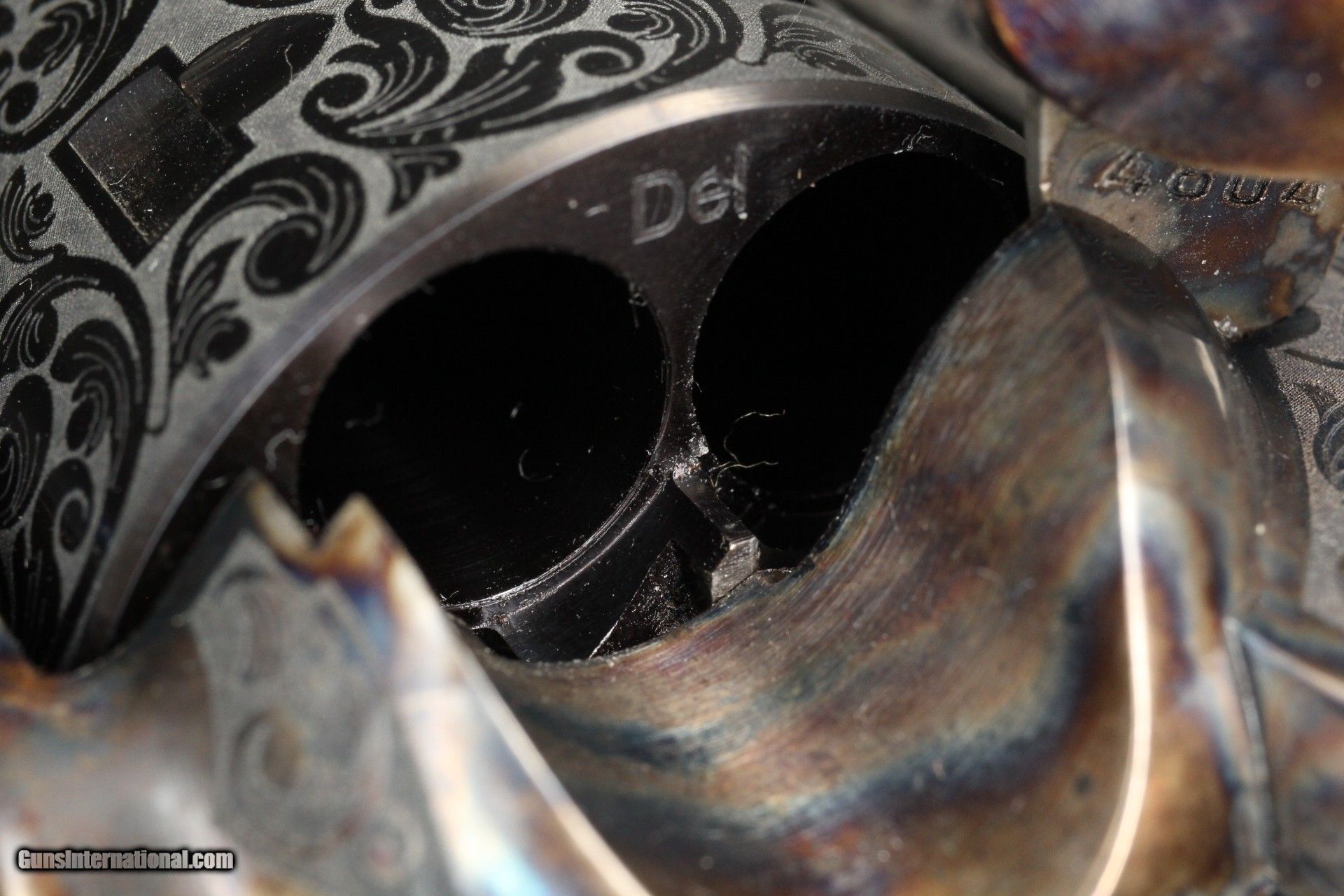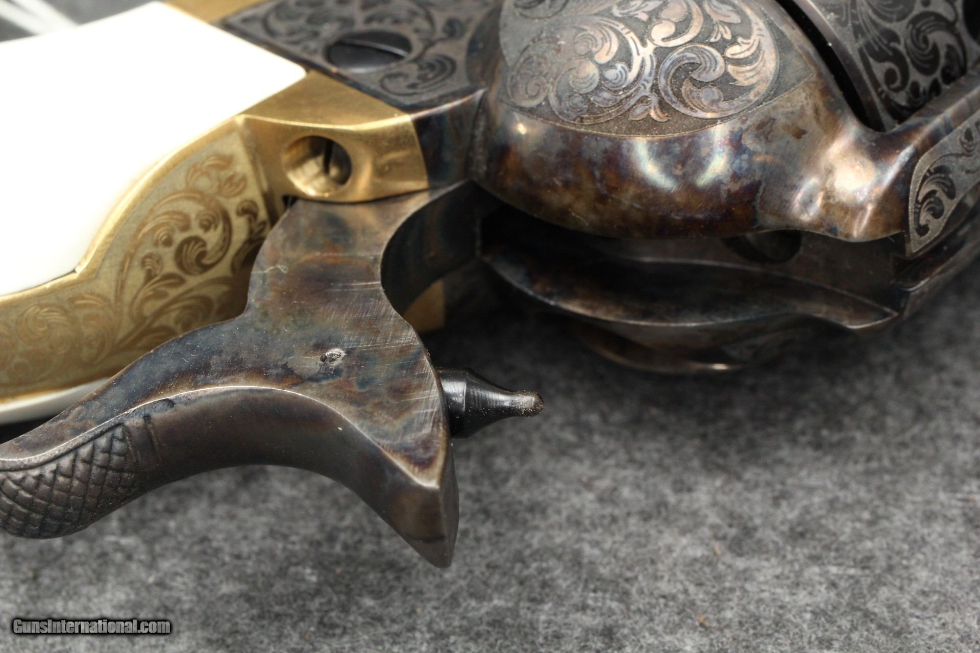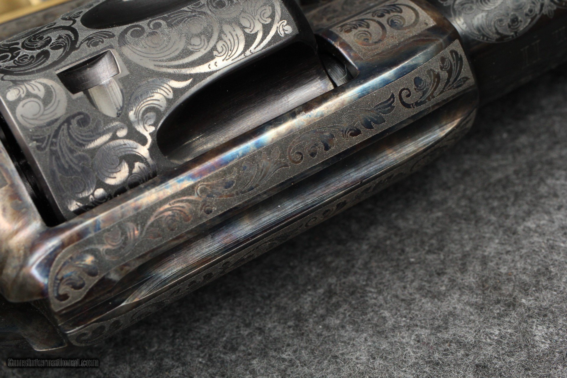Description: Serial number E1748XX. Imported by EMF. Deadman's Hand configuration. 4 3/4" barrel, photo-engraved color case frame, photo engraved blue barrel and cylinder, and photo engraved brass backstrap. White grips with Aces and Eights. Overall in excellent condition, possibly unfired. Bore is excellent. Comes with box. More photos on request. Please add $35.00 for shipping and insurance. SOLD Handgun Caliber: .45 Colt |