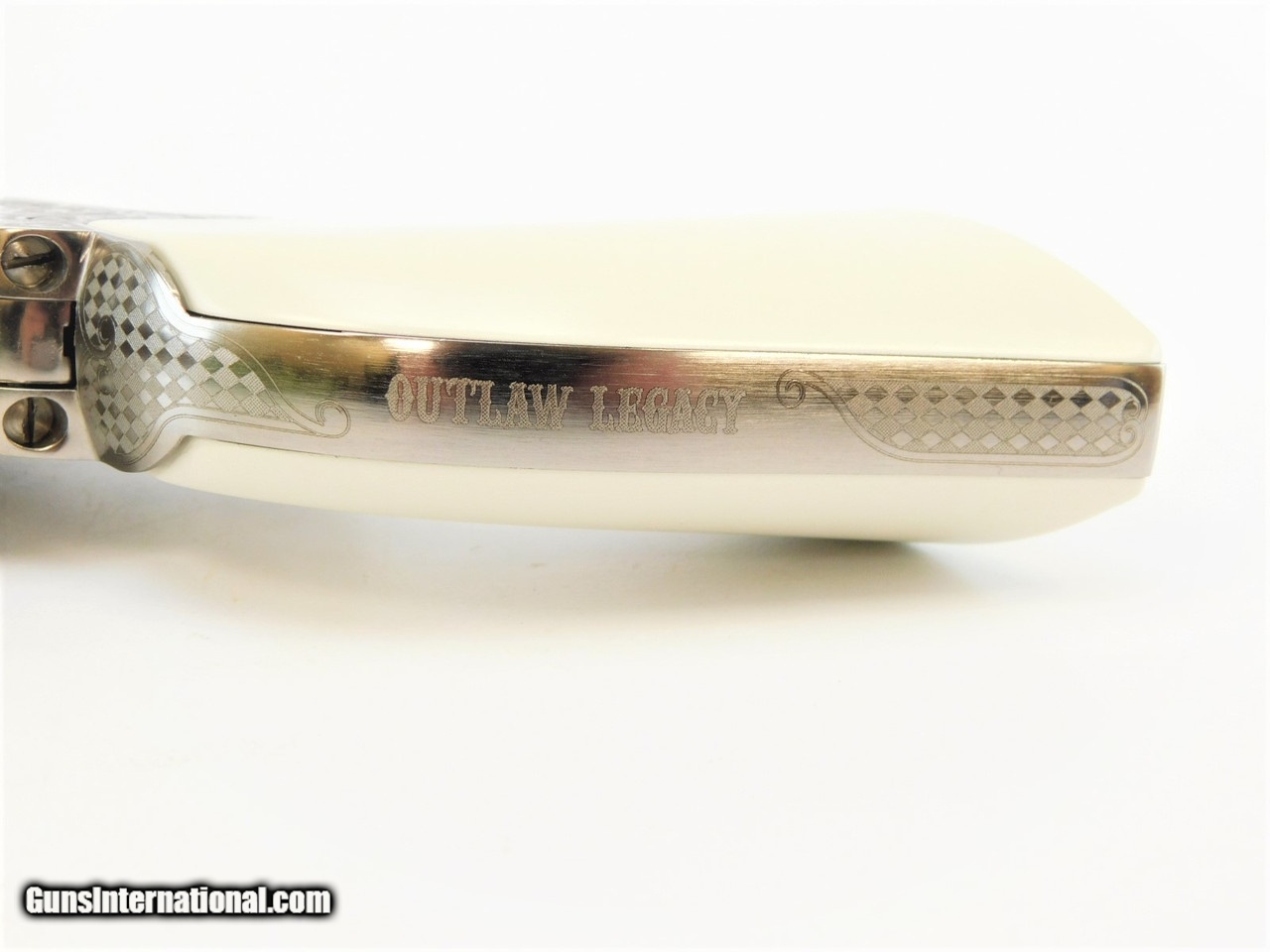 Description: Manufacturer: Taylor's & Co. / Pietta Model: Outlaw Legacy SKU: 200068 Caliber: .45 Colt Capacity: 6 Rounds Barrel Length: 7.5" Finish: Nickel Engraved Weight: 2.51 lbs Grip: Ivory Polymer OAL: 13.10" Sights: Fixed Front Blade, Rear Frame Notch All items are factory new in box unless otherwise stated. Based on the information available to us, the above specifications describe this item to the best of our knowledge. For further information, please contact or visit the manufacturer's . SOLD |