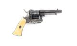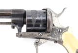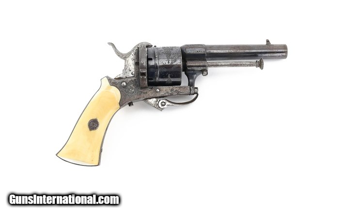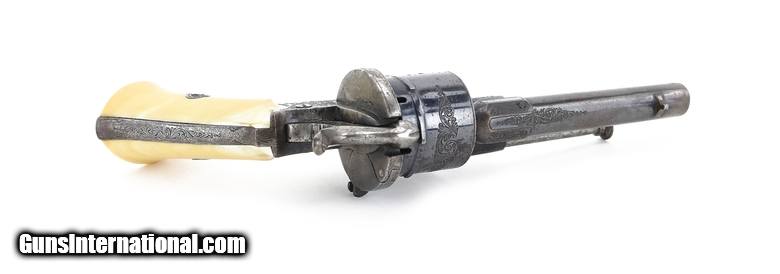 French Pinfire 8mm caliber revolver. Beautifully engraved. Barrel and cylinder have 97% high polish original blue. Beautiful mellow grips have no damage. Action works perfectly. Barrel length is 3 ½”.
