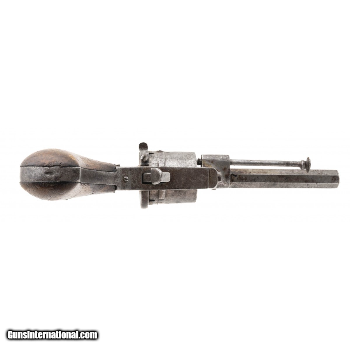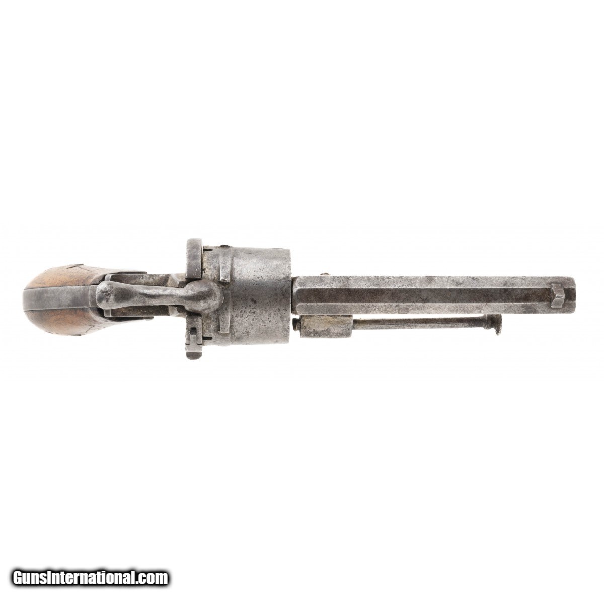 NSN, circa 1860s, 8mm pin-fire, 3 3/8"" octagonal barrel. Metal is a grey patina with scattered surface oxidation visible. Bore has pitting visible throughout. Wooden two piece grips have initials carved in on both sides. Action functions correctly. Consignment.
