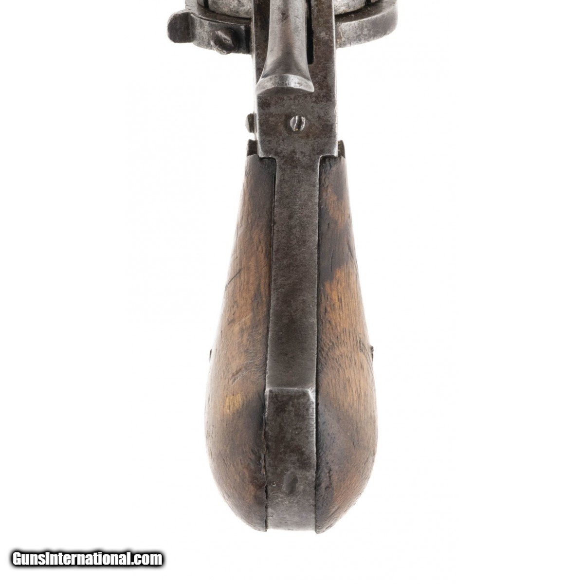Description: " NSN, circa 1860s, 8mm pin-fire, 3 3/8"" octagonal barrel. Metal is a grey patina with scattered surface oxidation visible. Bore has pitting visible throughout. Wooden two piece grips have initials carved in on both sides. Action functions correctly. Consignment. SOLD Antique: Yes |